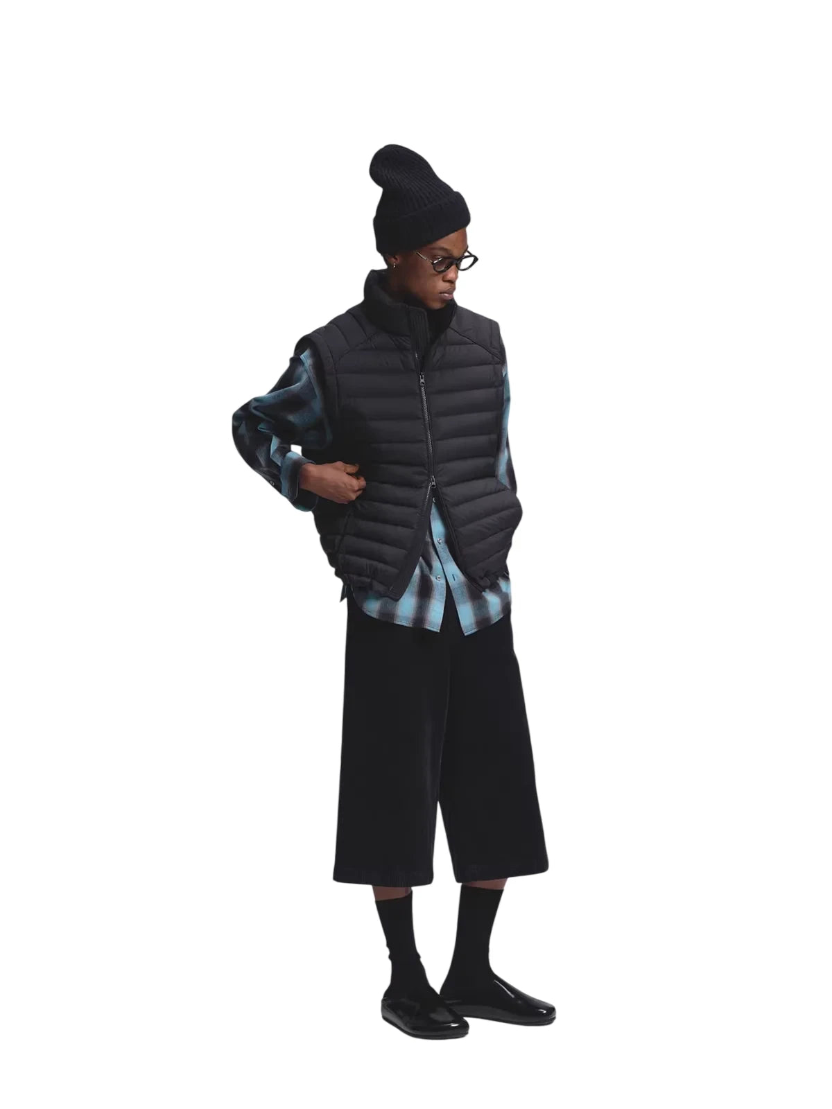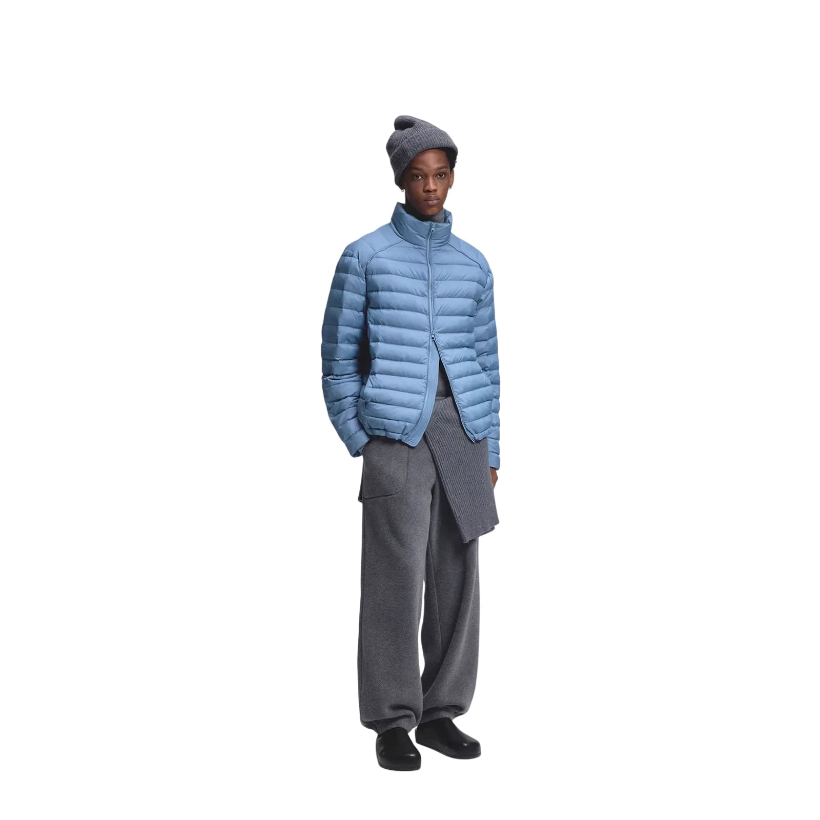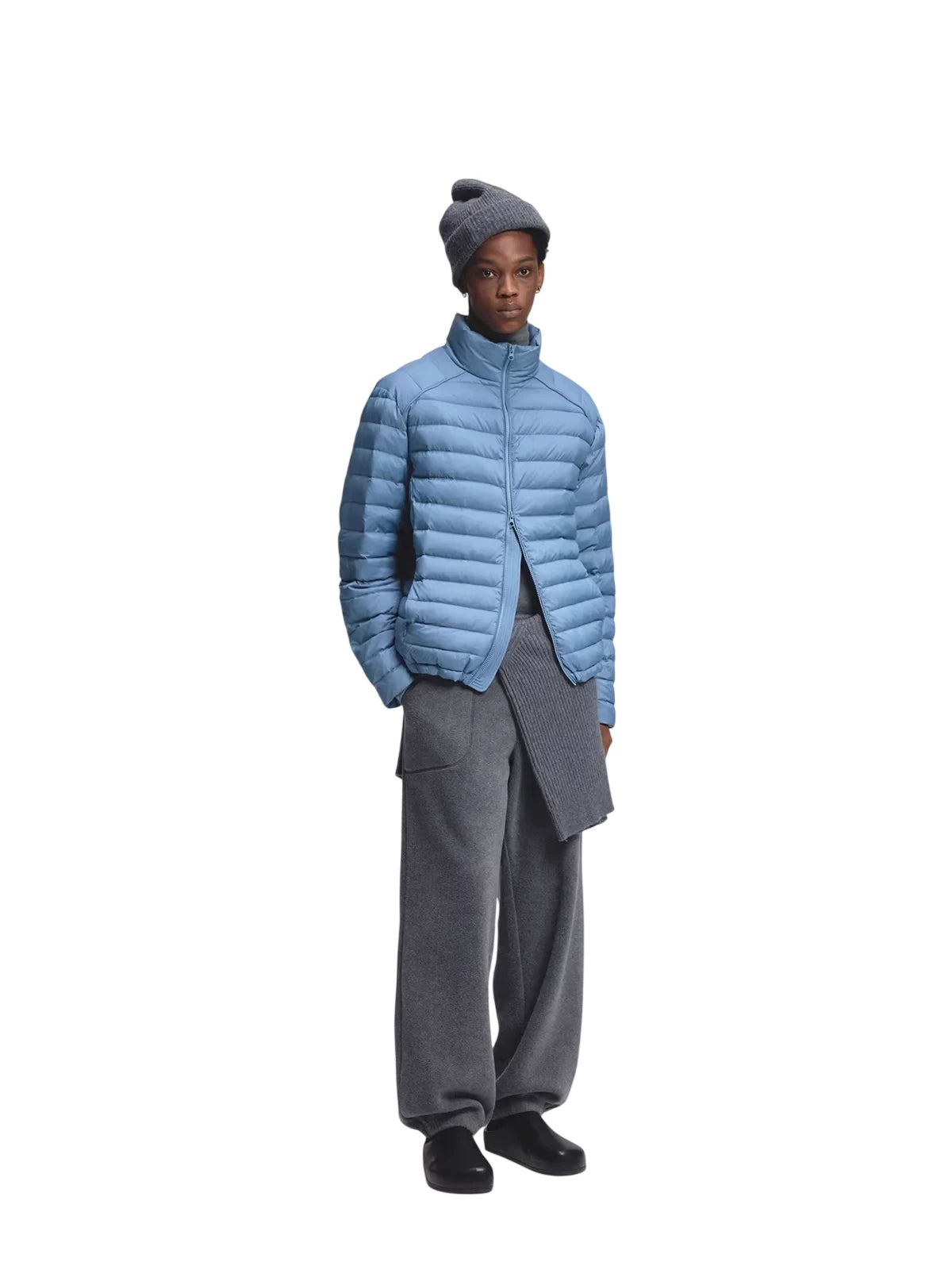 This men's lightweight short puffer jacket vest features premium white duck down insulation for superior warmth and comfort. Designed with a crinkled texture and ribbed detailing, it adds a modern and dynamic touch to your winter wardrobe. The high-collar style ensures extra protection against cold weather, making it ideal for layered looks. Perfect for the stylish man seeking functionality with a contemporary edge.
