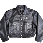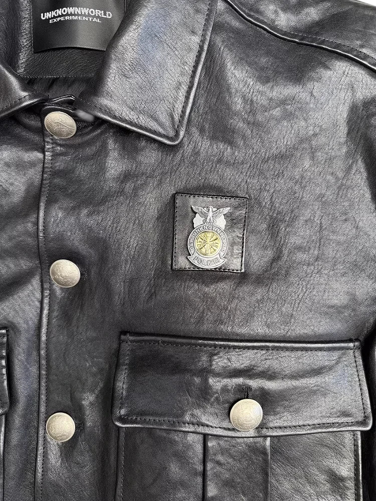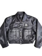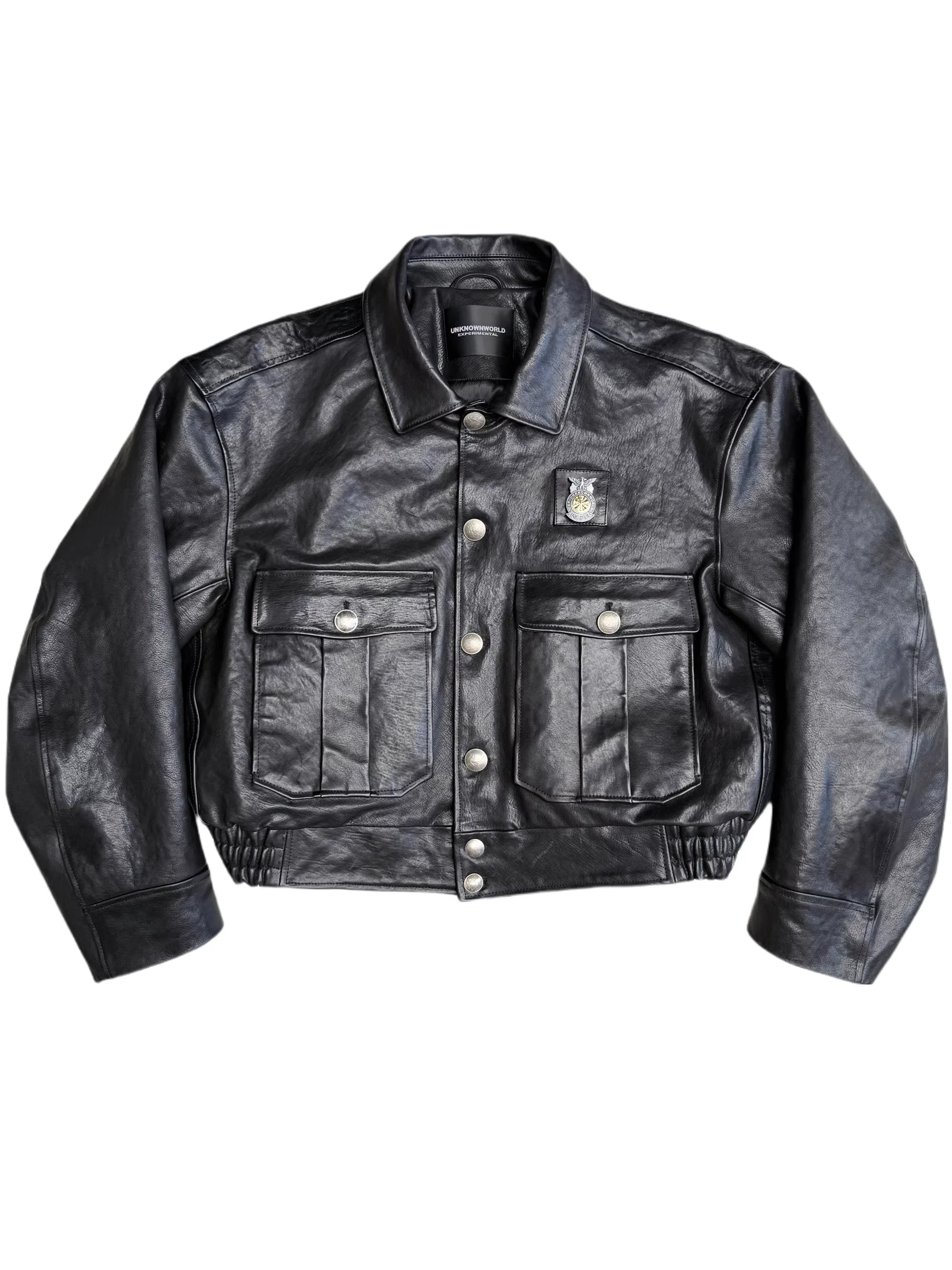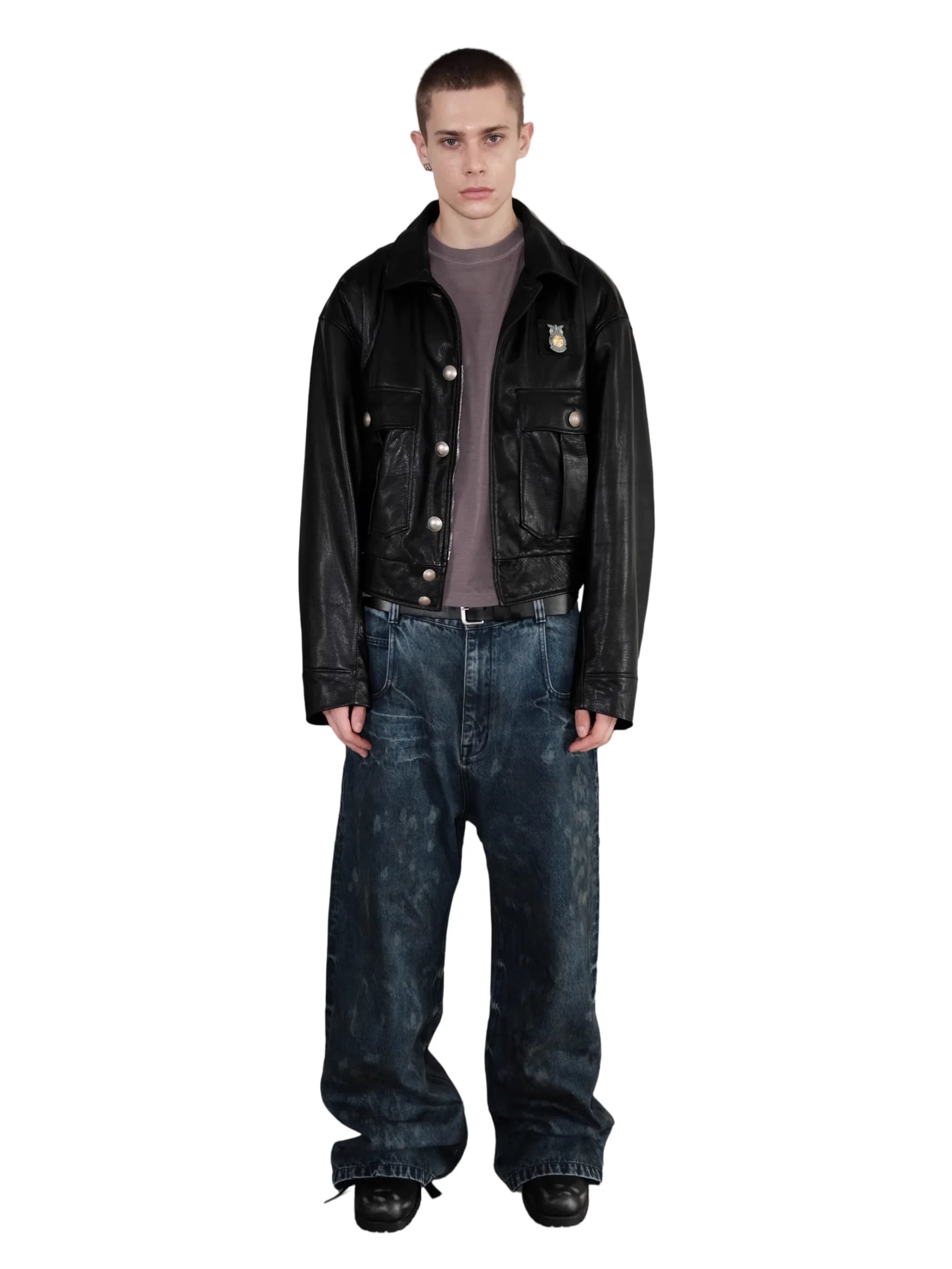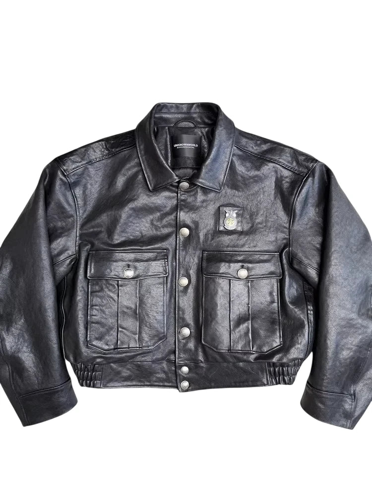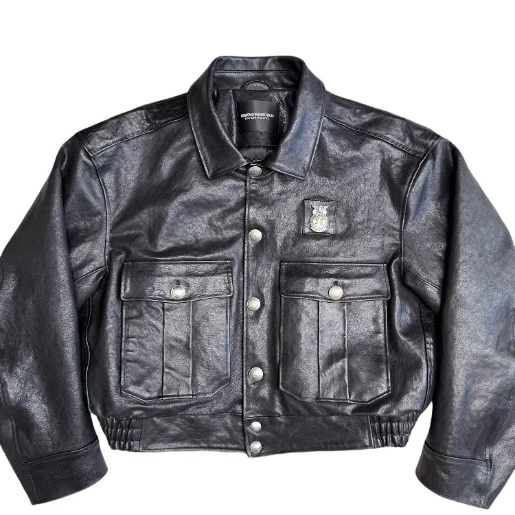 This men's leather jacket showcases a bold avant-garde design, crafted from premium vegetable-tanned horsehide. Its short and wide silhouette offers a modern appeal, complemented by a shirt-style collar and a front snap button closure for easy wear. The jacket features two large flap pockets with pleated detailing and secure snap buttons for added functionality and style.