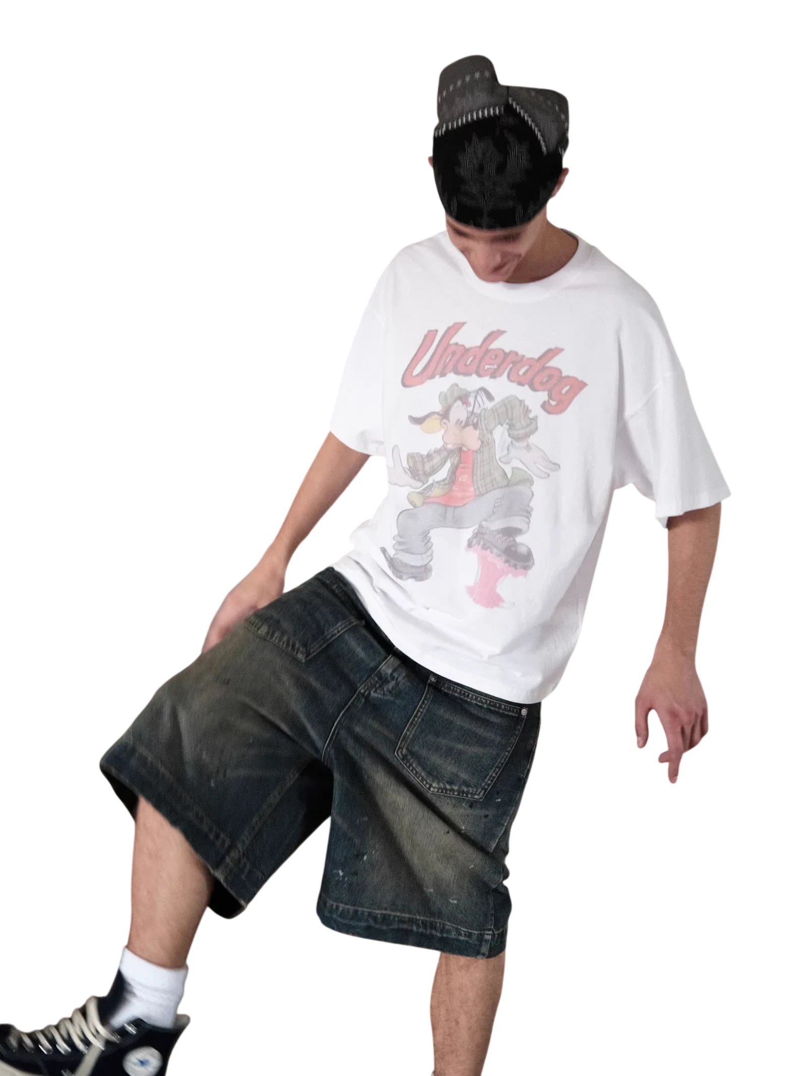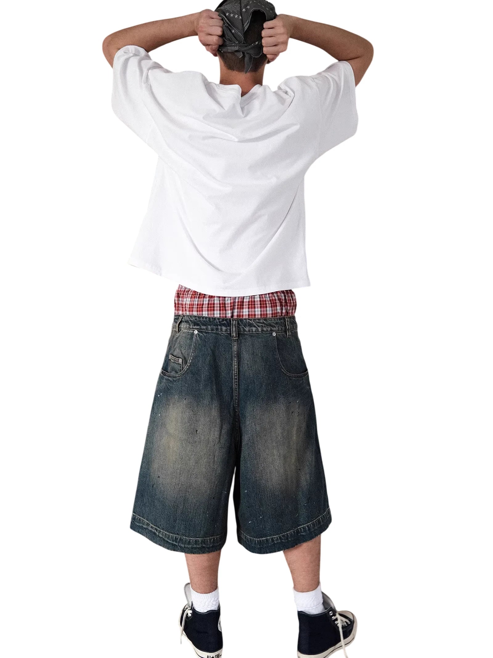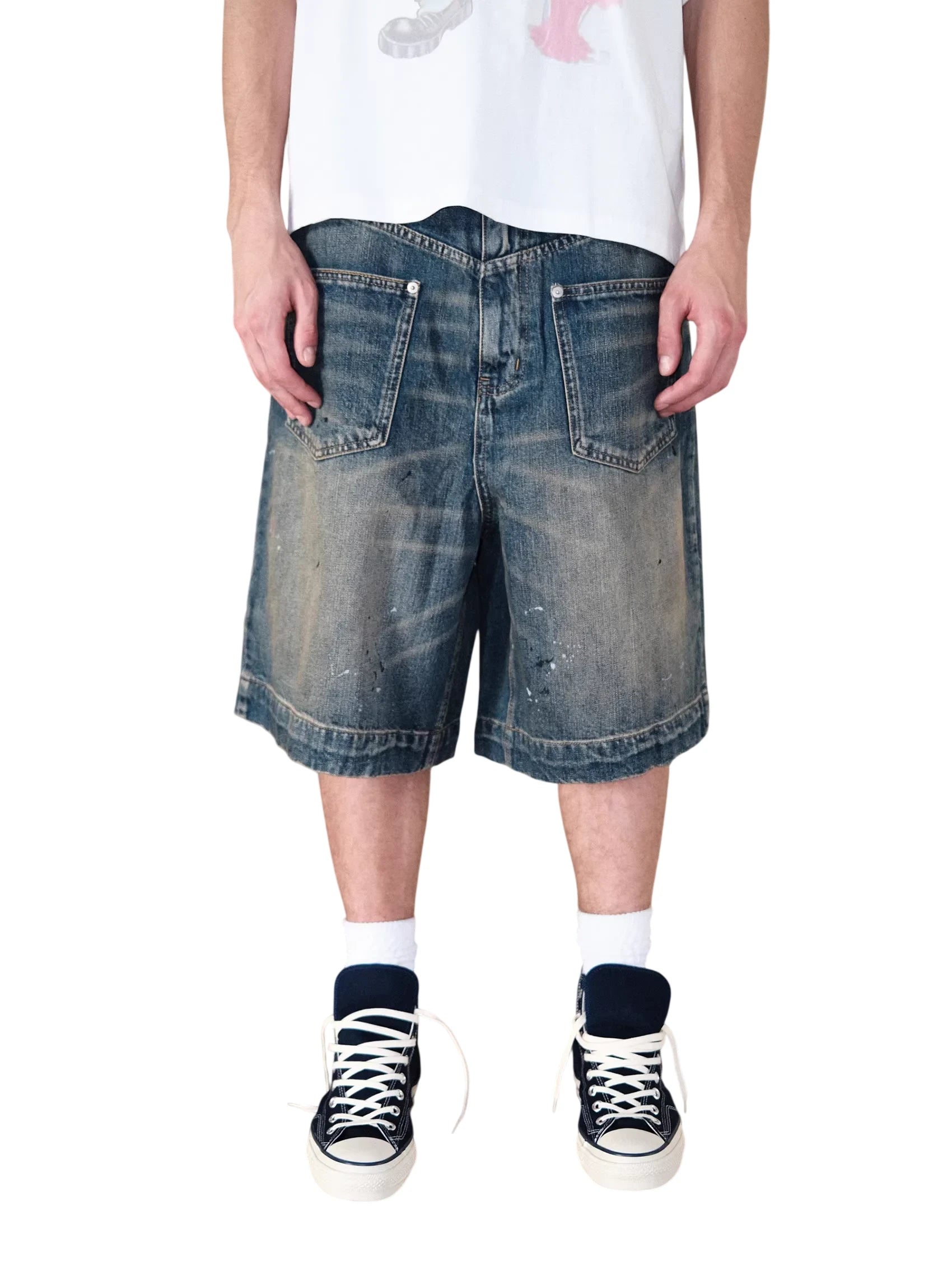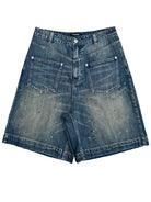 These men's denim shorts feature a relaxed, vintage-inspired design with a casual, distressed finish. Crafted in a classic blue wash, they include subtle fading, minor abrasions, and speckled paint details for a rugged, worn-in aesthetic. Designed with front patch pockets accented by metal rivets, a traditional zip fly with button closure, and sturdy belt loops, these shorts are both functional and stylish. The 6-inch inseam and wide leg openings offer a comfortable, loose fit that ends above the knee, perfect for everyday casual wear.