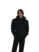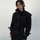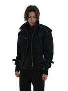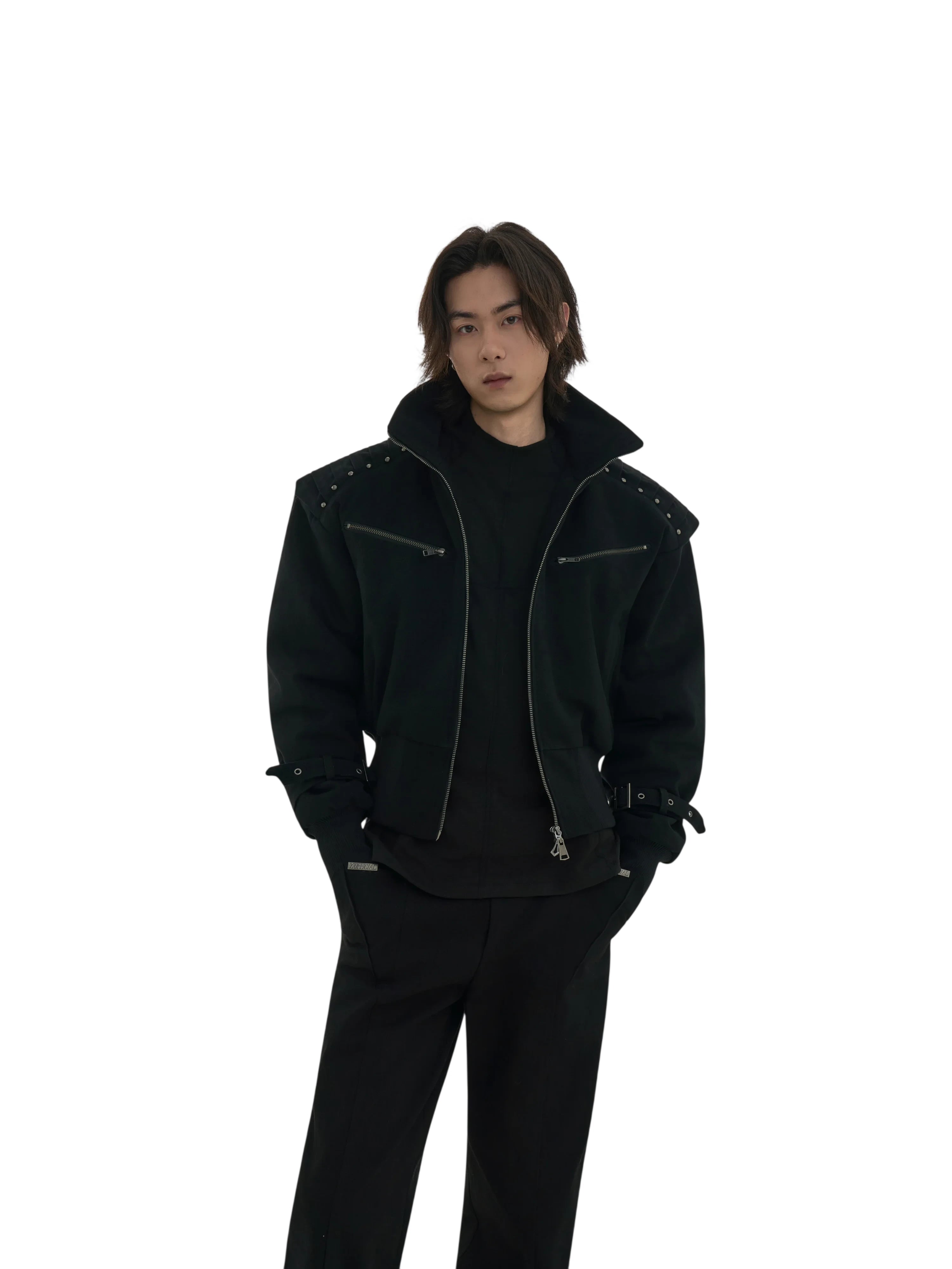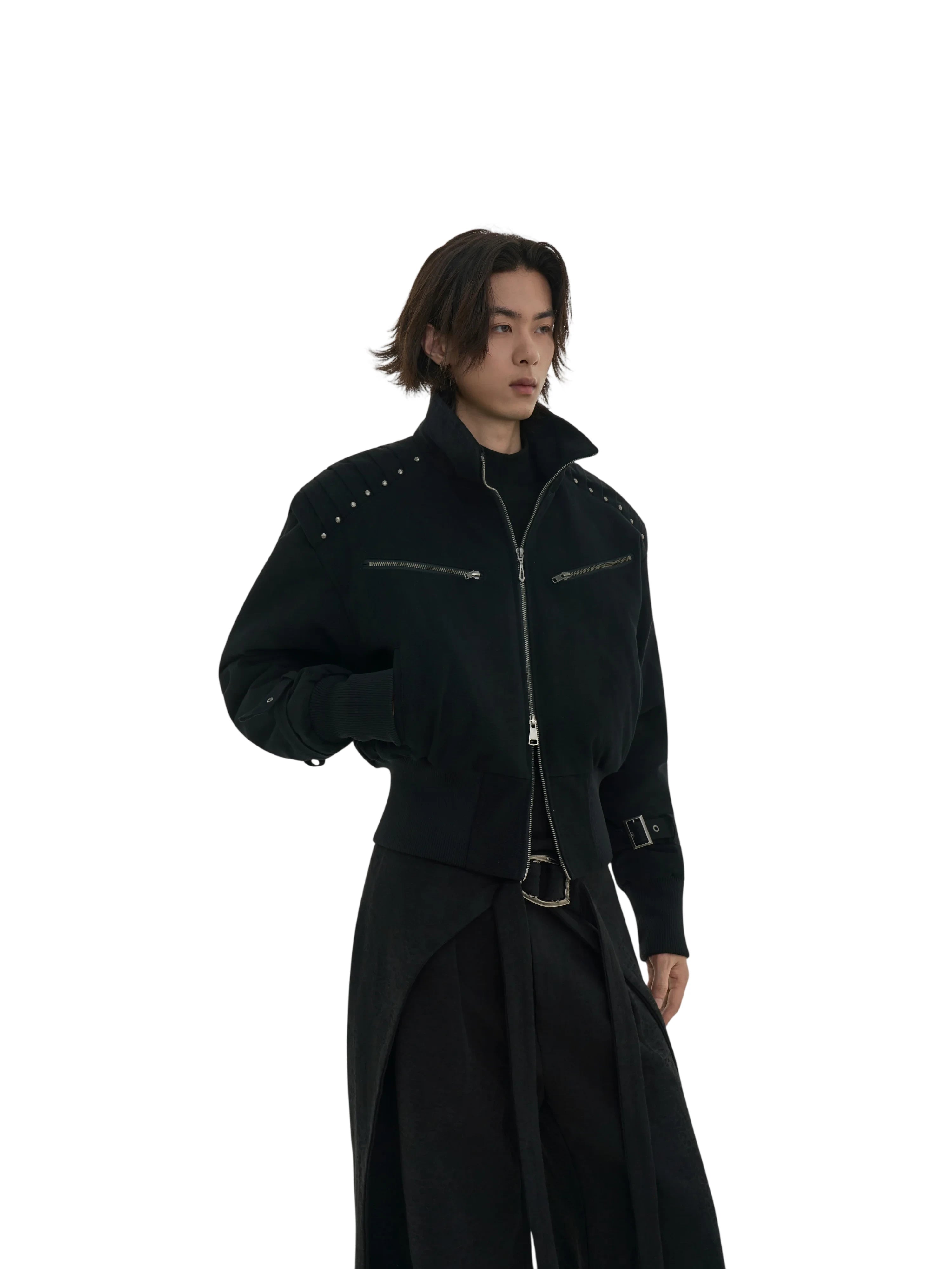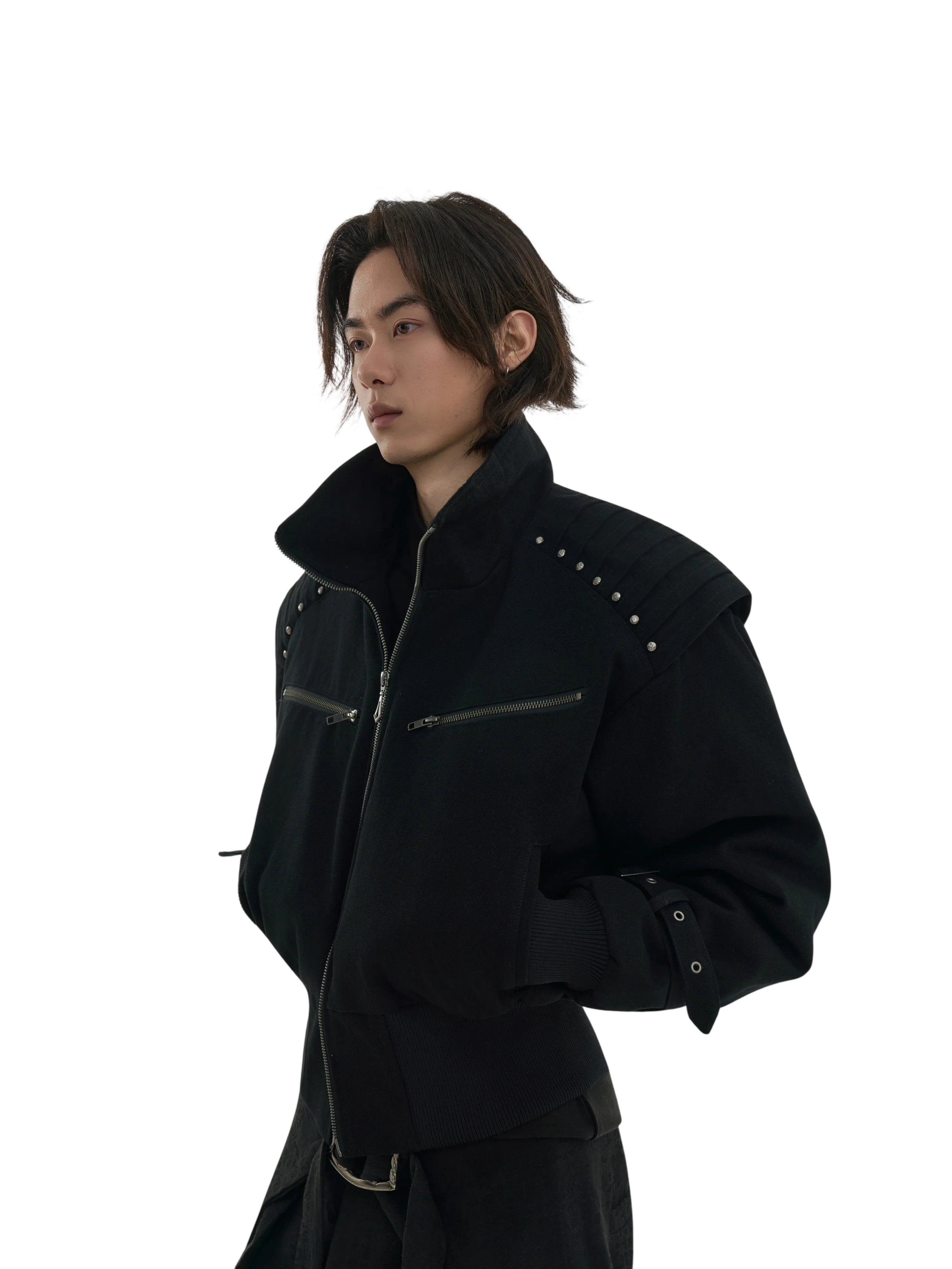 This men's black bomber jacket blends modern utility with edgy design. Crafted from comfortable cotton, the jacket features a high collar, padded shoulders for a structured silhouette, and horizontal zippered chest pockets. The design is elevated with metal stud detailing across the shoulders and adjustable strap accents near the cuffs. Ribbed textures on the lower half ensure a snug fit while maintaining a loose overall cut. Perfect for a sleek, monochrome look.