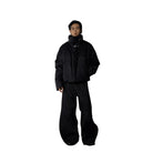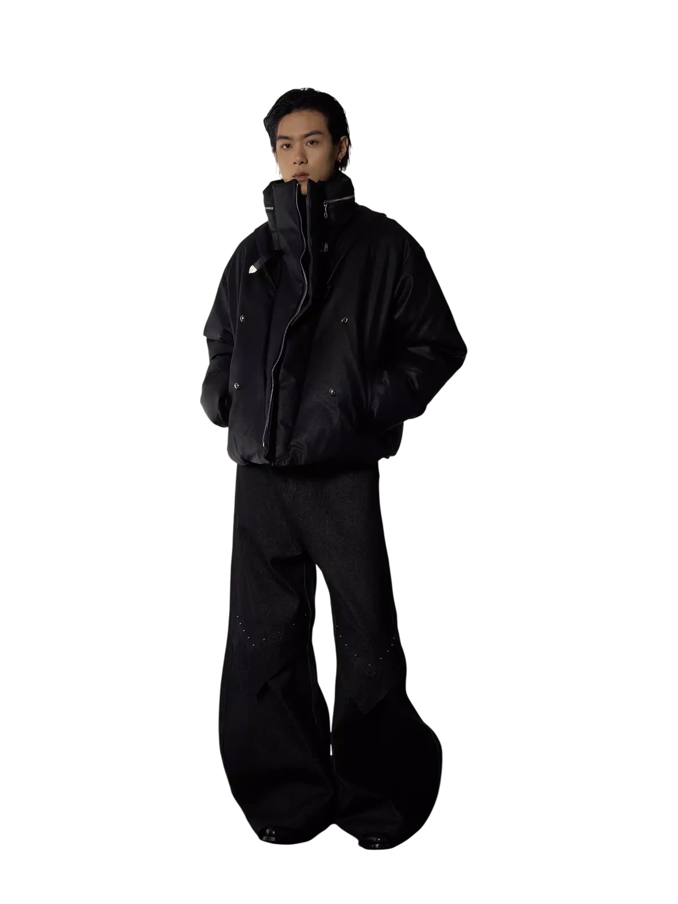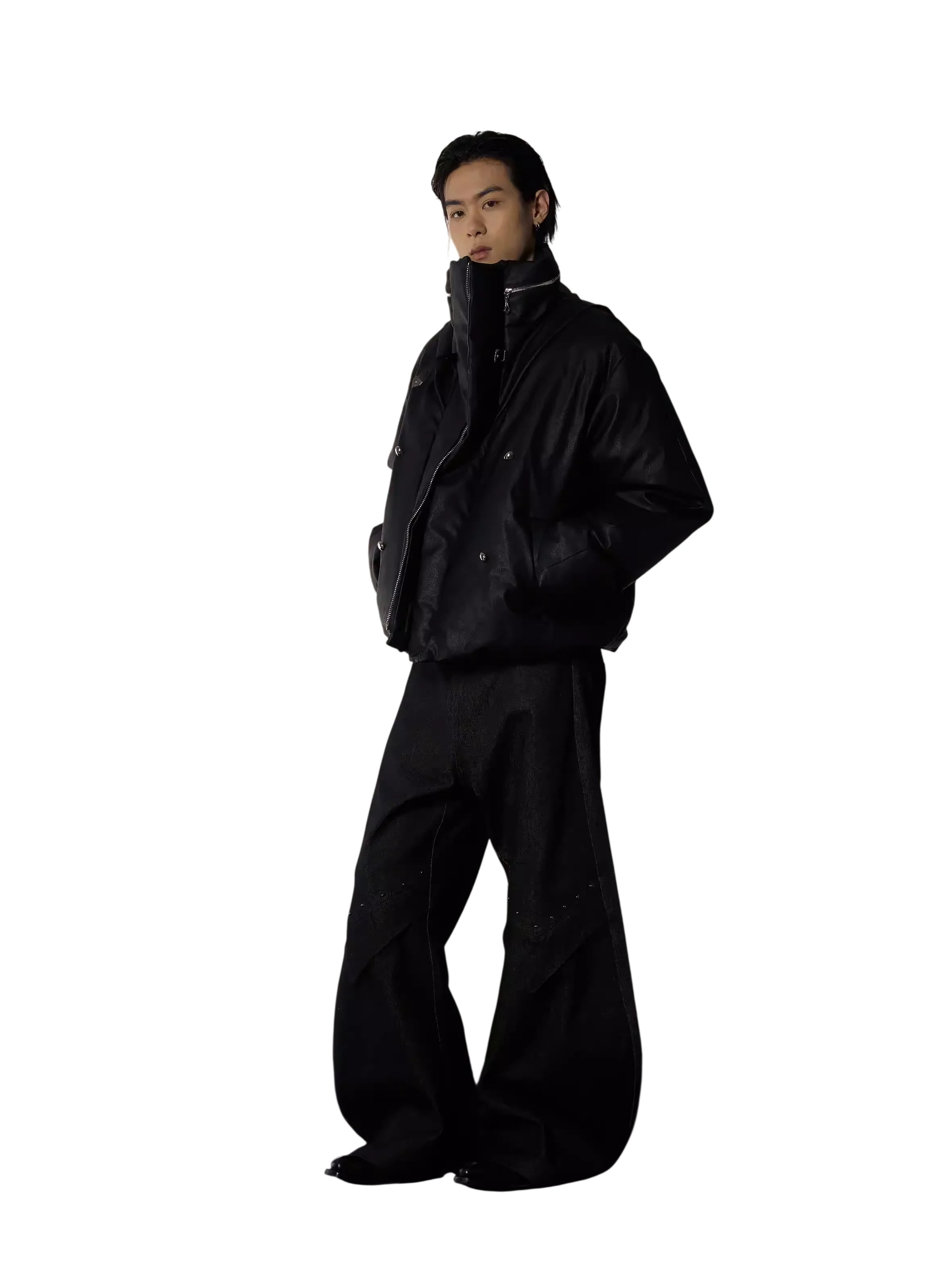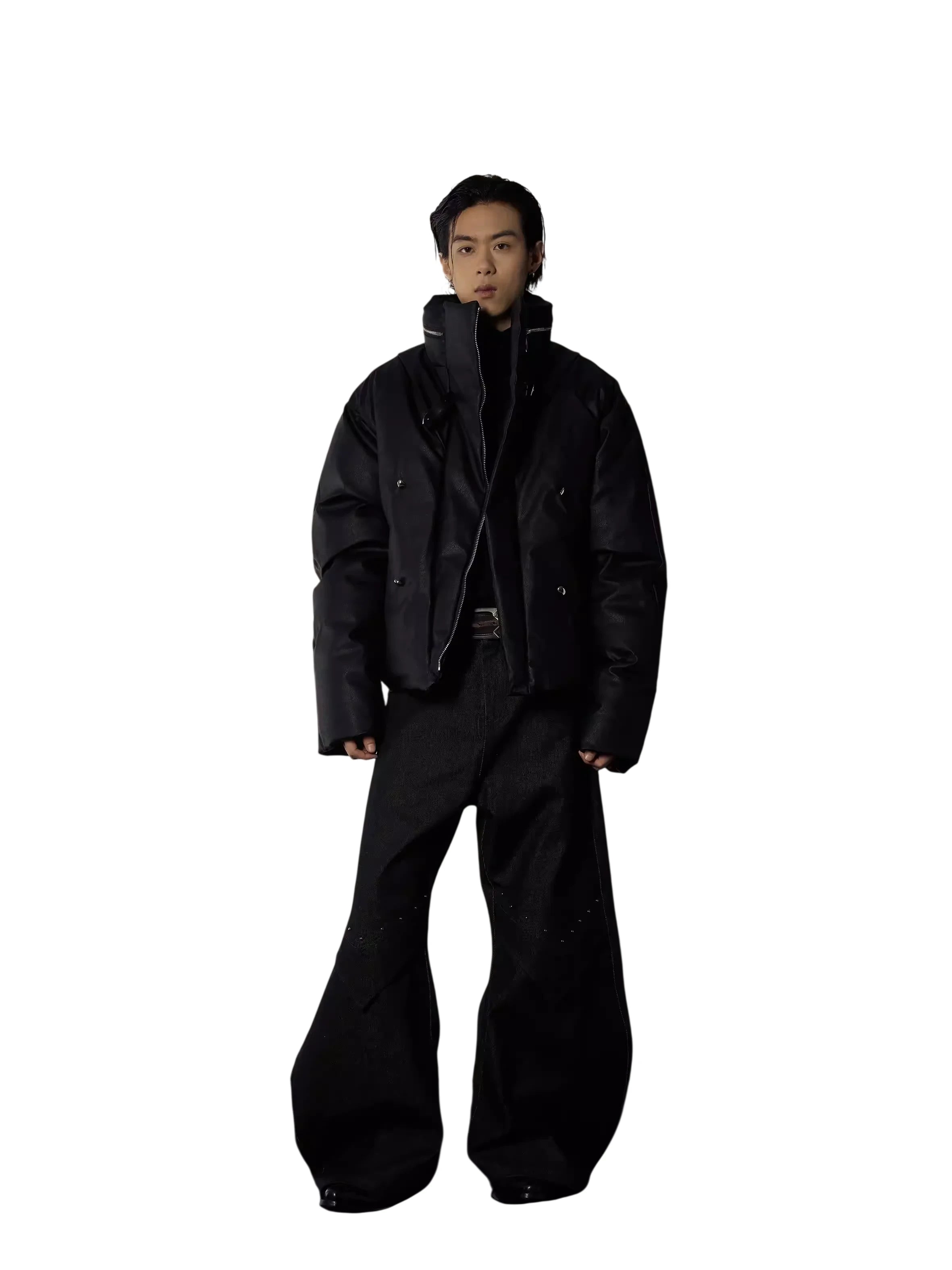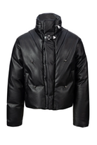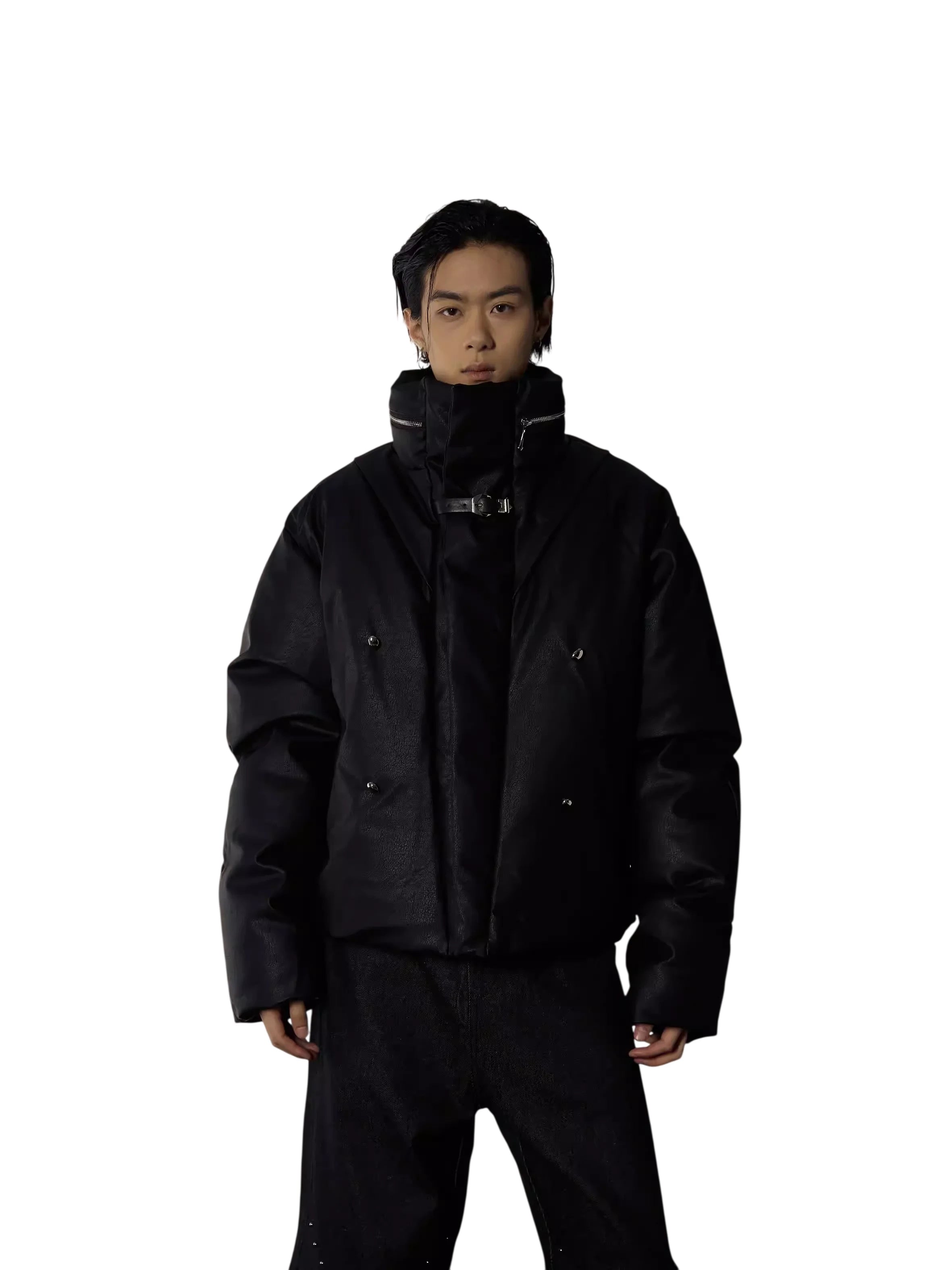 Elevate your winter wardrobe with this men's short puffer jacket crafted from thickened PU leather. Designed with a modern minimalist aesthetic, it features duck down insulation for superior warmth and a high, buckled collar for added style and protection. The metallic button detailing and voluminous shape create a bold yet refined silhouette, perfect for urban, fashion-forward looks.