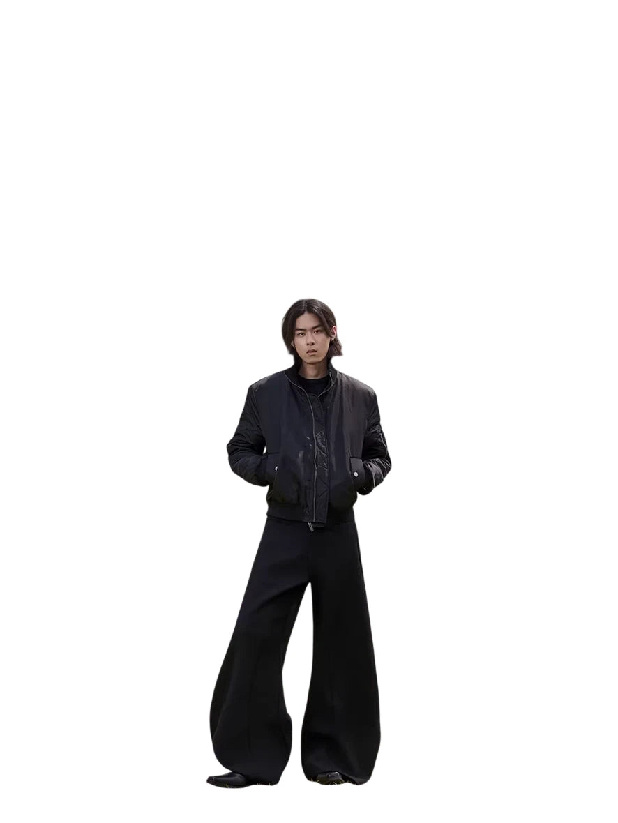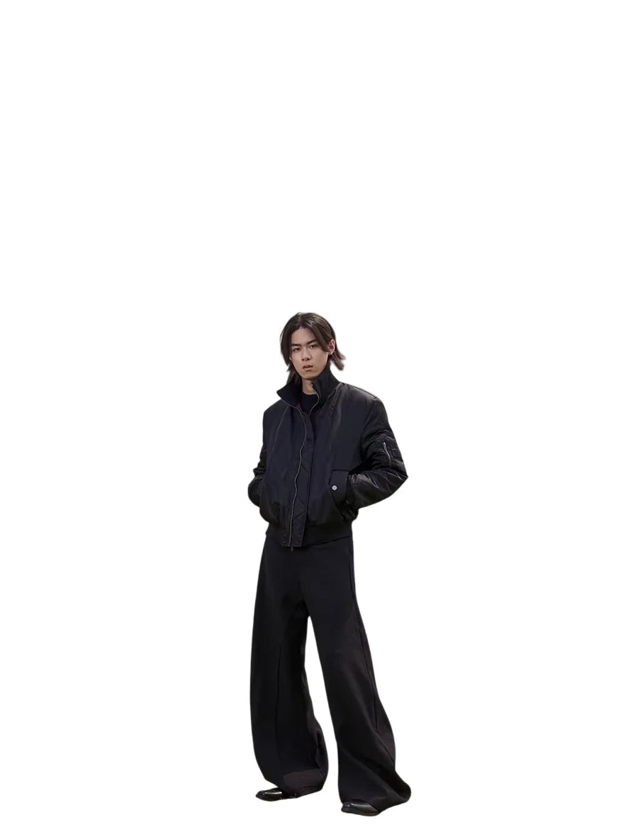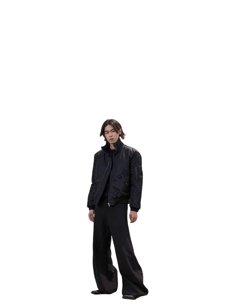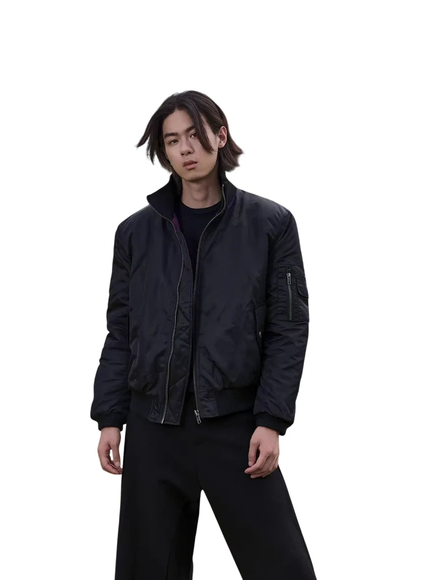 Stay stylish and warm with this men's waterproof insulated flight jacket. Designed with a sleek high-neck and cleanfit silhouette, the jacket features a deep purple inner lining for a subtle contrast. Functional details include a zipper front, ribbed cuffs and hem, a utility flap pocket, and a zippered sleeve pocket. Ideal for an urban look, this jacket merges fashion with practicality for colder weather.