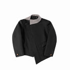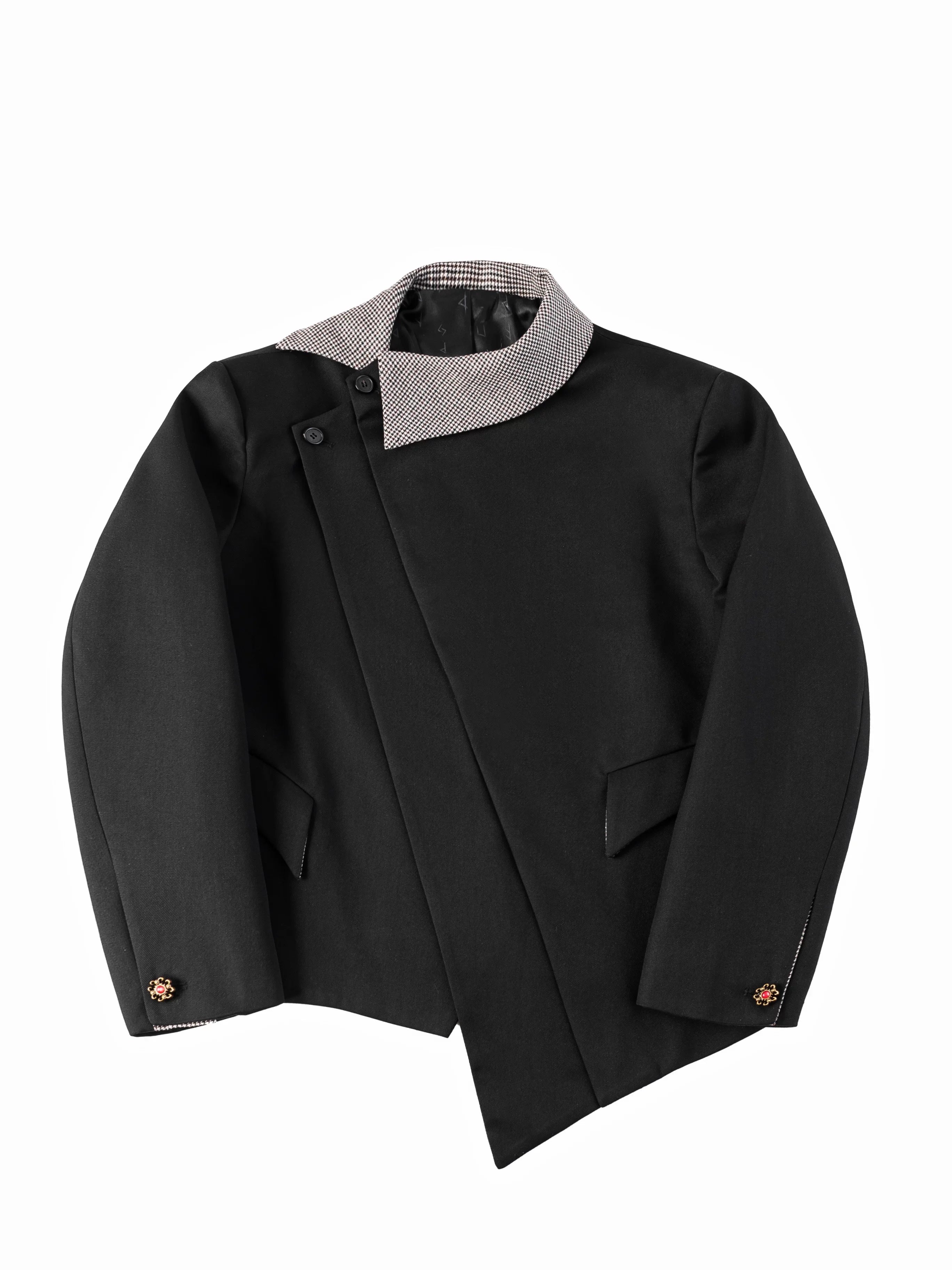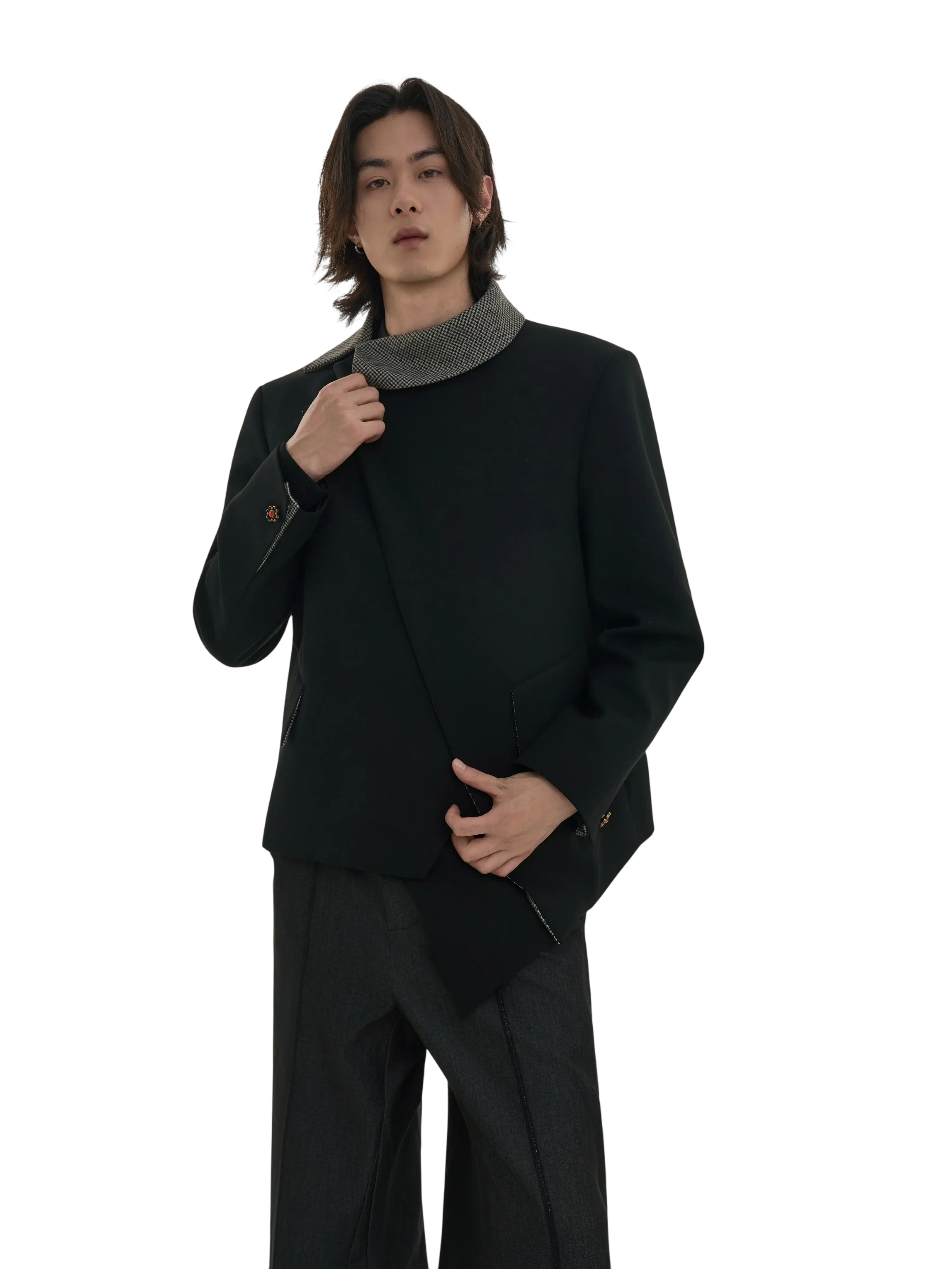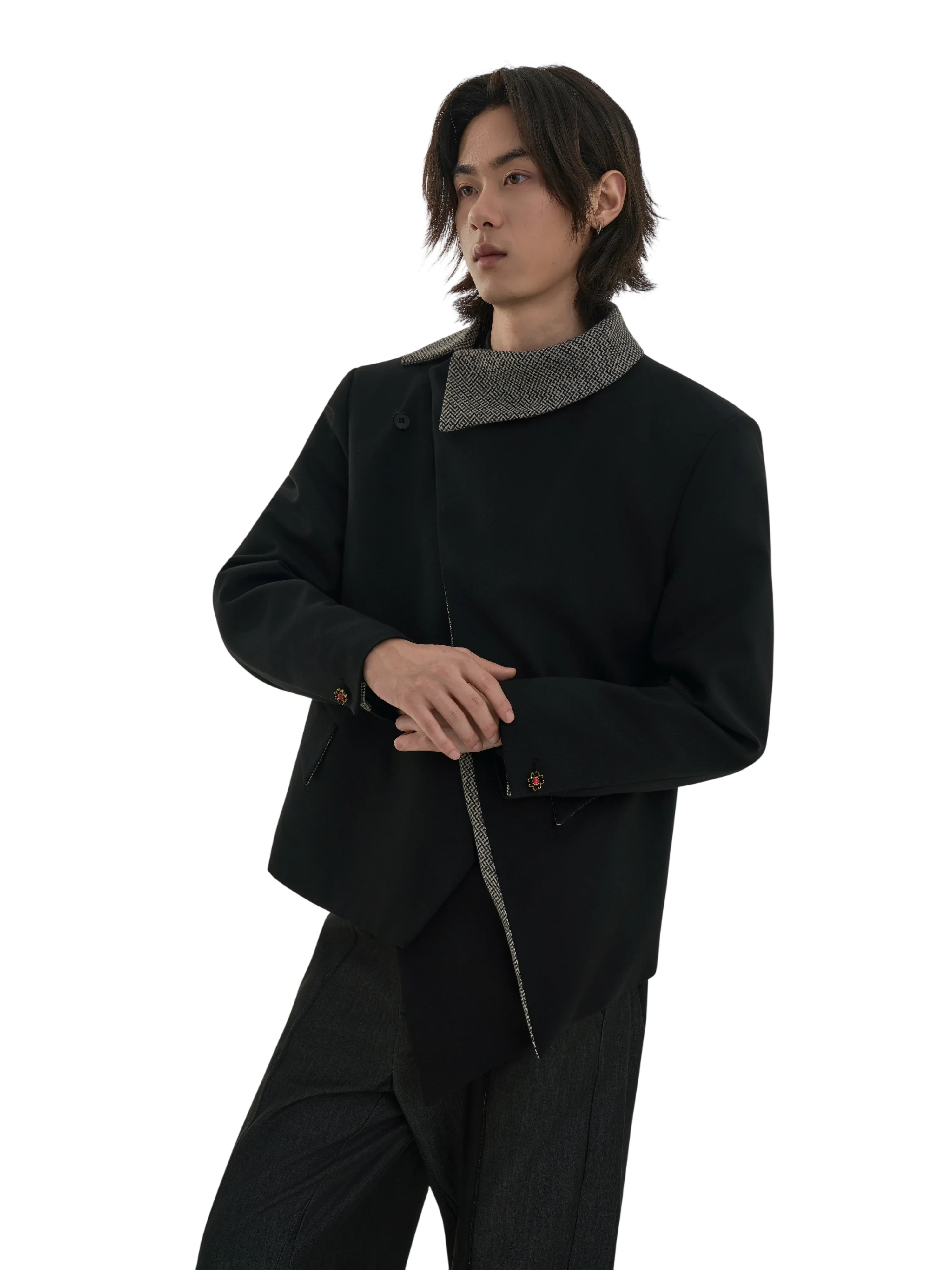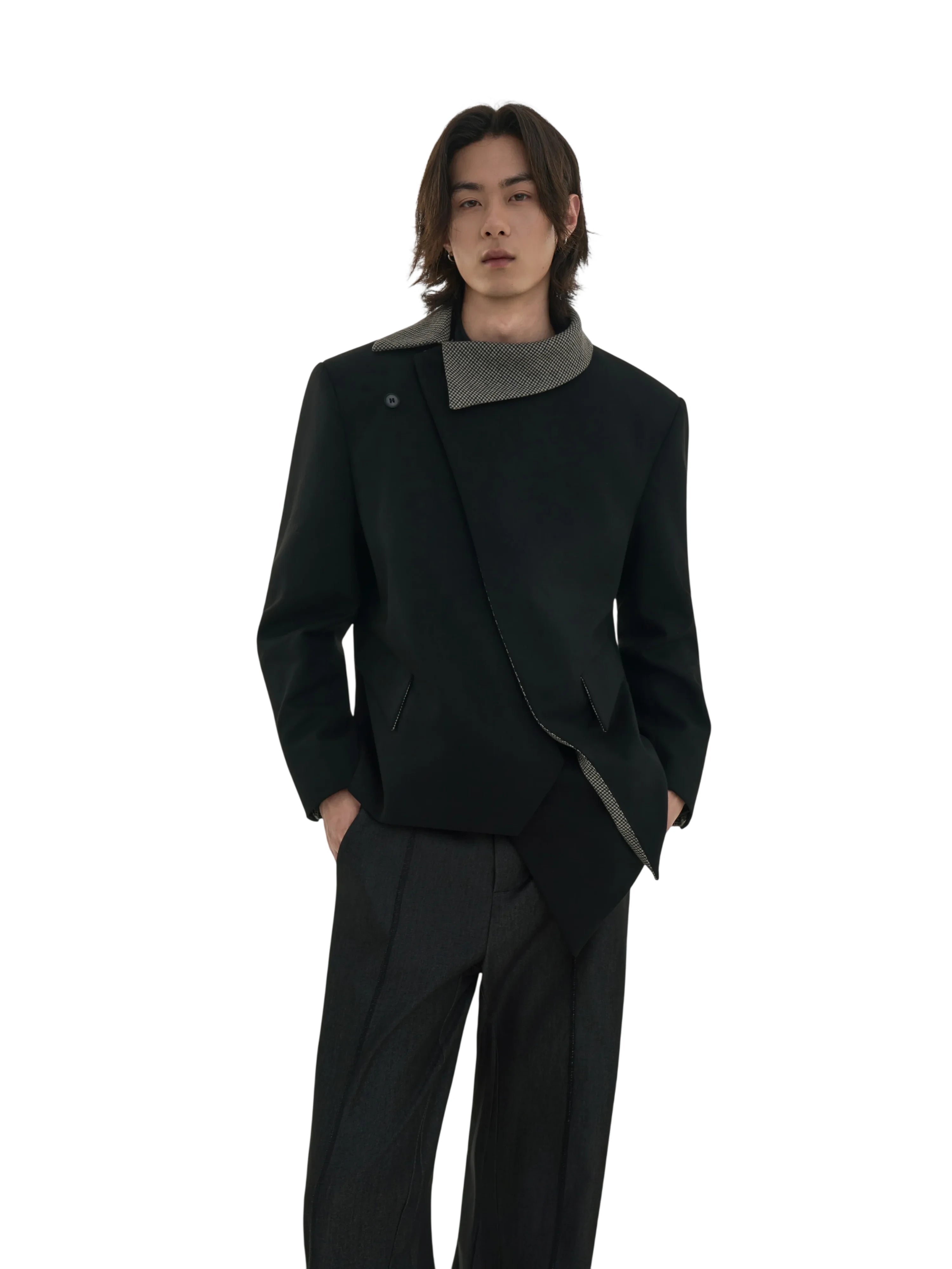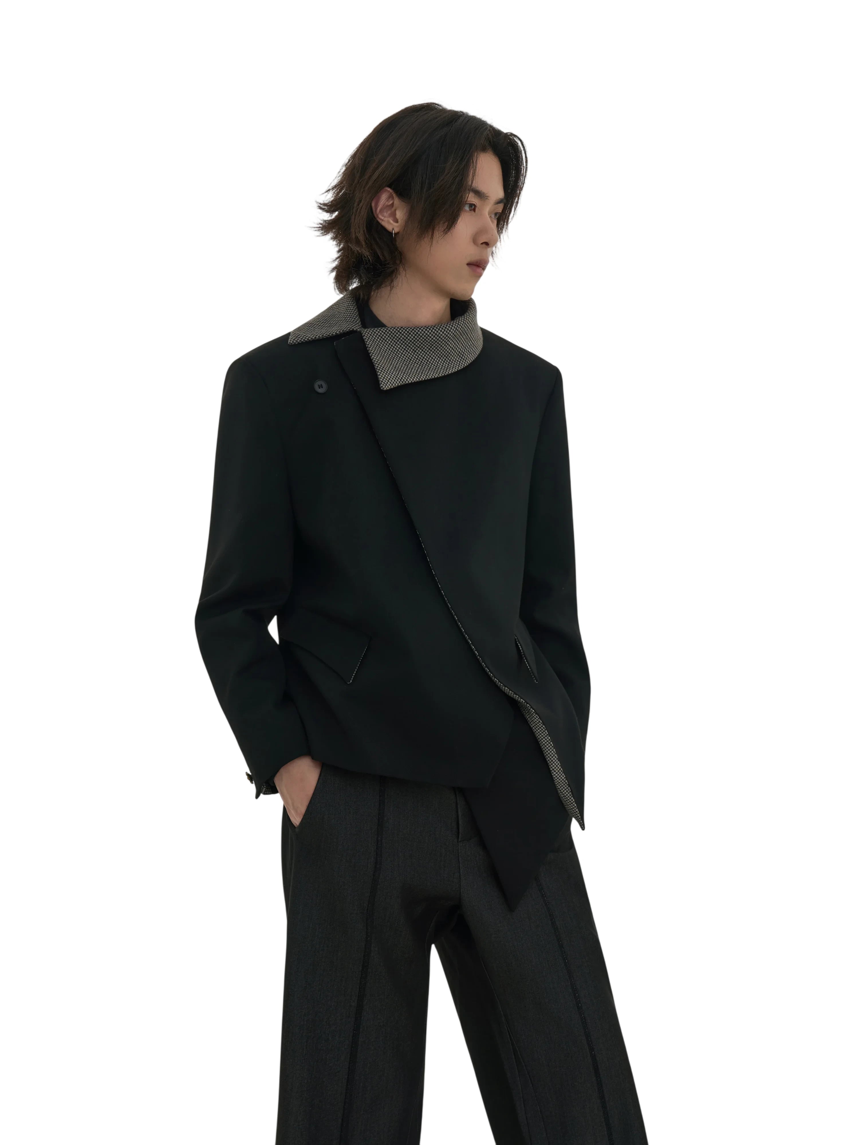 This modern men's blazer showcases a bold, deconstructed silhouette with an asymmetrical front closure and hemline for a distinct avant-garde aesthetic. Crafted from a first-cut wool blend, it features two classic front flap pockets and a striking inner collar detailed in a black-and-white houndstooth pattern. Decorative cuff buttons enhance its tailored appeal, while a smooth satin-like interior lining ensures added comfort and sleekness. A refined piece ideal for making a statement.