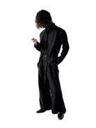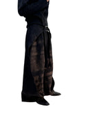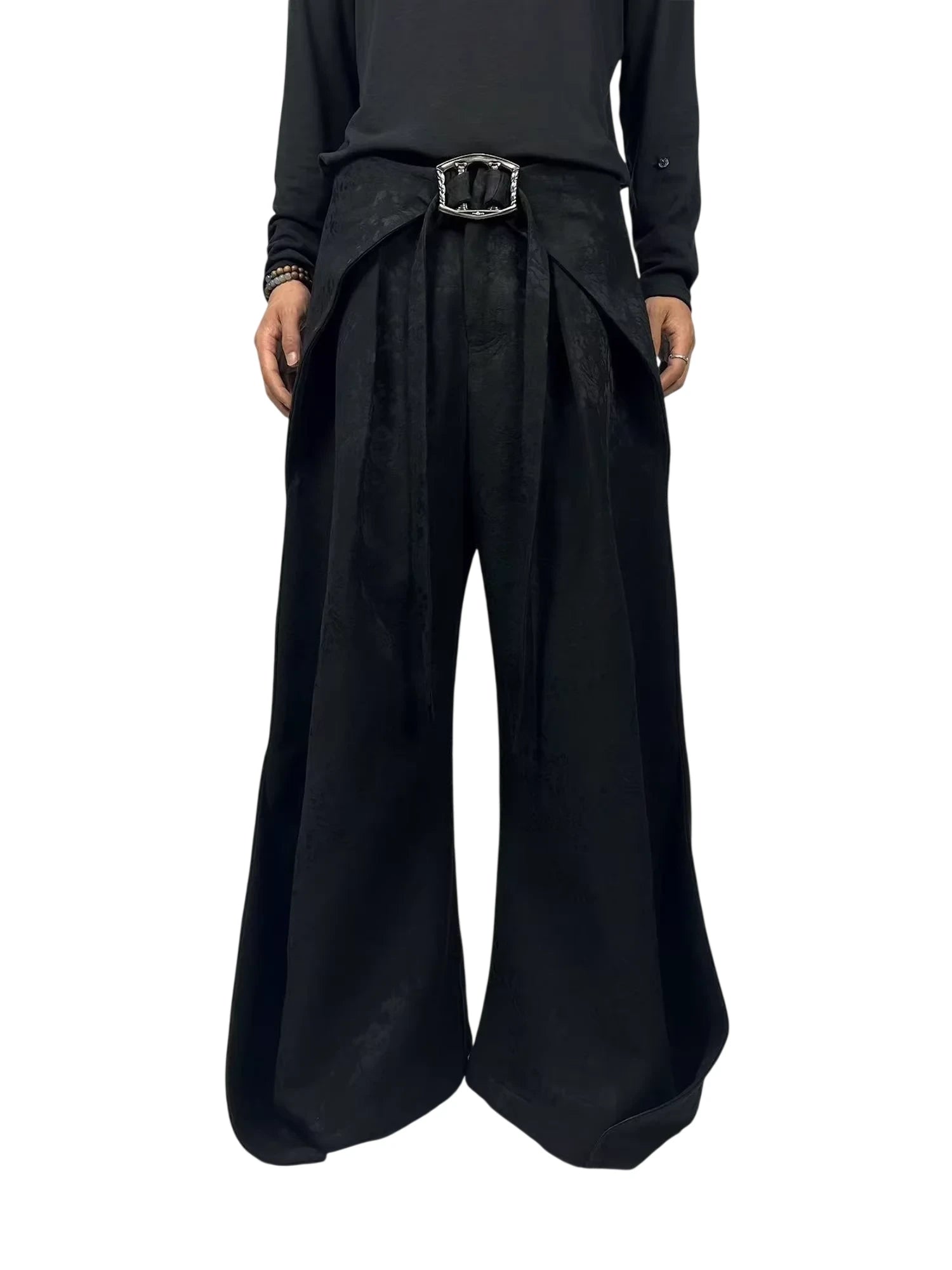 Elevate your wardrobe with these women's high-waisted wide-leg pants, designed for a bold and sophisticated look. Crafted from luxurious jacquard fabric, the pants feature stylish pleats and dramatic overlay flaps that create a striking silhouette. A structured belt with a prominent rectangular buckle cinches the waist, enhancing the tailored fit. Perfect for statement dressing, these pants offer both elegance and edge.