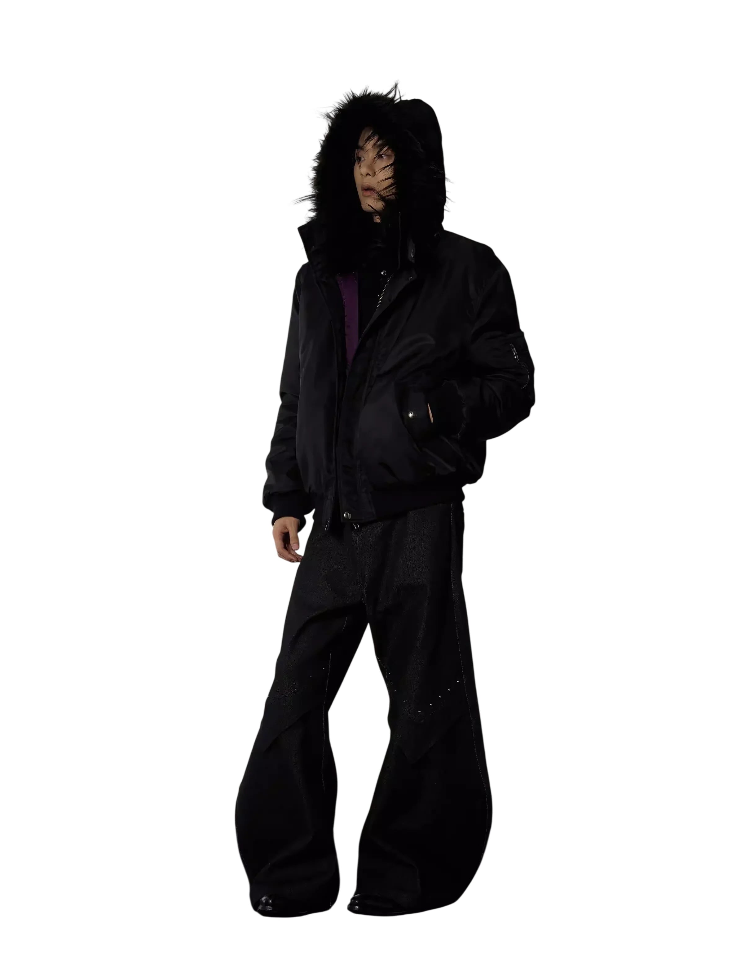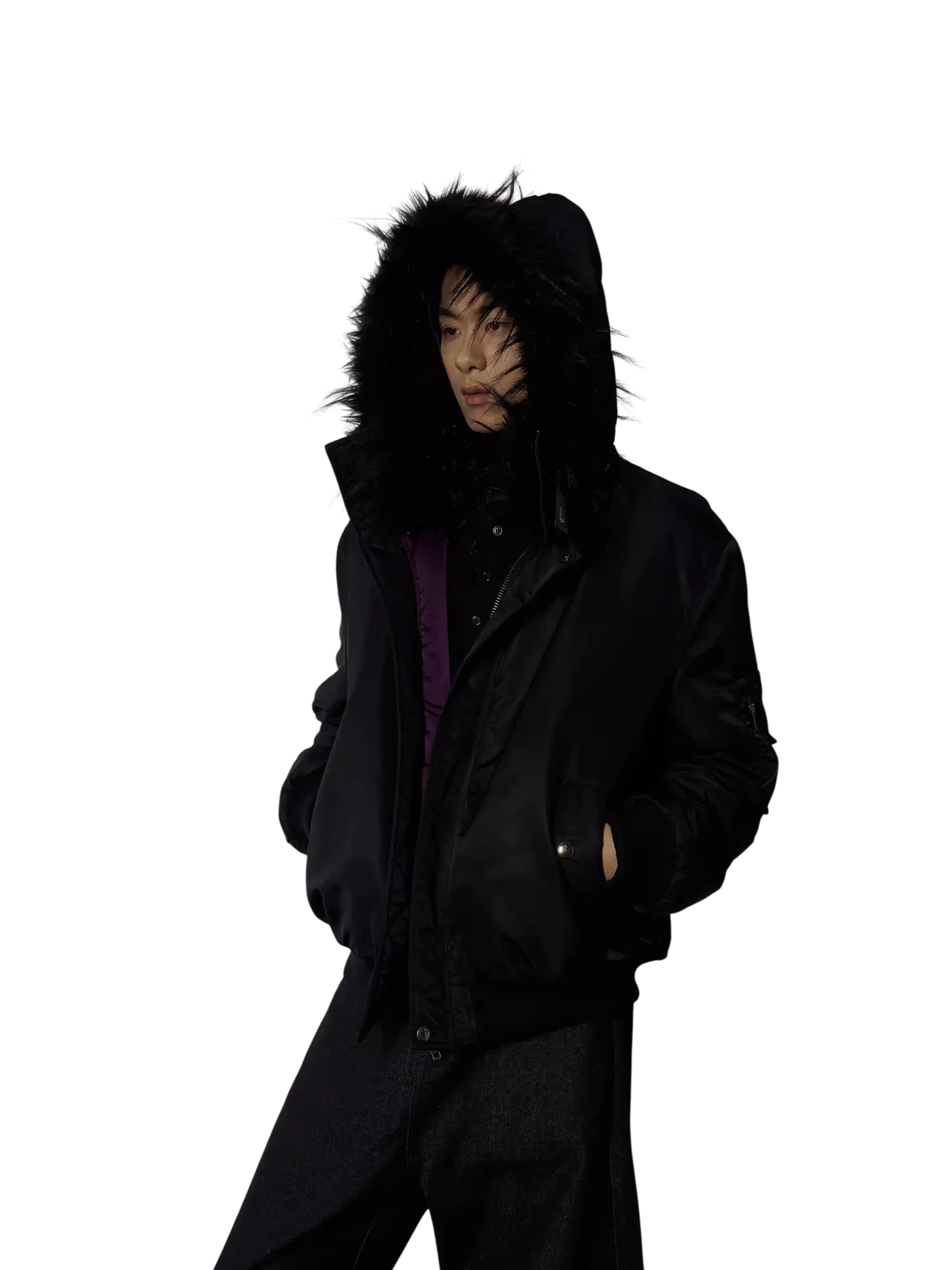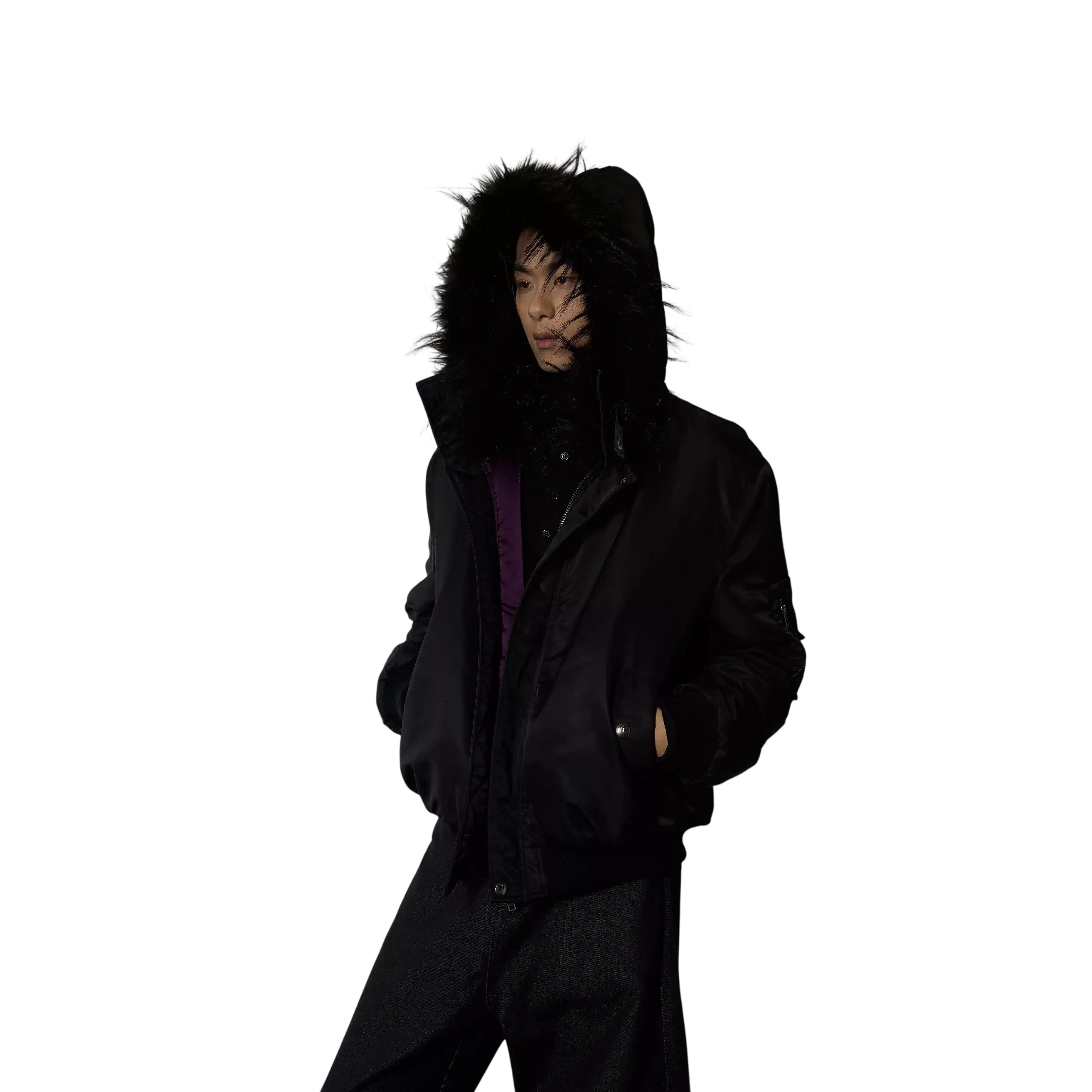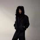 Stay warm and stylish with this second-generation women's padded winter jacket. Designed with a stand collar and a cozy faux fur-lined hood, this sleek black jacket offers both comfort and elegance. It features a smooth matte finish, convenient front zipper with snap buttons, and practical side pockets. The inner purple lining adds a subtle pop of color, making it a chic addition to any cold-weather wardrobe. Perfect for pairing with wide-leg pants or layered over your favorite top for a monochrome look.