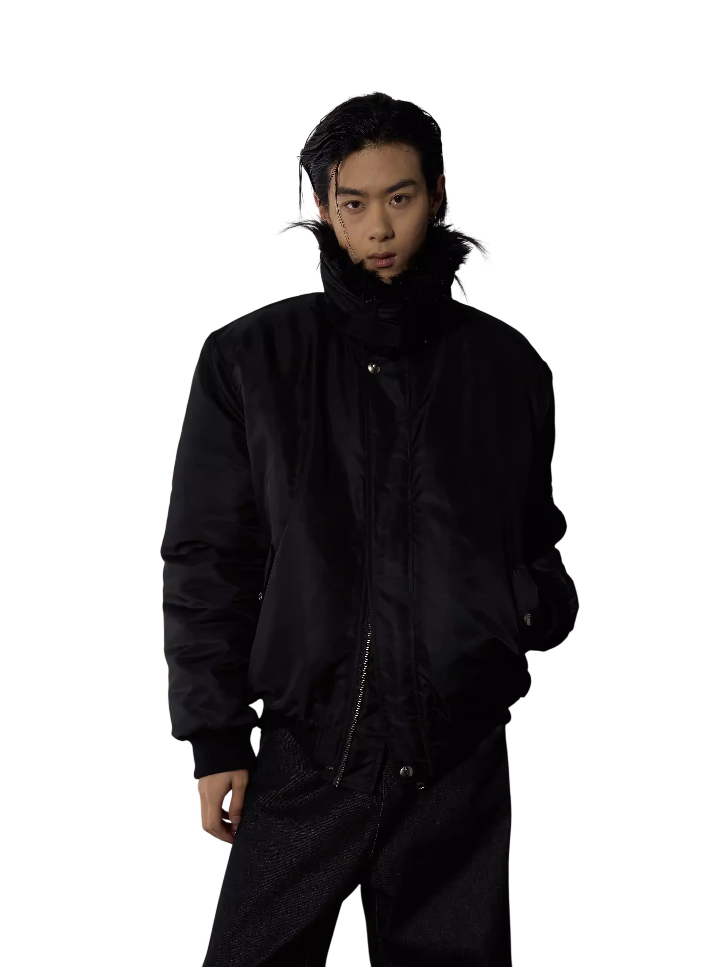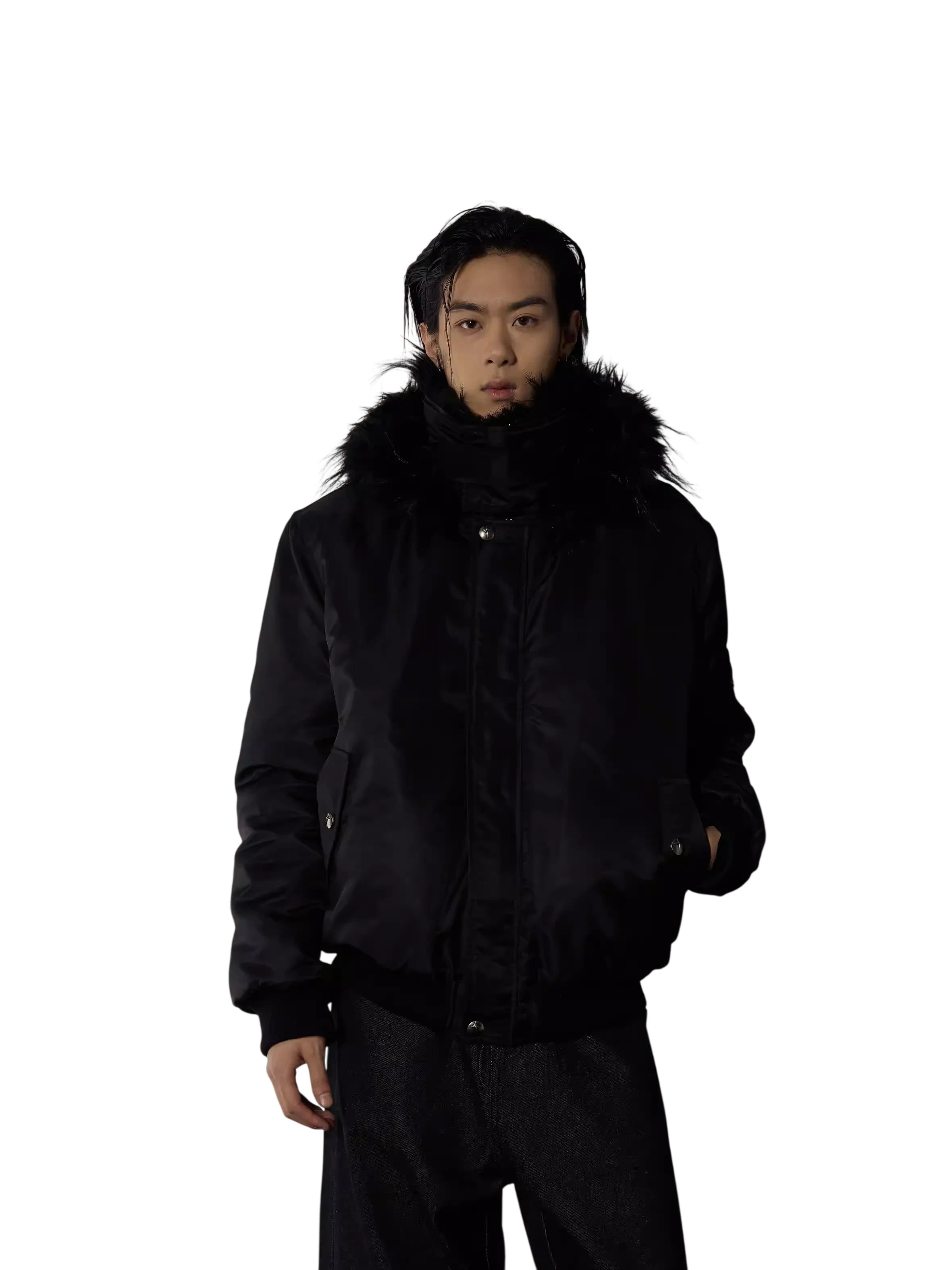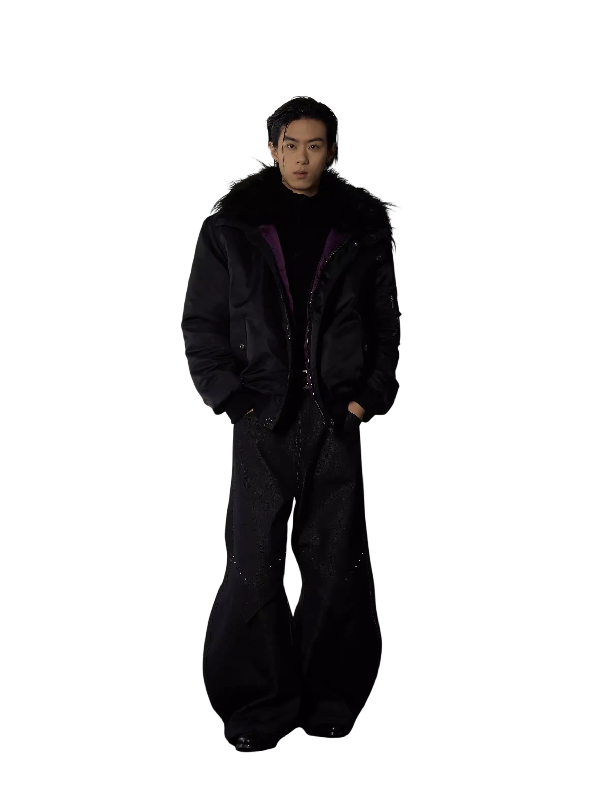 Stay warm and stylish with this second-generation women's padded winter jacket. Designed with a stand collar and a cozy faux fur-lined hood, this sleek black jacket offers both comfort and elegance. It features a smooth matte finish, convenient front zipper with snap buttons, and practical side pockets. The inner purple lining adds a subtle pop of color, making it a chic addition to any cold-weather wardrobe. Perfect for pairing with wide-leg pants or layered over your favorite top for a monochrome look.