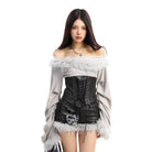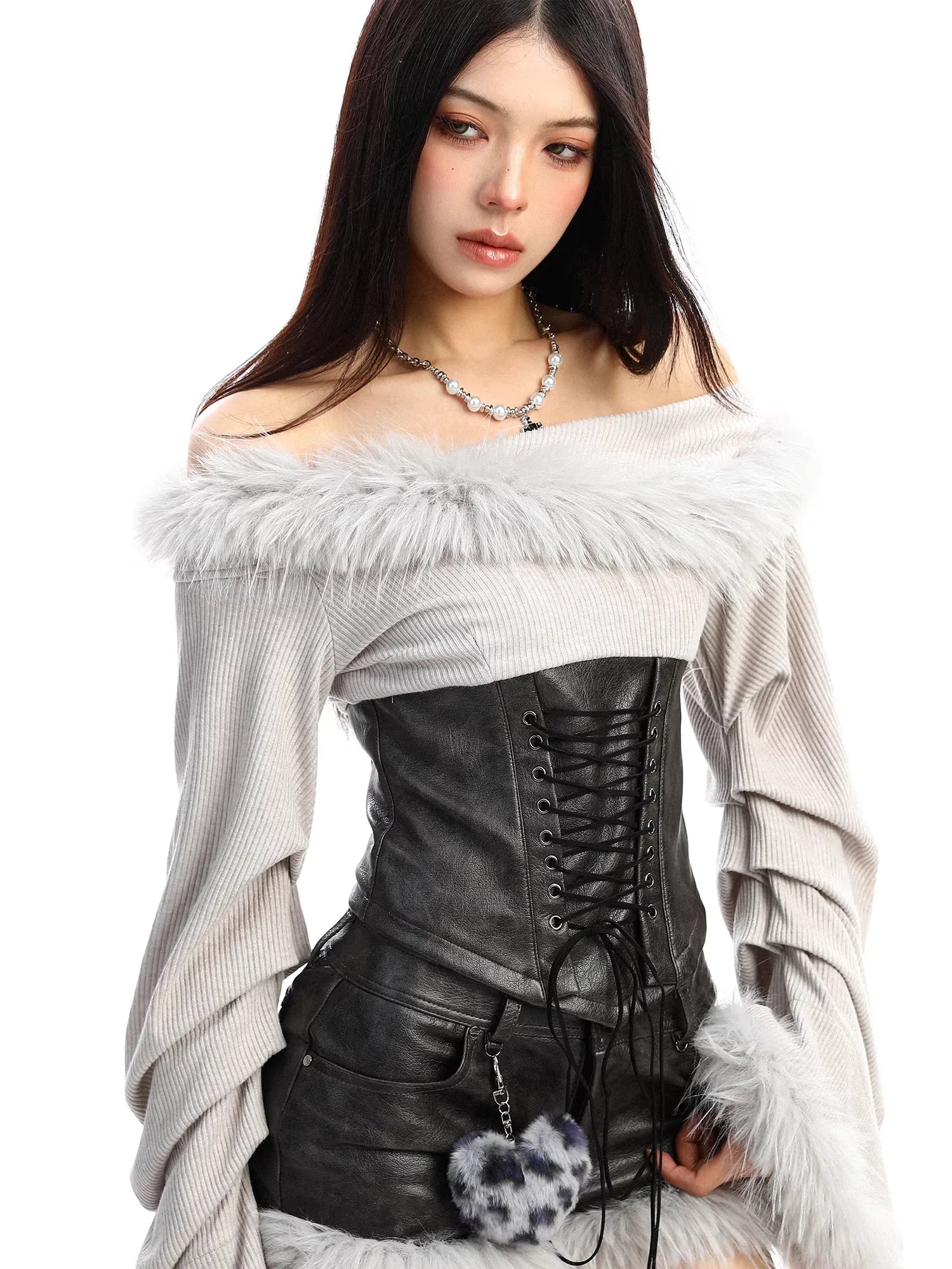 Make a bold fashion statement with this women's off-shoulder crop top, combining edgy and chic details. This top features long, flared sleeves and soft faux fur trim along the neckline, cuffs, and hemline for a touch of glam. Designed with a ribbed light grey fabric body and a black faux leather corset-style bodice, it includes lace-up detailing at the waist to enhance an hourglass silhouette. Ideal for stylish outings or statement streetwear looks.