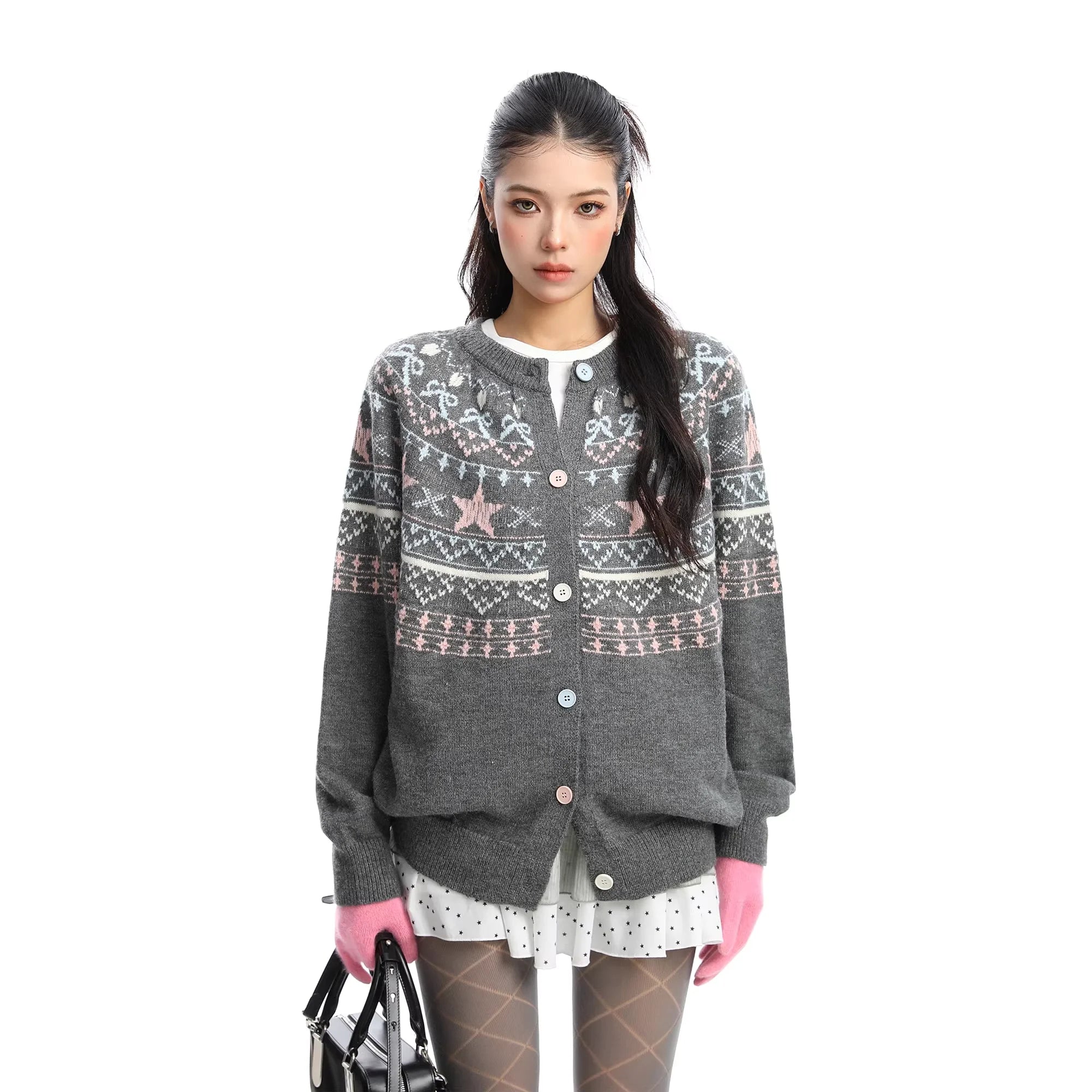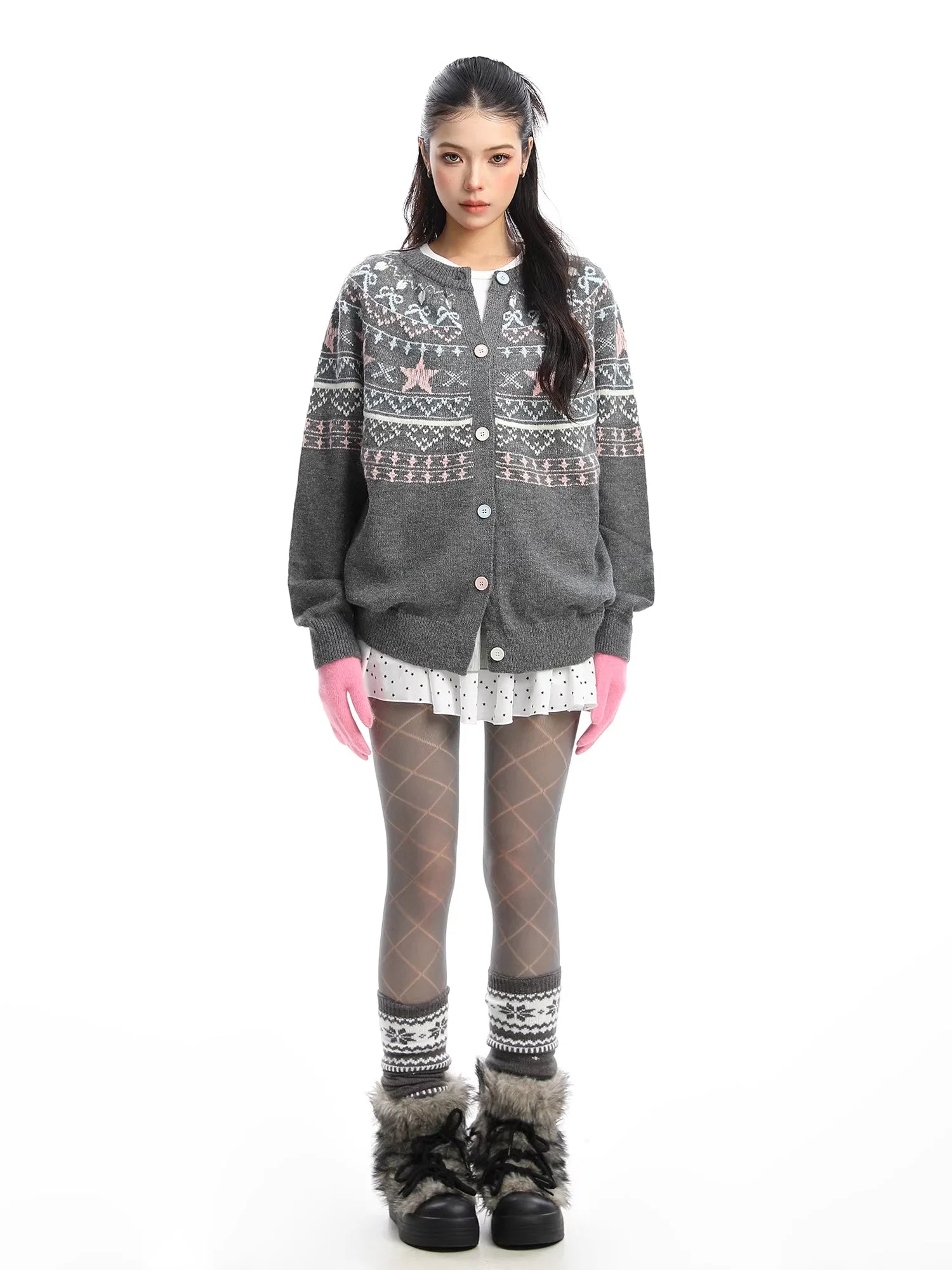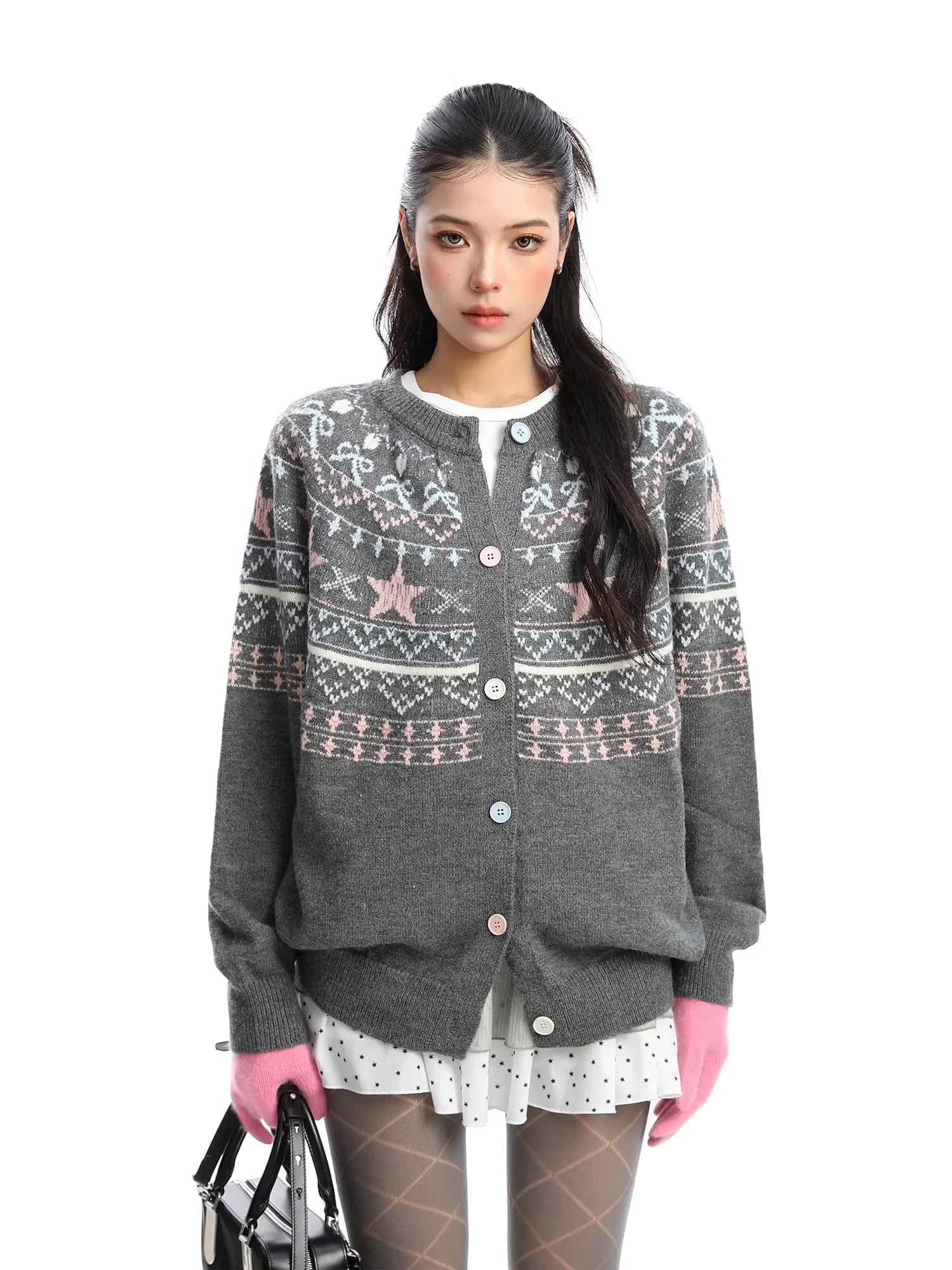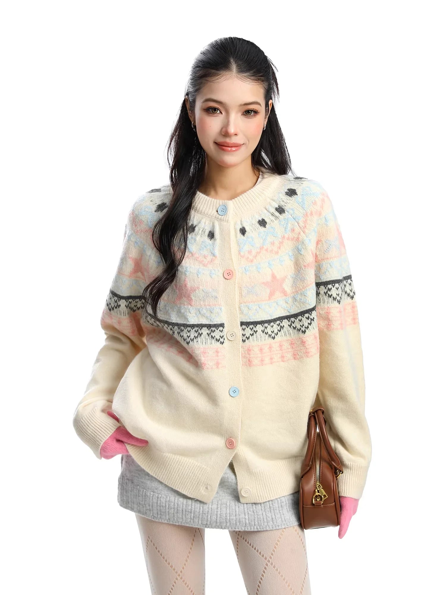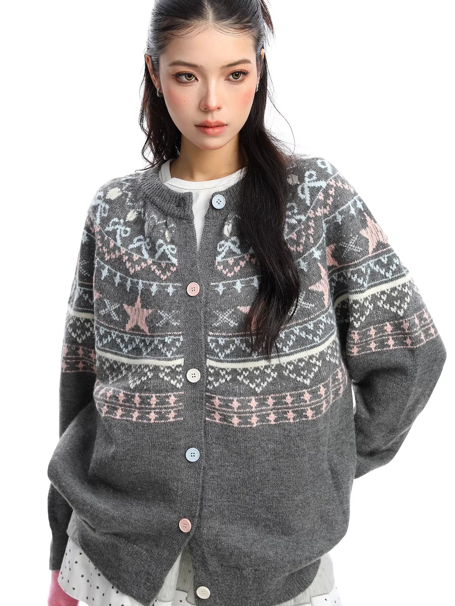 Stay cozy and stylish in this women's Fair Isle knit cardigan, perfect for autumn and winter. Featuring a soft jacquard pattern in pink, white, and blue tones, it includes charming details like bows, stars, and geometric motifs. The oversized fit and round neckline offer a relaxed silhouette, while the multicolored buttons provide a playful touch. Layer over your favorite dress or top for a warm and fashionable look.