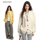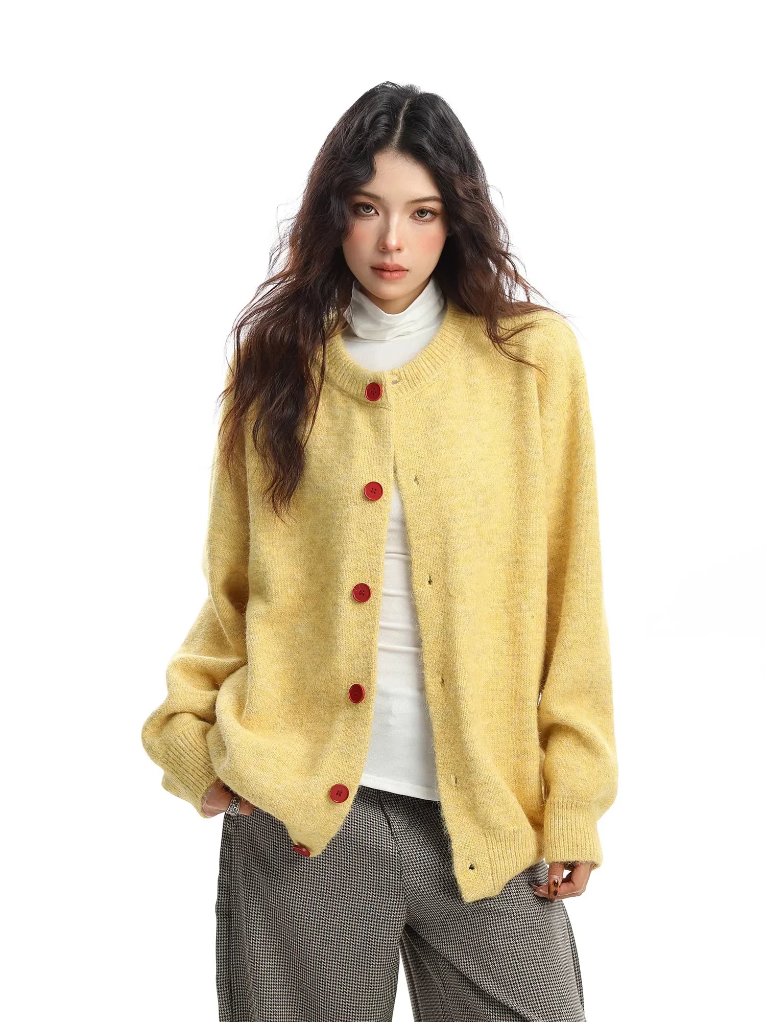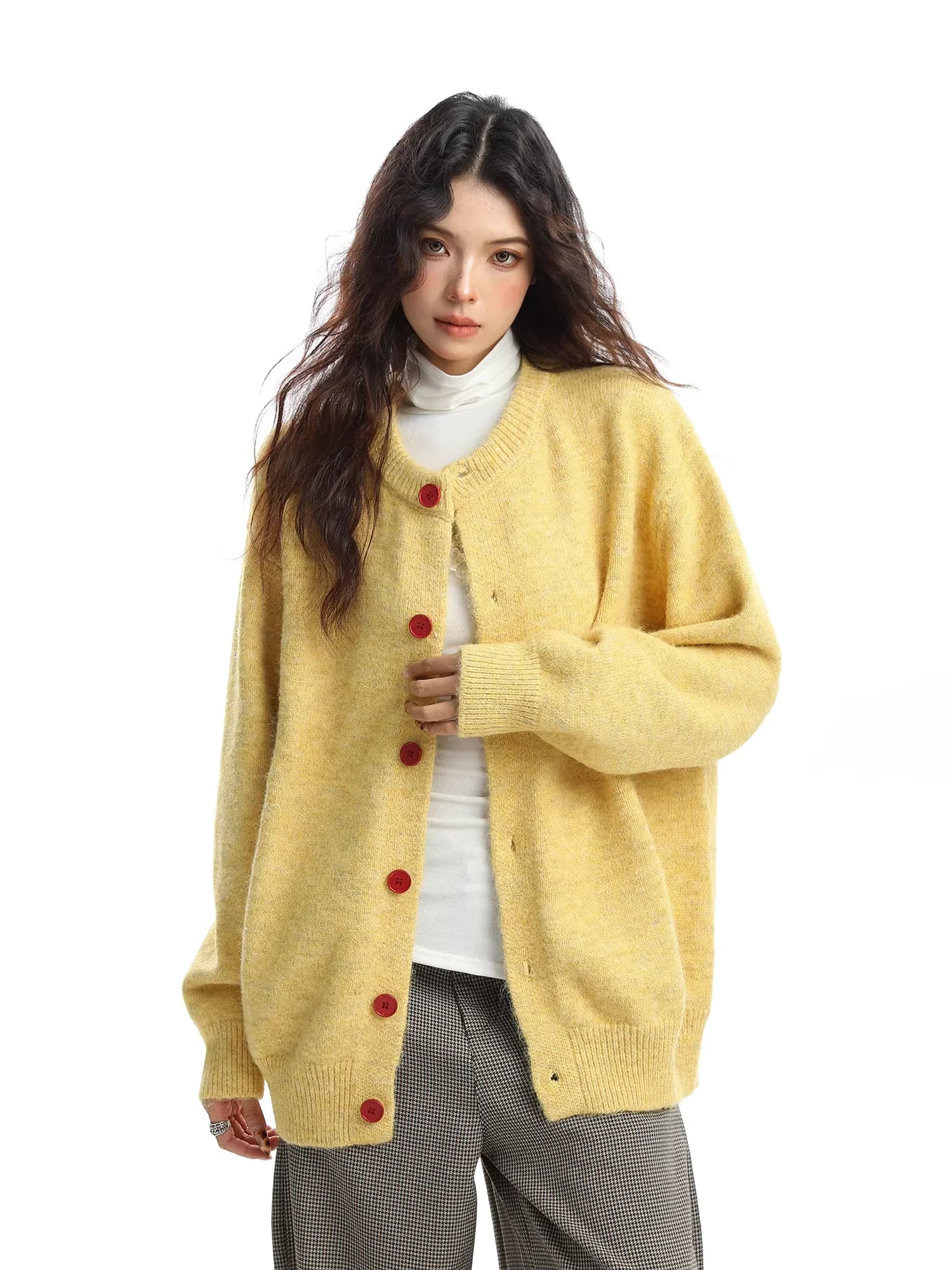 Elevate your autumn wardrobe with this soft, oversized cardigan designed in a trendy Korean style. Featuring vibrant red statement buttons and a relaxed silhouette, this knit sweater offers both comfort and fashion-forward appeal. The dropped shoulders and ribbed cuffs enhance its casual charm, making it an ideal outer layer for cool-weather styling. Available in soft yellow and creamy off-white shades.