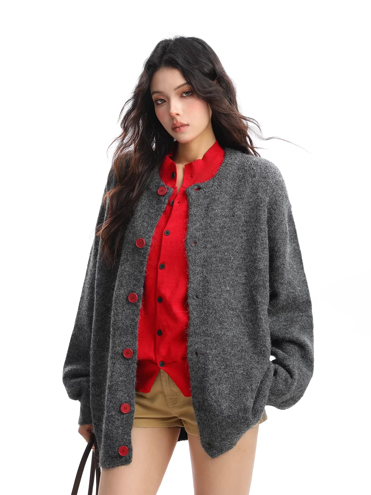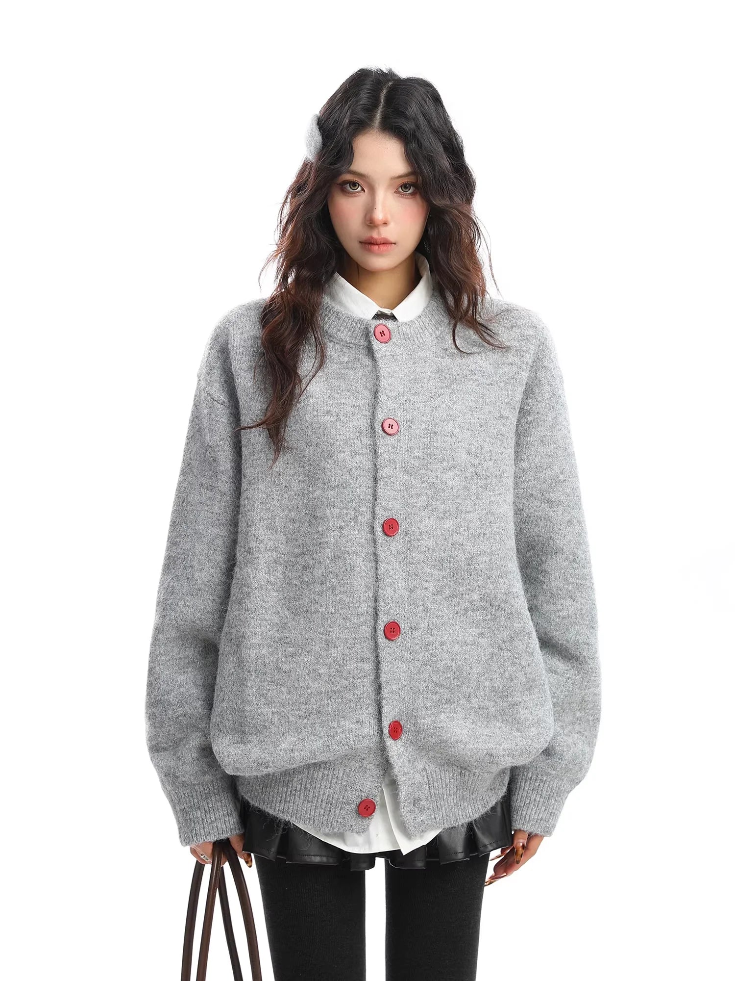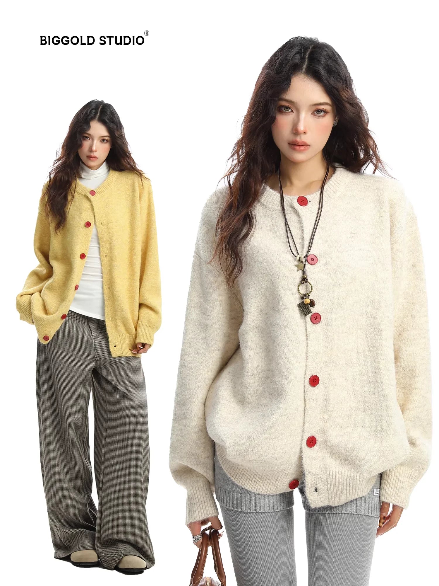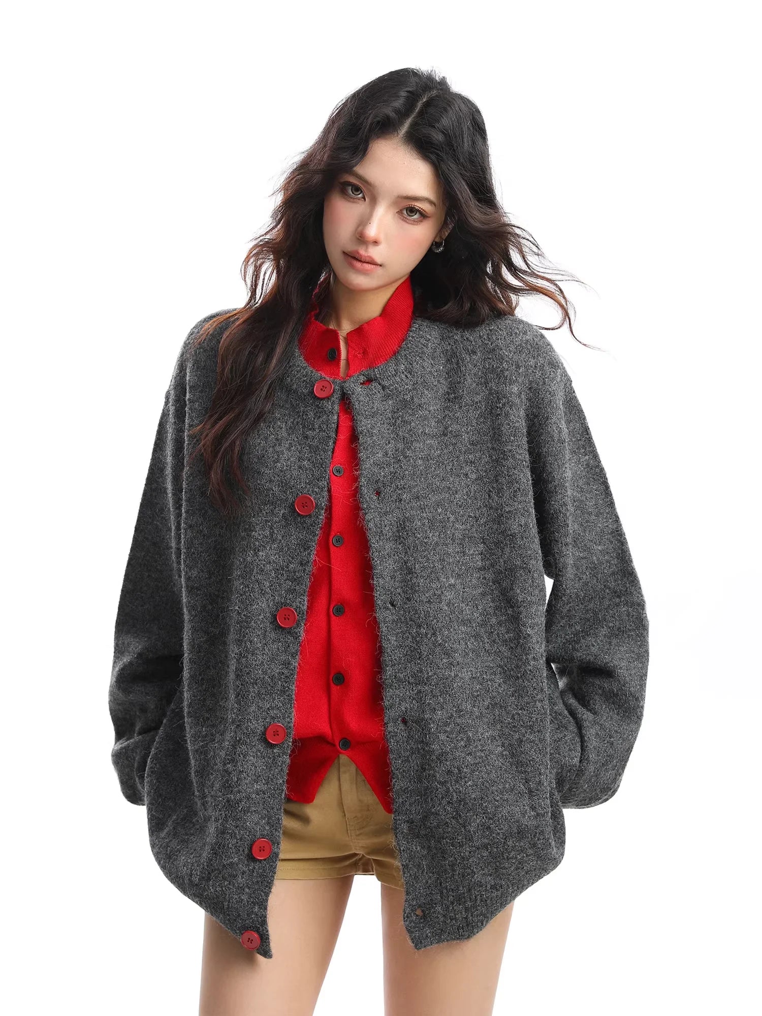 BIGGOLD STUDIO Women's Korean Style Oversized Knit Cardigan with Red Buttons
