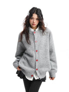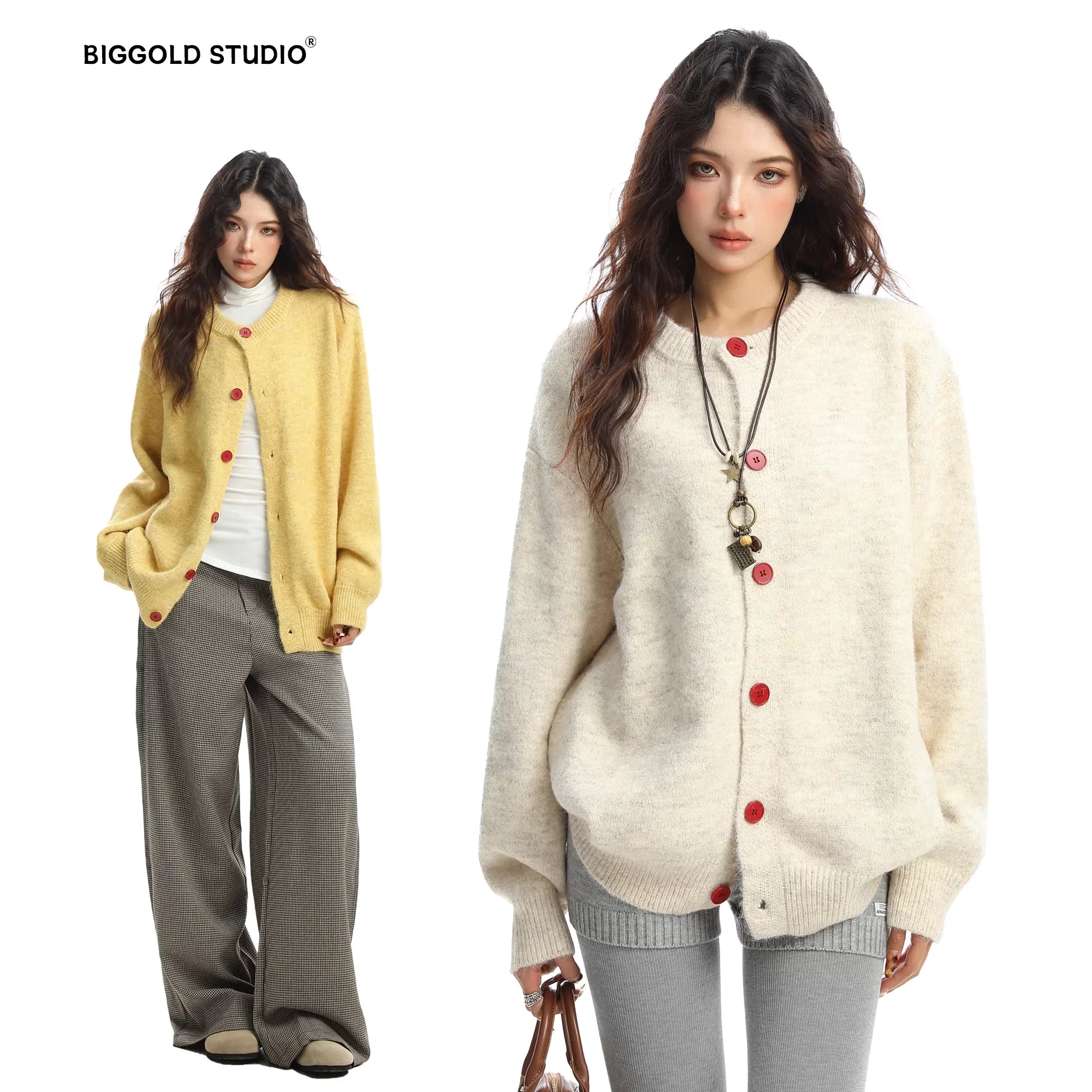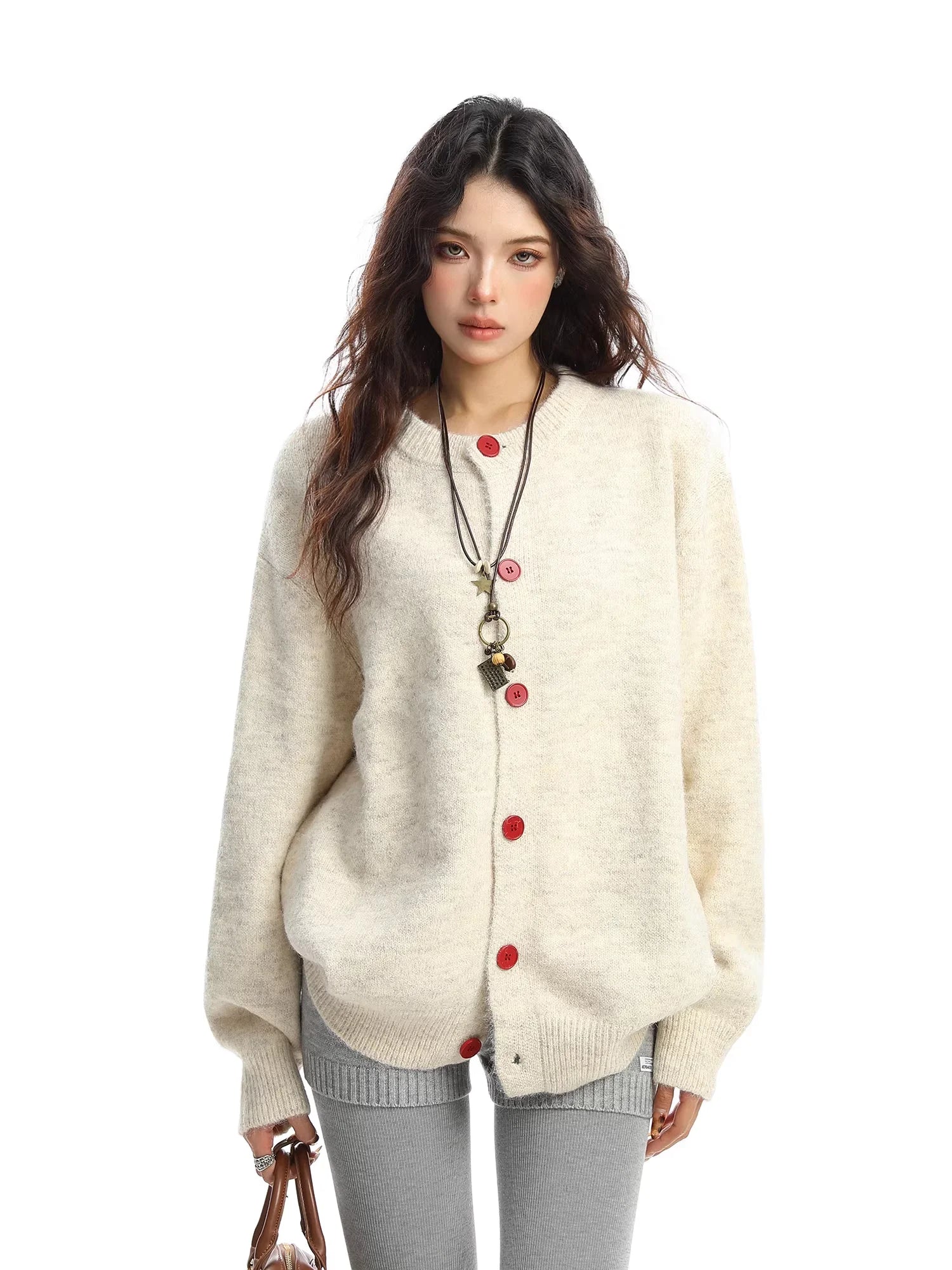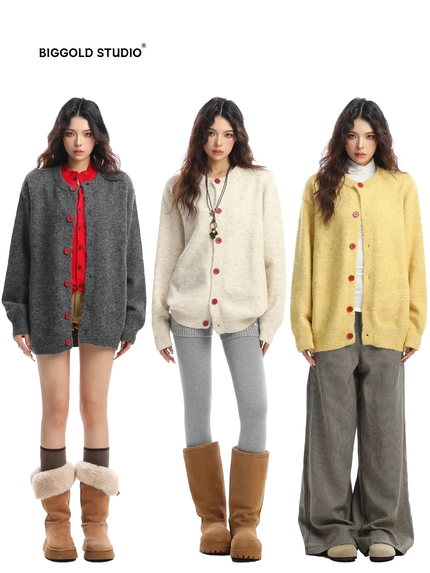BIGGOLD STUDIO Women's Korean Style Oversized Knit Cardigan with Red Buttons