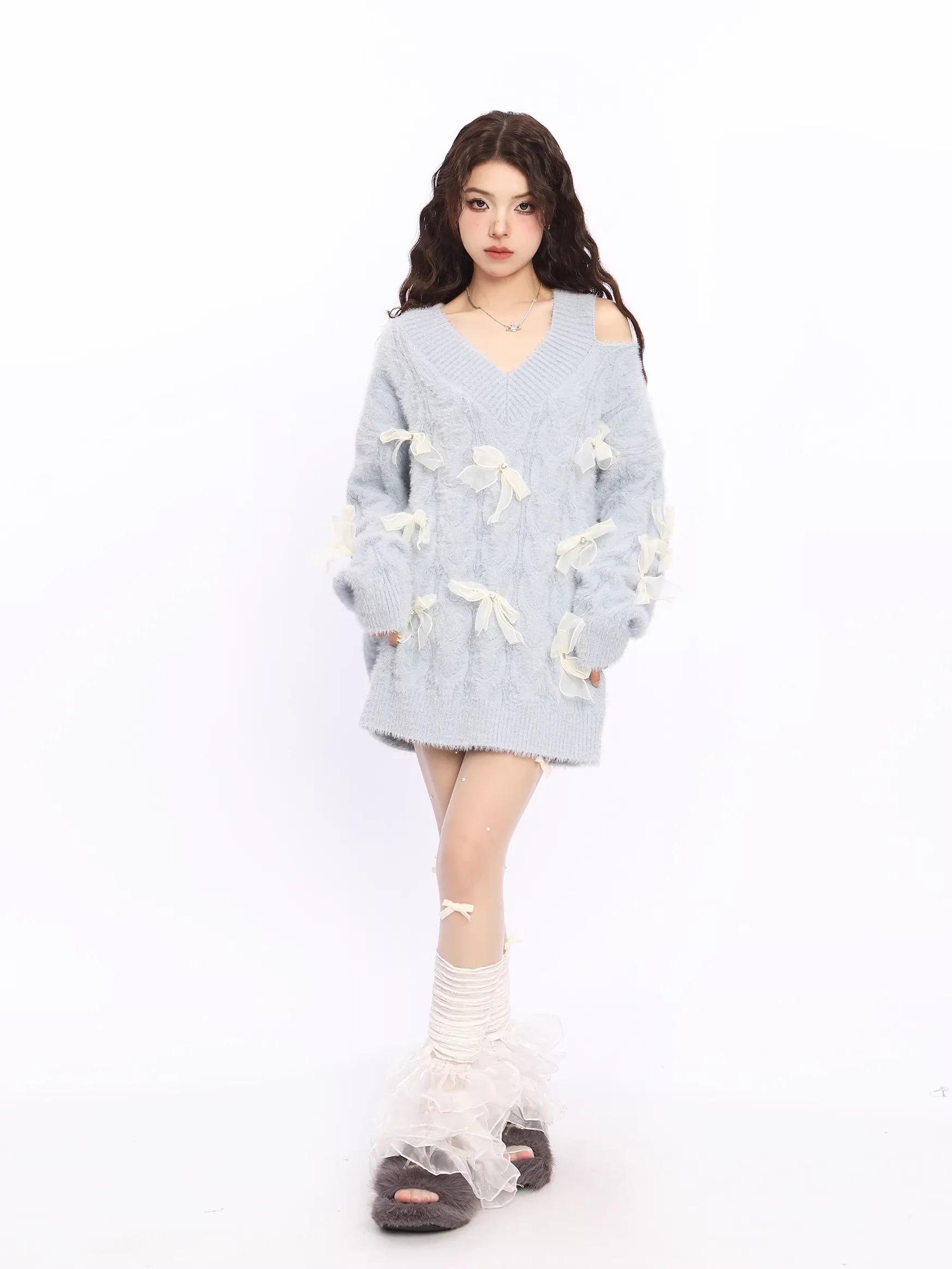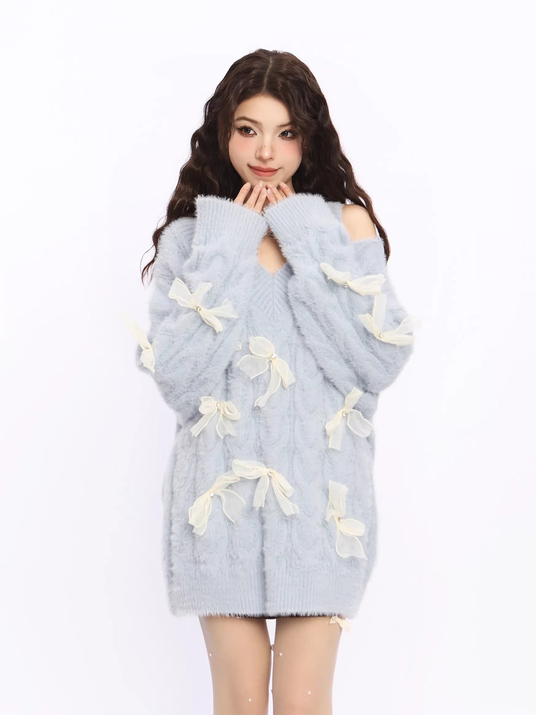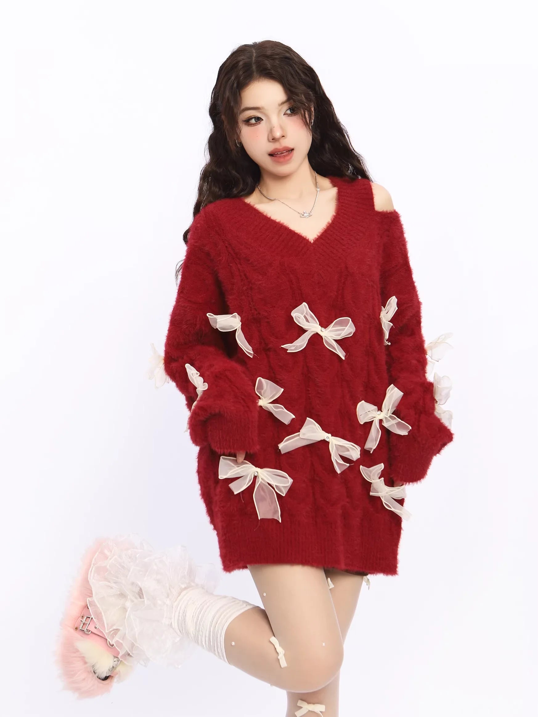 Elevate your autumn and winter wardrobe with this cozy and stylish off-shoulder red knit sweater dress for women. Designed with a flattering deep V-neckline and a trendy asymmetrical shoulder cut, this piece combines warmth with a touch of playful charm. Decorative white sheer ribbon bows embellish the front and sleeves, adding a whimsical and feminine touch. The soft, fluffy texture ensures comfort, while the oversized silhouette offers a relaxed, fashionable fit. Perfect for casual outings or festive occasions, this sweater dress is a standout choice for the colder seasons.