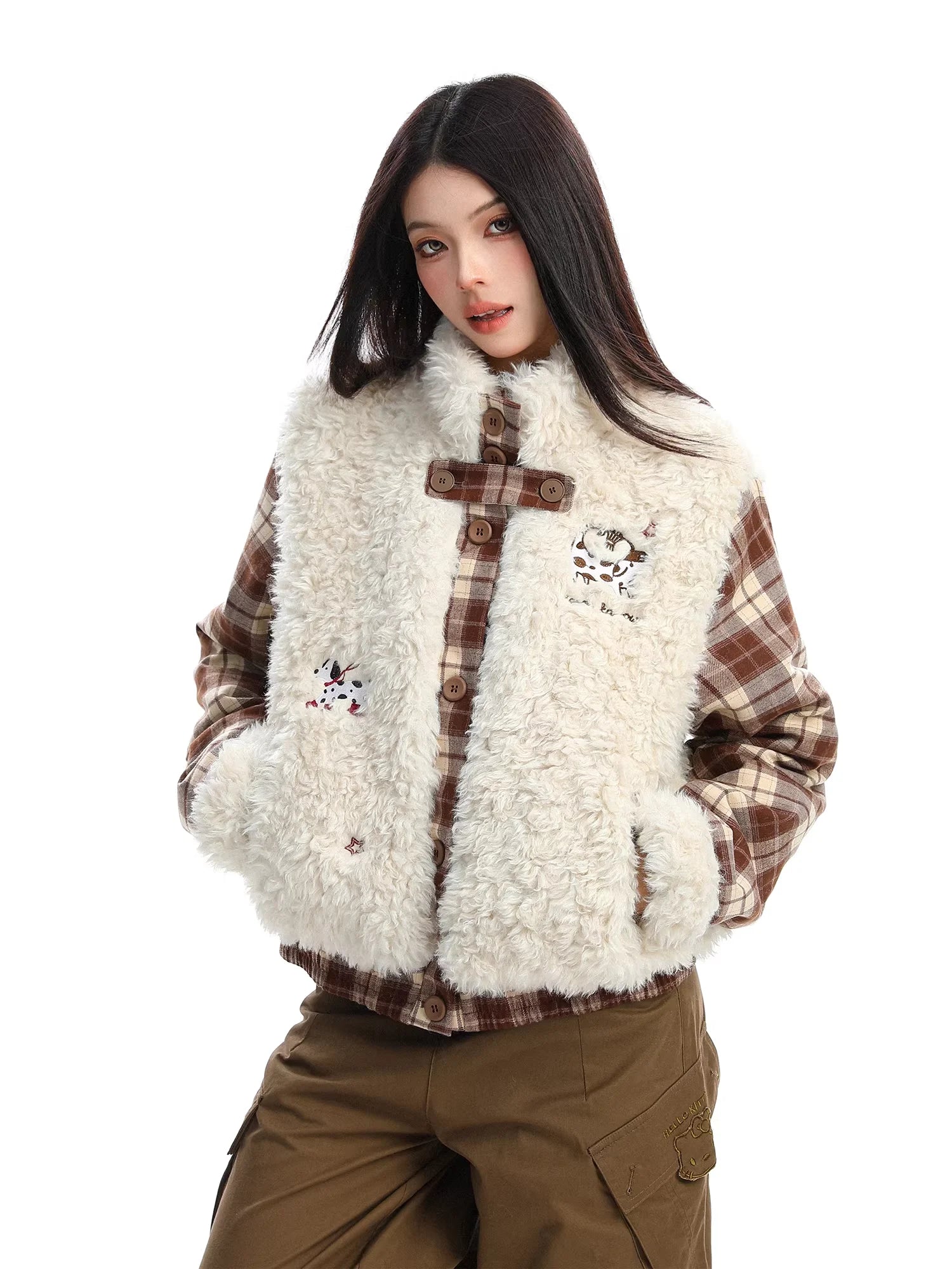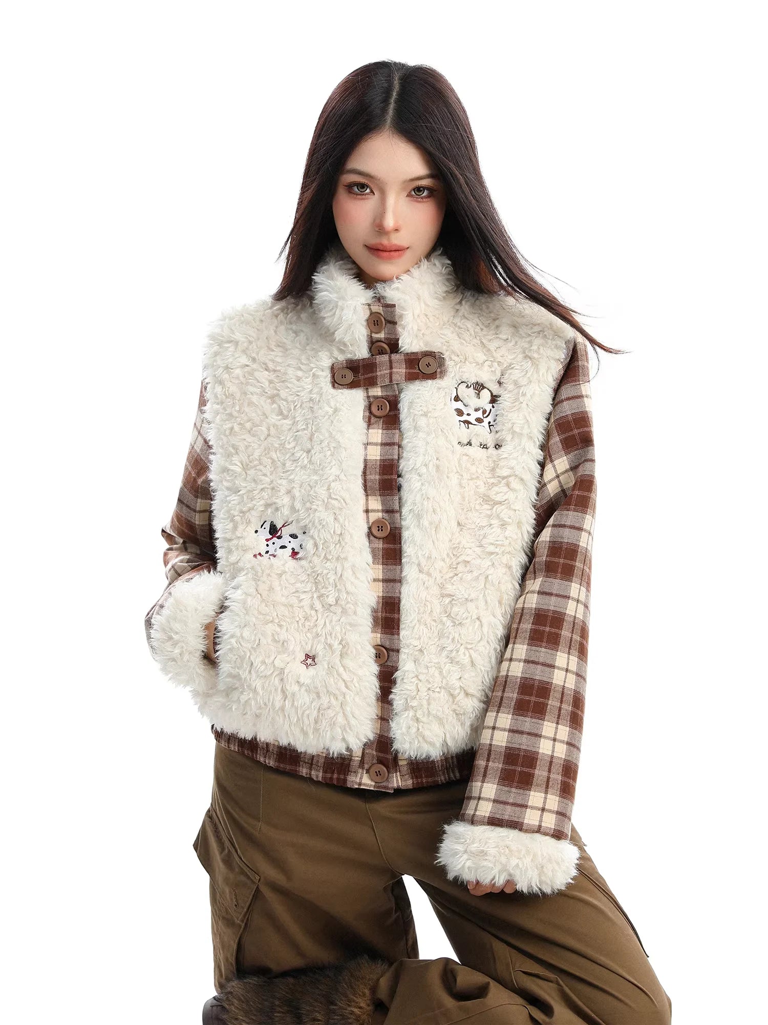 Stay warm and stylish this winter with this thick, quilted cotton jacket for women. Featuring a cozy plaid design, this jacket includes a plush faux fur vest layered over the main body for added warmth and flair. Distinctive animal embroidery patches bring a playful touch, while the stand collar and side pockets enhance both function and comfort. Perfect for cold weather fashion, this piece blends charm with practicality.