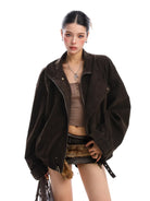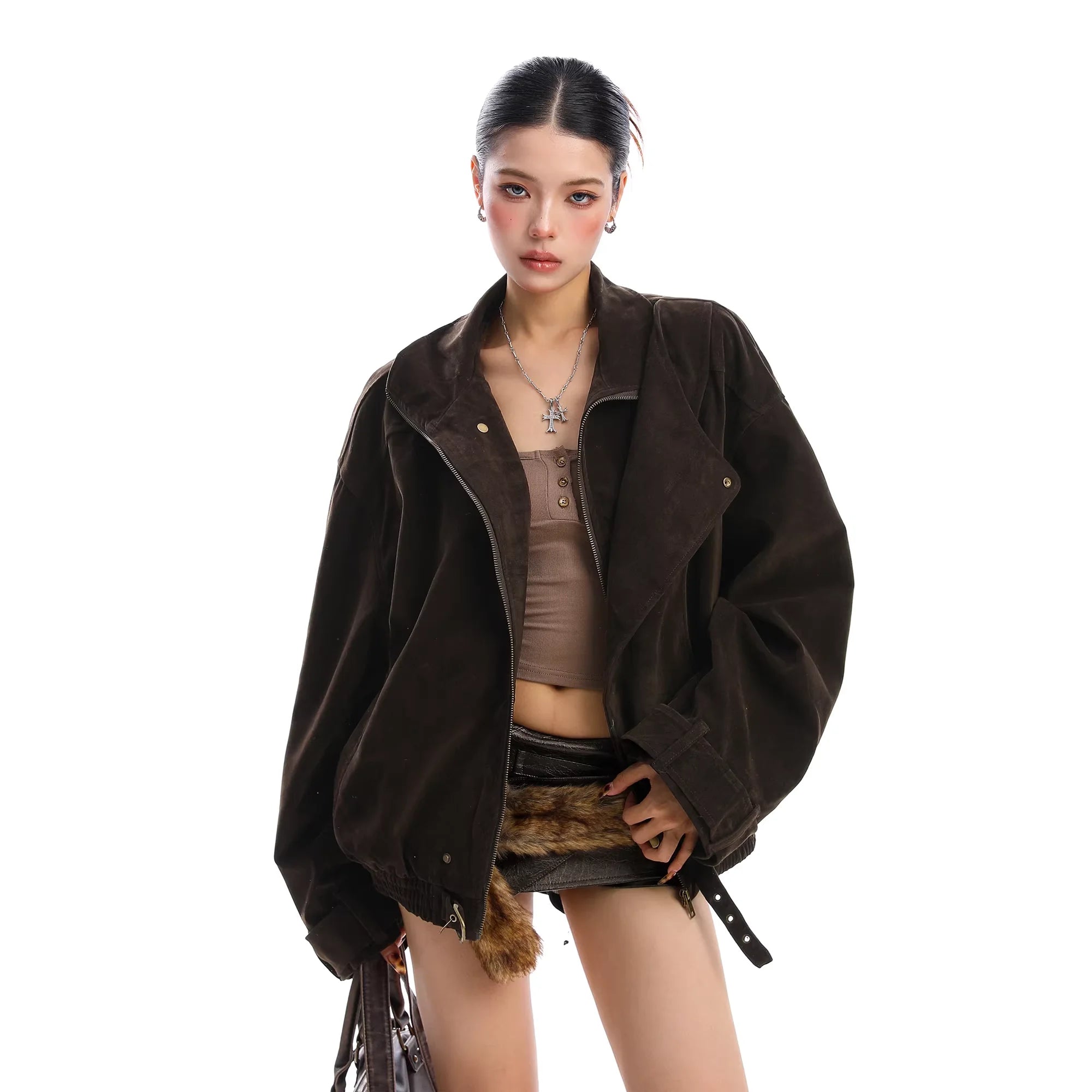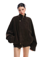 Elevate your outerwear collection with this American-style women's suede utility jacket, perfect for autumn and winter. Designed with a deconstructed, oversized fit, it features a stand-up collar with snap buttons, a front zipper closure, and adjustable straps at the cuffs and hemline for added comfort and style. Crafted with a sleek suede-like material, this jacket pairs effortlessly with casual or edgy looks, offering both warmth and fashion-forward appeal.