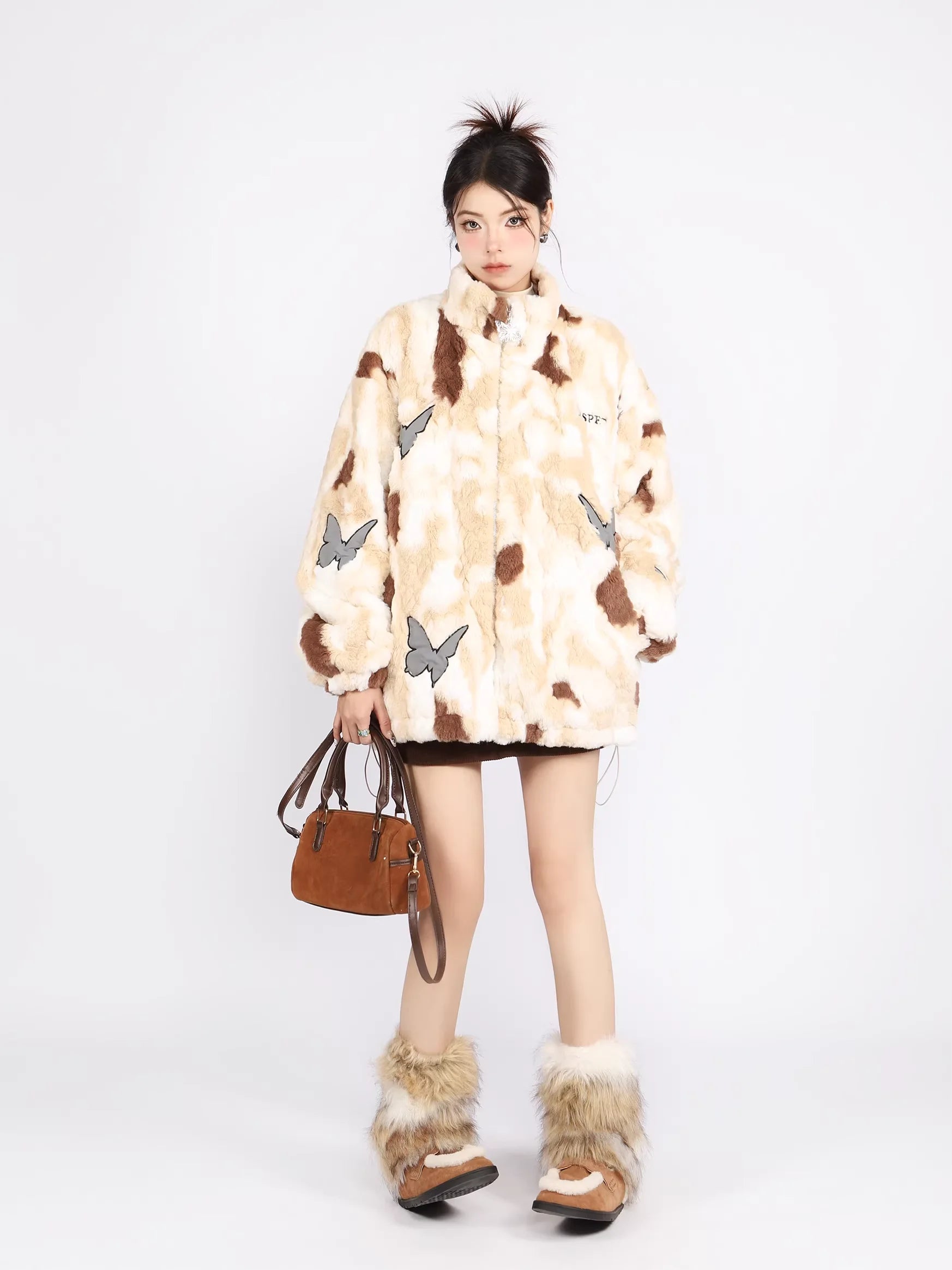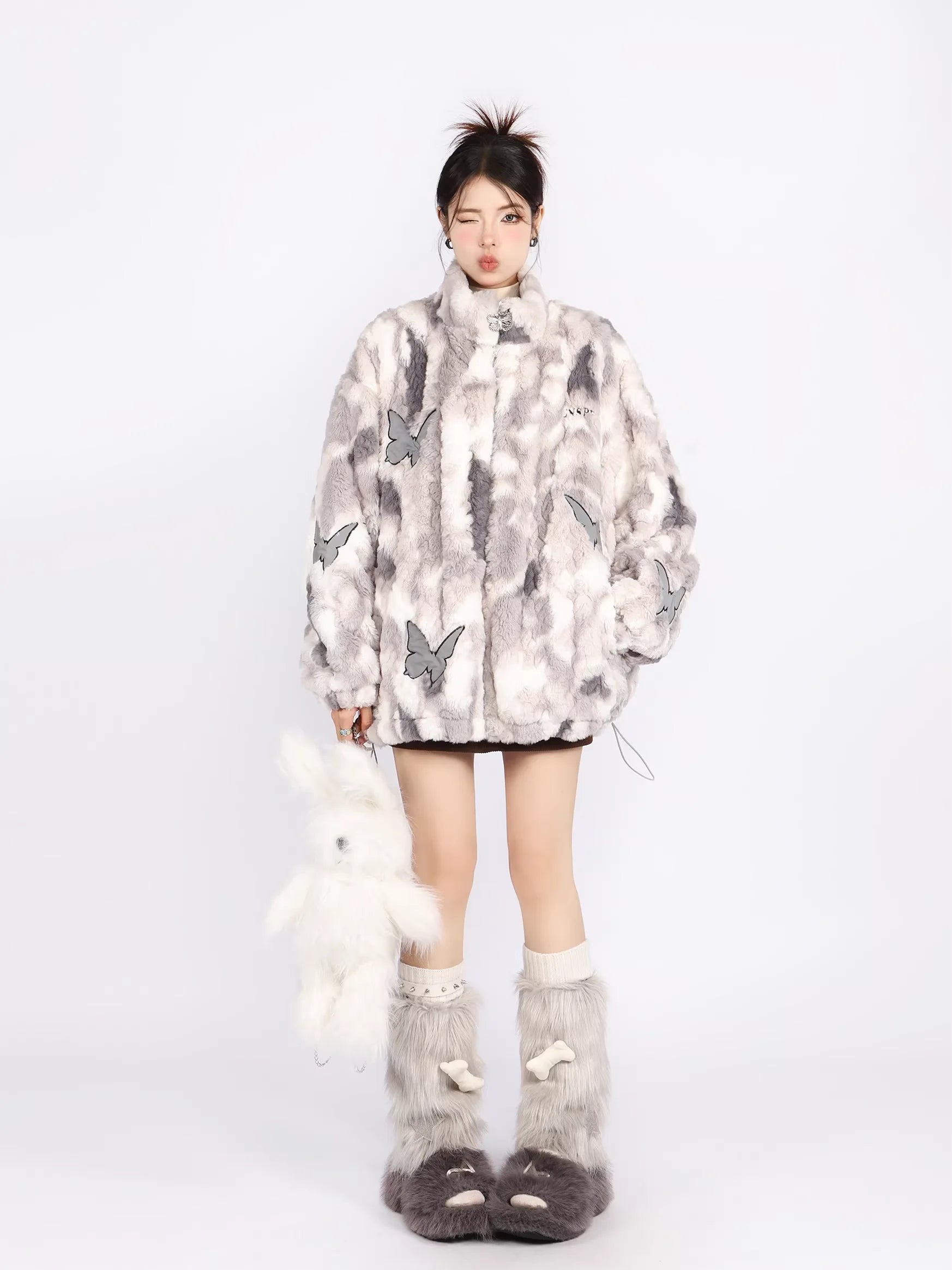 Stay cozy and stylish with this unique women's winter jacket featuring a soft faux fur construction in a whimsical tie-dye blend of off-white and gray. The oversized silhouette is embellished with reflective butterfly-shaped patches and includes a high neckline for added warmth. Subtle embroidery adds a touch of character to the overall design. Perfect for fashion-forward individuals looking to make a bold statement while keeping warm this winter.