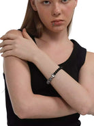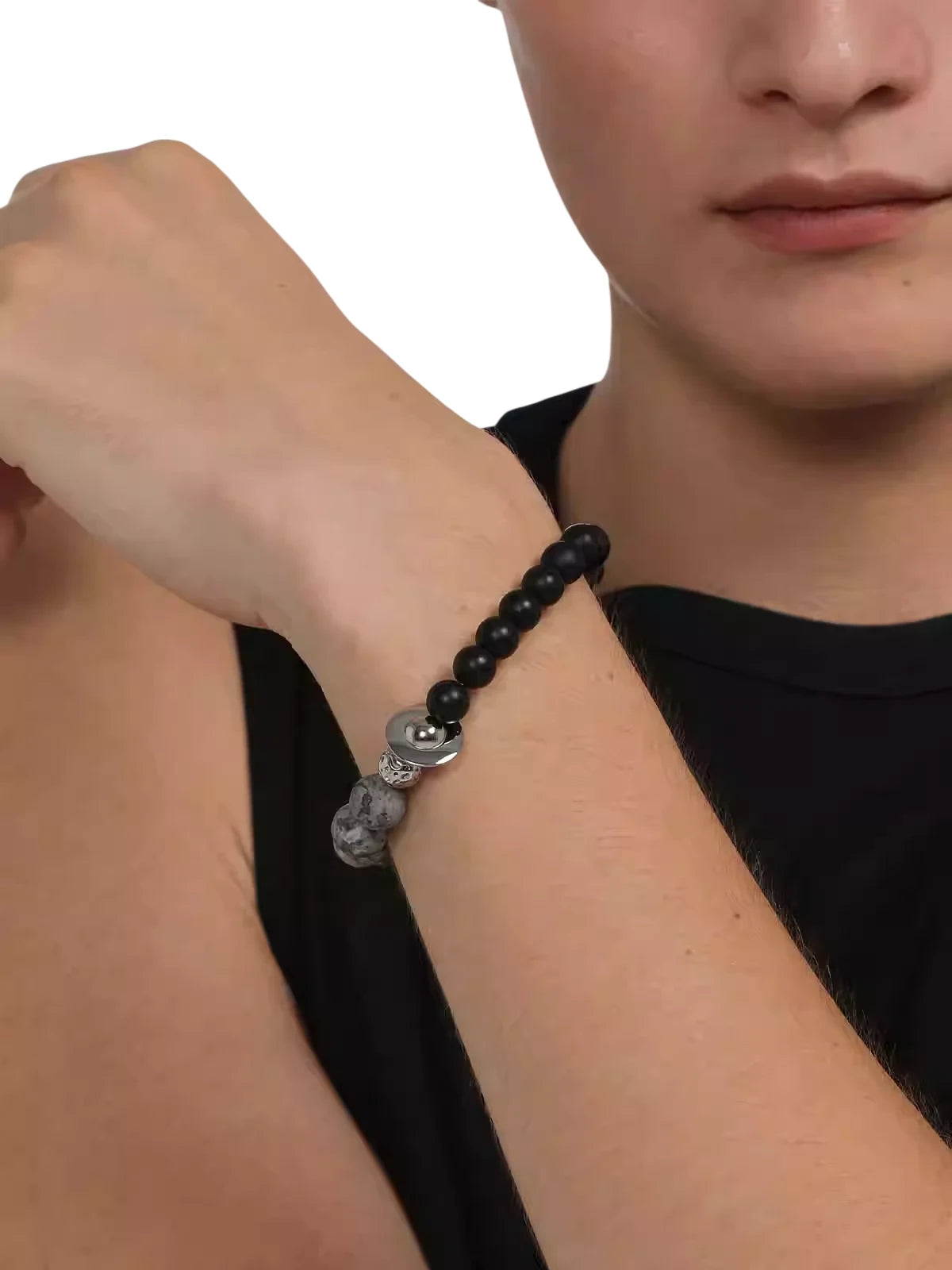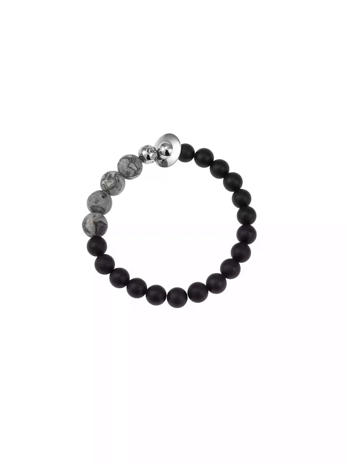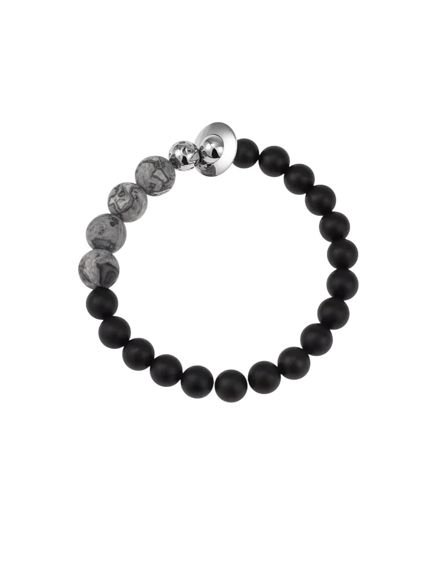 This retro-style black agate beaded bracelet combines matte and marbled gray beads for a refined, versatile look. A central metallic accent adds a modern touch, making it suitable for both casual and semi-formal occasions. Designed as a unisex accessory, it also works well as a stylish couple's bracelet.