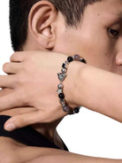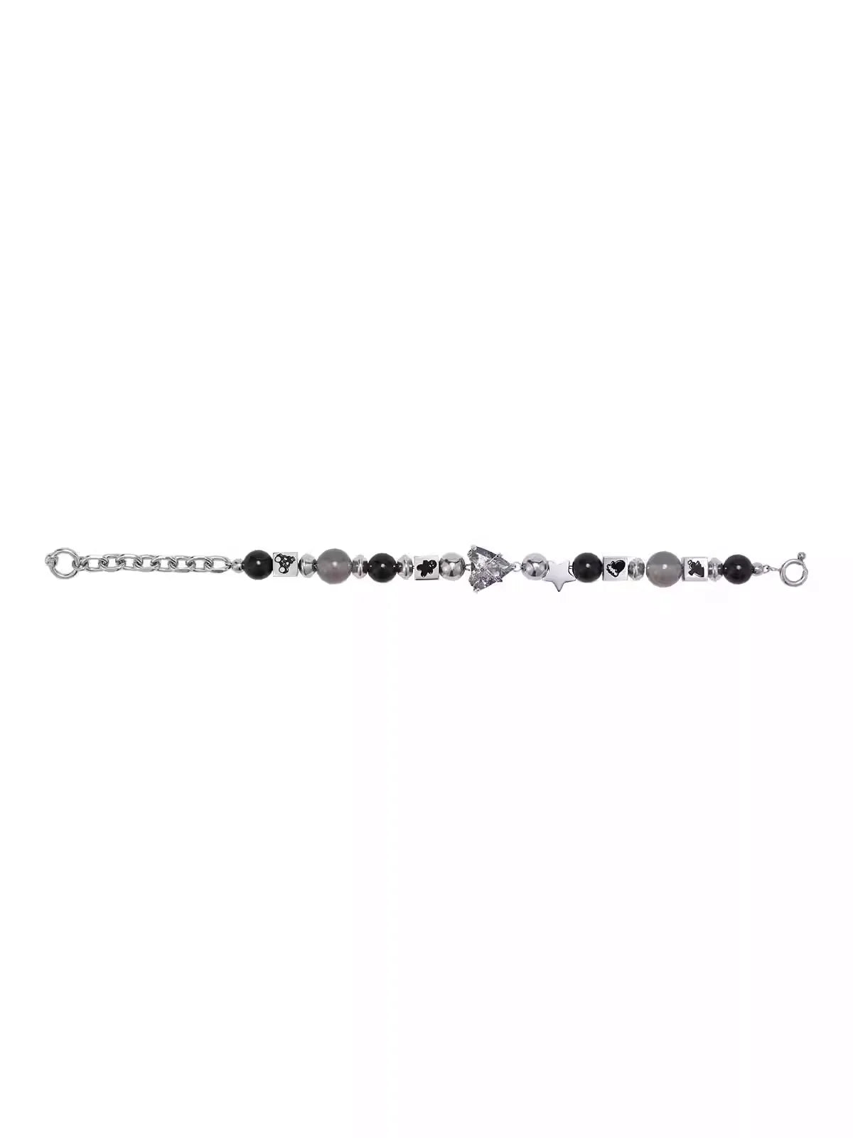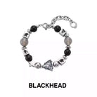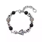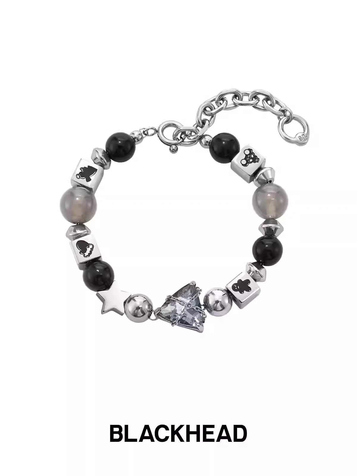 This unisex beaded bracelet features a festive and original design inspired by Christmas themes. It showcases alternating black and metallic textured beads, accented by unique cube-shaped elements engraved with playful silhouettes, such as teddy bears and basketball motifs.