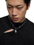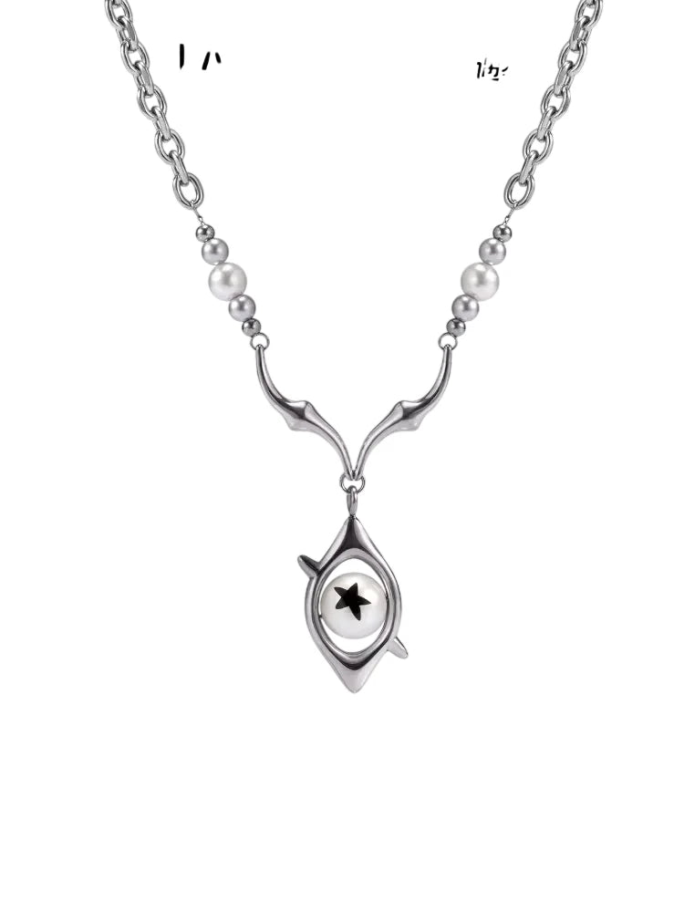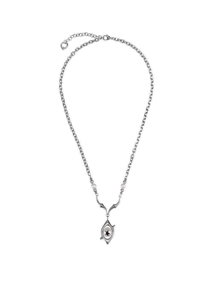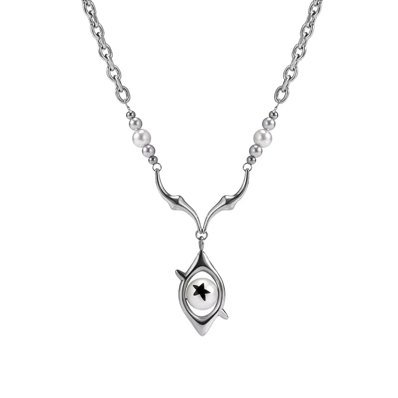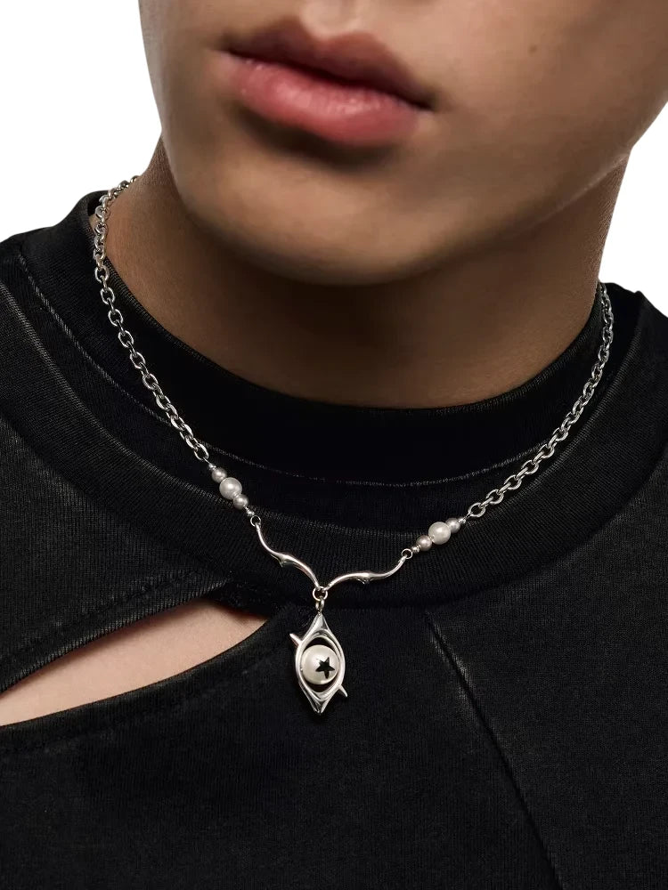 This unisex necklace features a distinctive blend of gradient pearl-like and metallic beads, arranged along a stylish chain. At its center, the necklace showcases an abstract eye-shaped pendant, housing a striking white core with a black star-like design. A unique accessory that blends modern artistry with symbolic detail, perfect for couples or as a meaningful gift.