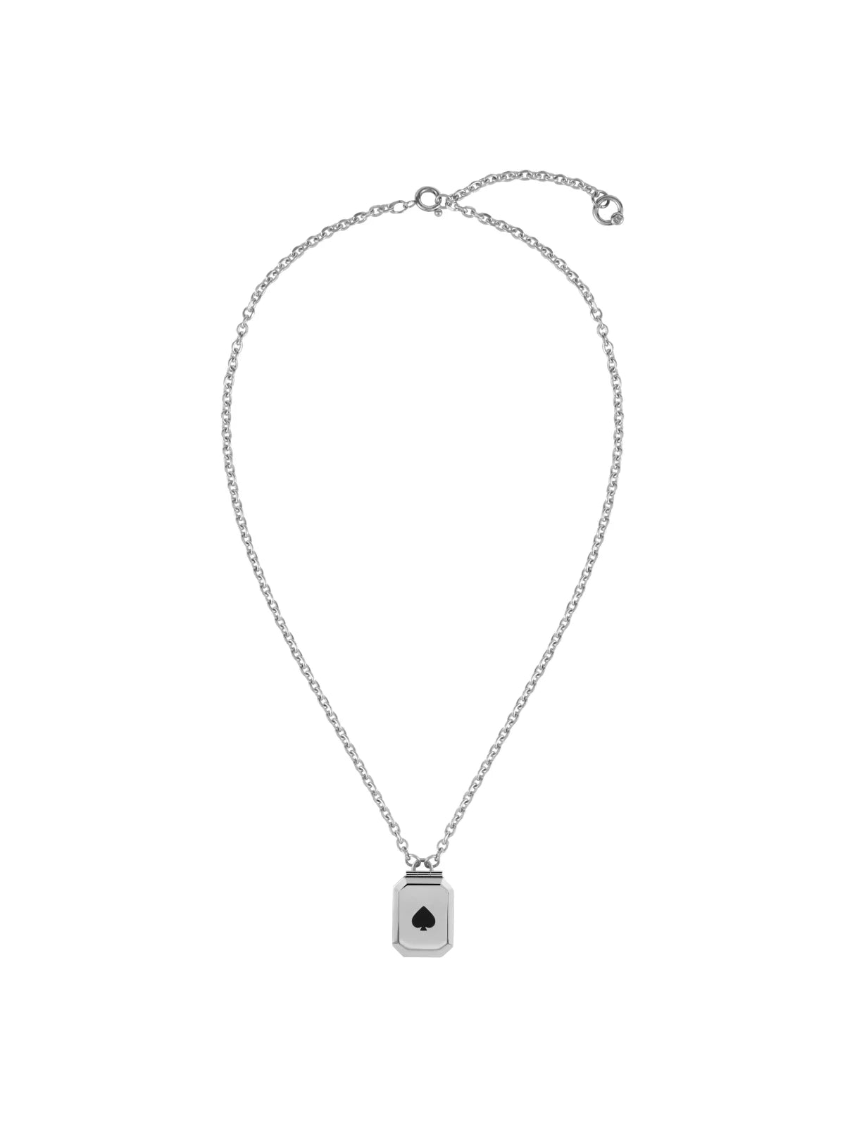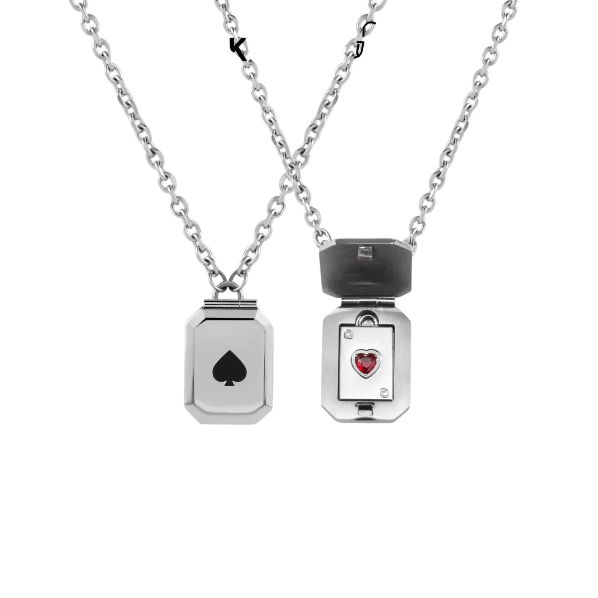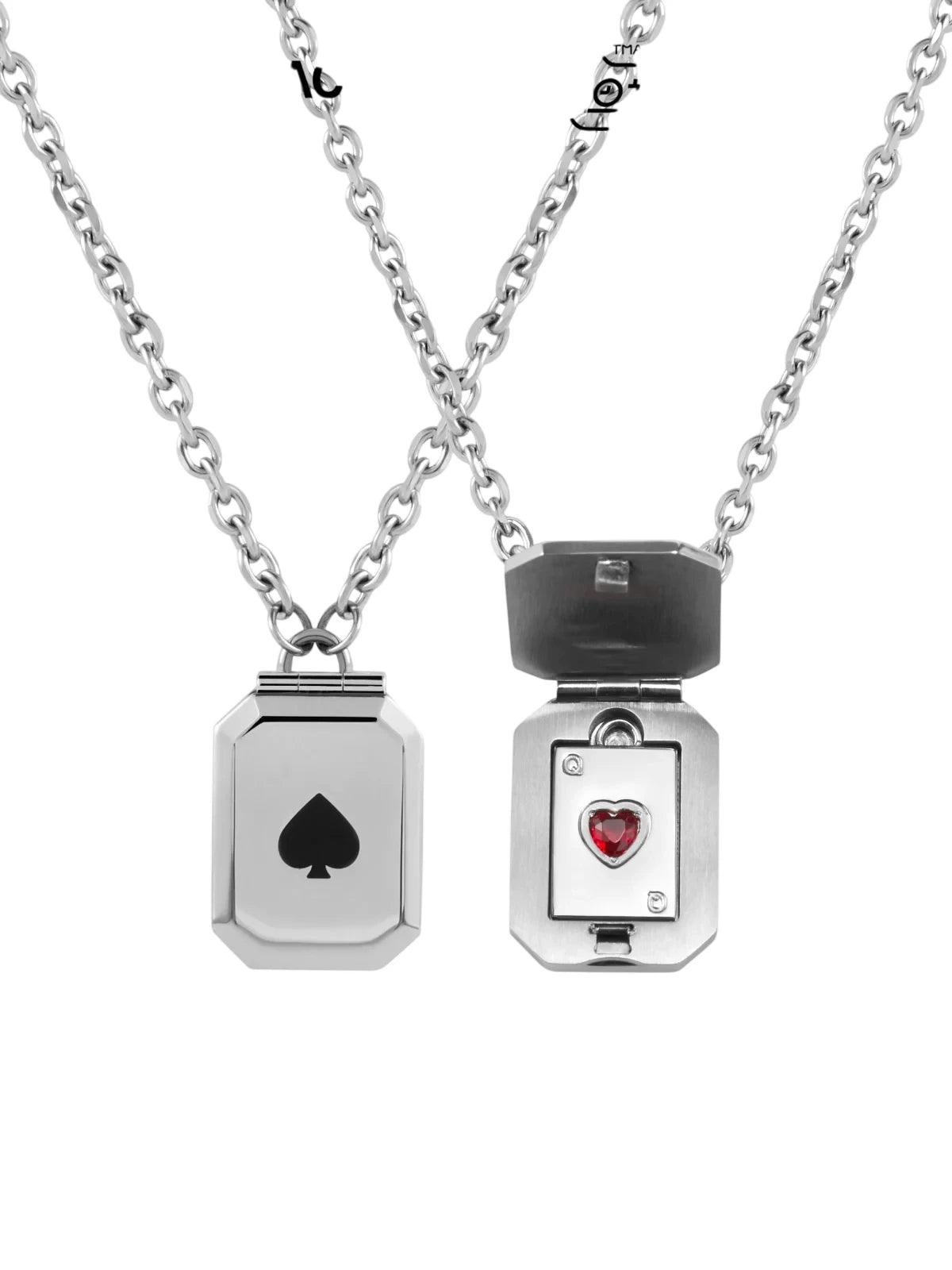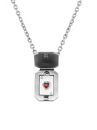 Celebrate love with this uniquely designed unisex necklace featuring a heart playing card pendant. The silver-toned locket-style pendant showcases a sleek rectangular shape with a black spade symbol on the outside. Upon opening, it reveals a detailed miniature red heart in a playing card motif, embellished with small stones for added charm. Ideal as a thoughtful gift for Valentine's Day or special occasions, this stylish necklace is perfect for couples looking for a matching accessory with symbolic meaning.