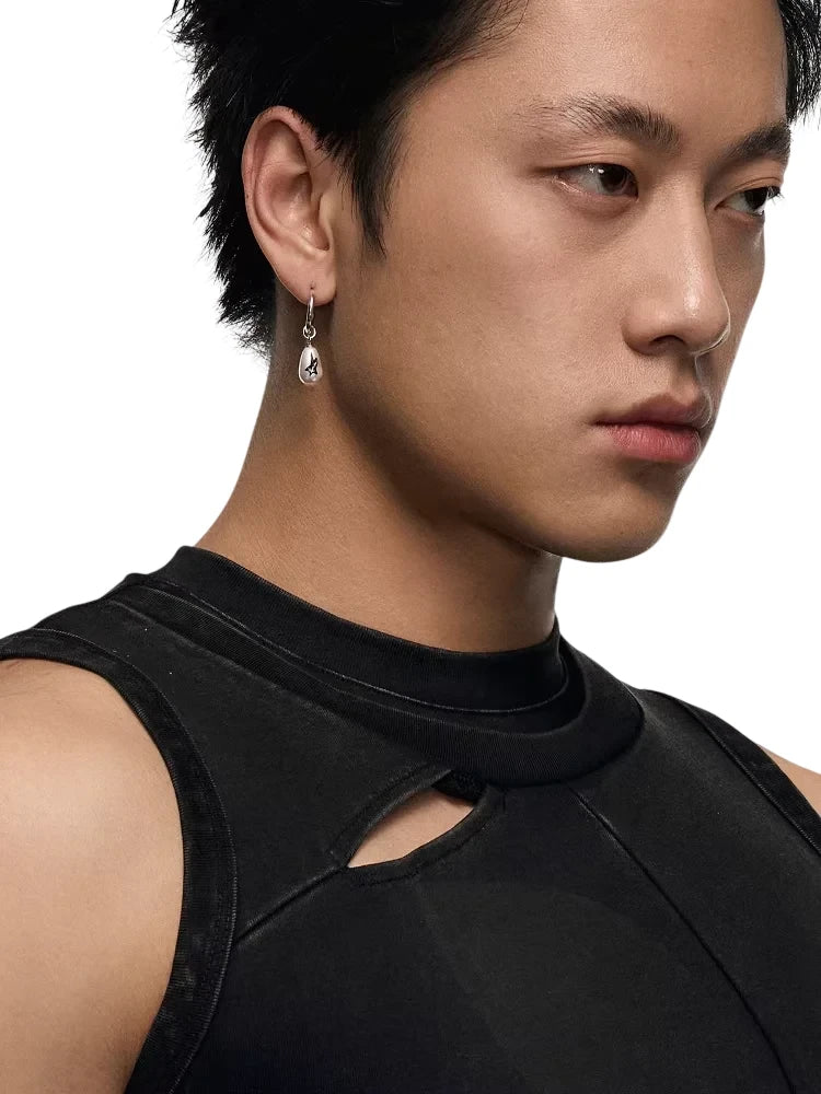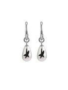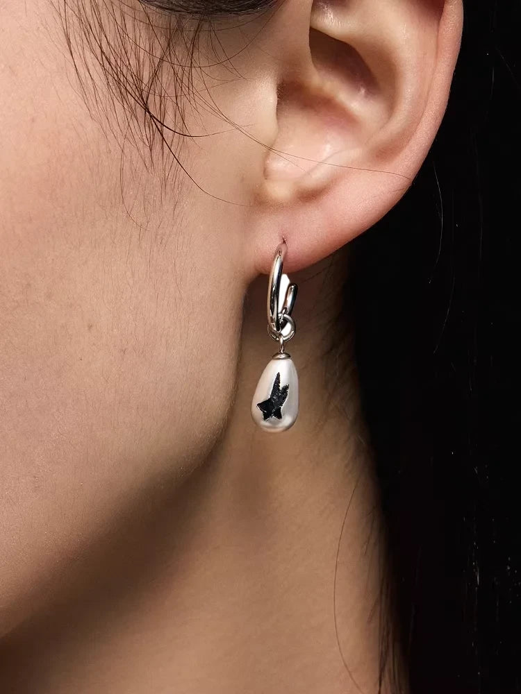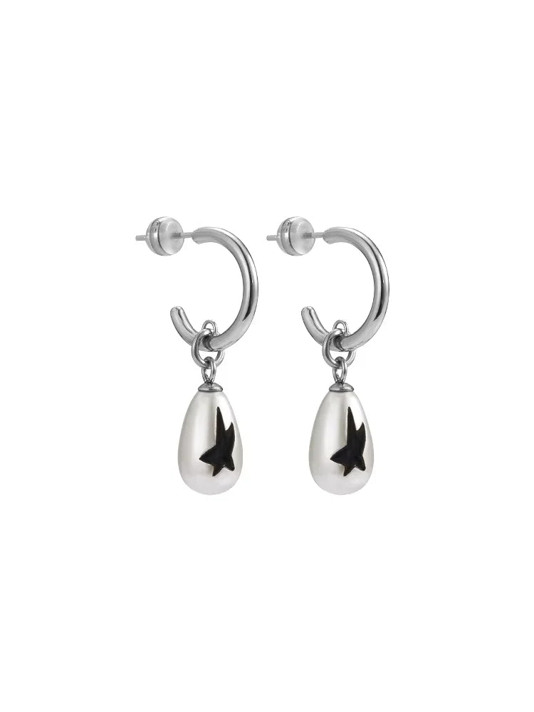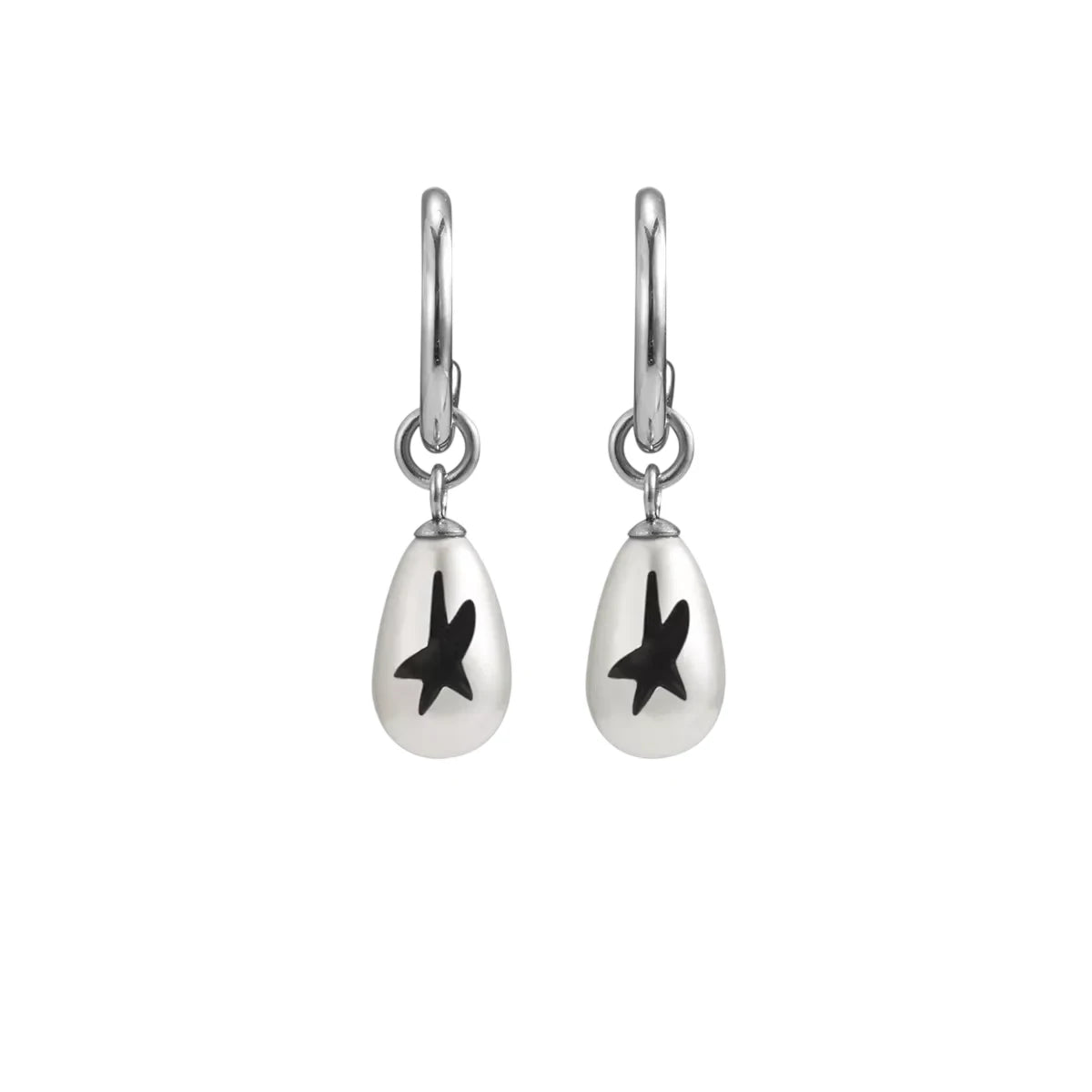 Elevate your look with these unisex minimalist hoop earrings featuring a polished silver-tone finish. A sleek teardrop-shaped charm dangles from each hoop, accented with a bold black abstract motif reminiscent of a star or bird. Designed for contemporary style enthusiasts, these earrings offer a unique blend of simplicity and artistic flair.