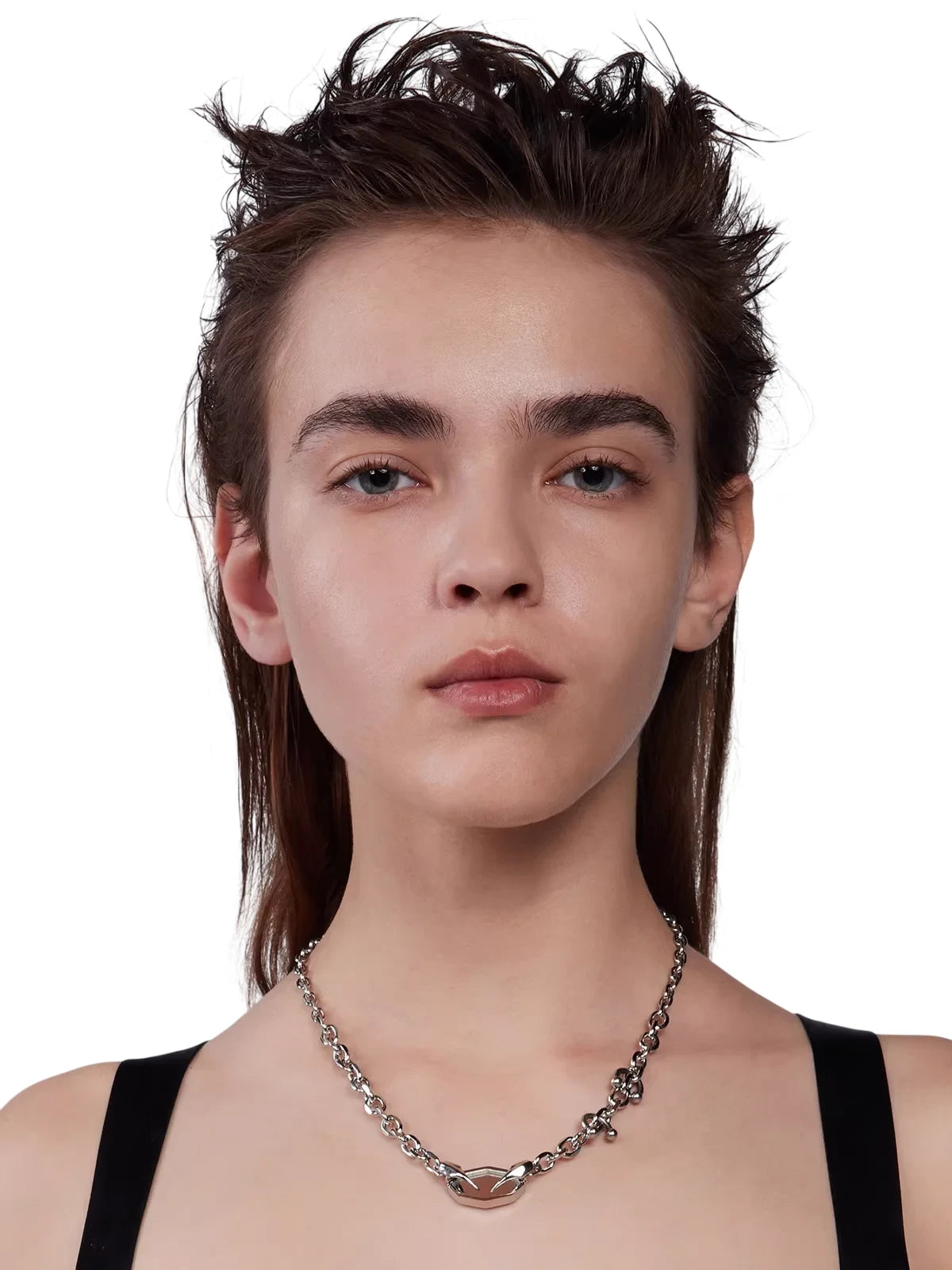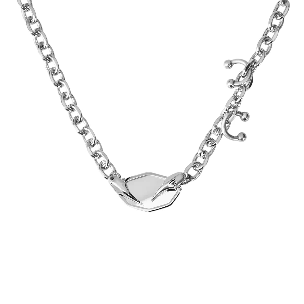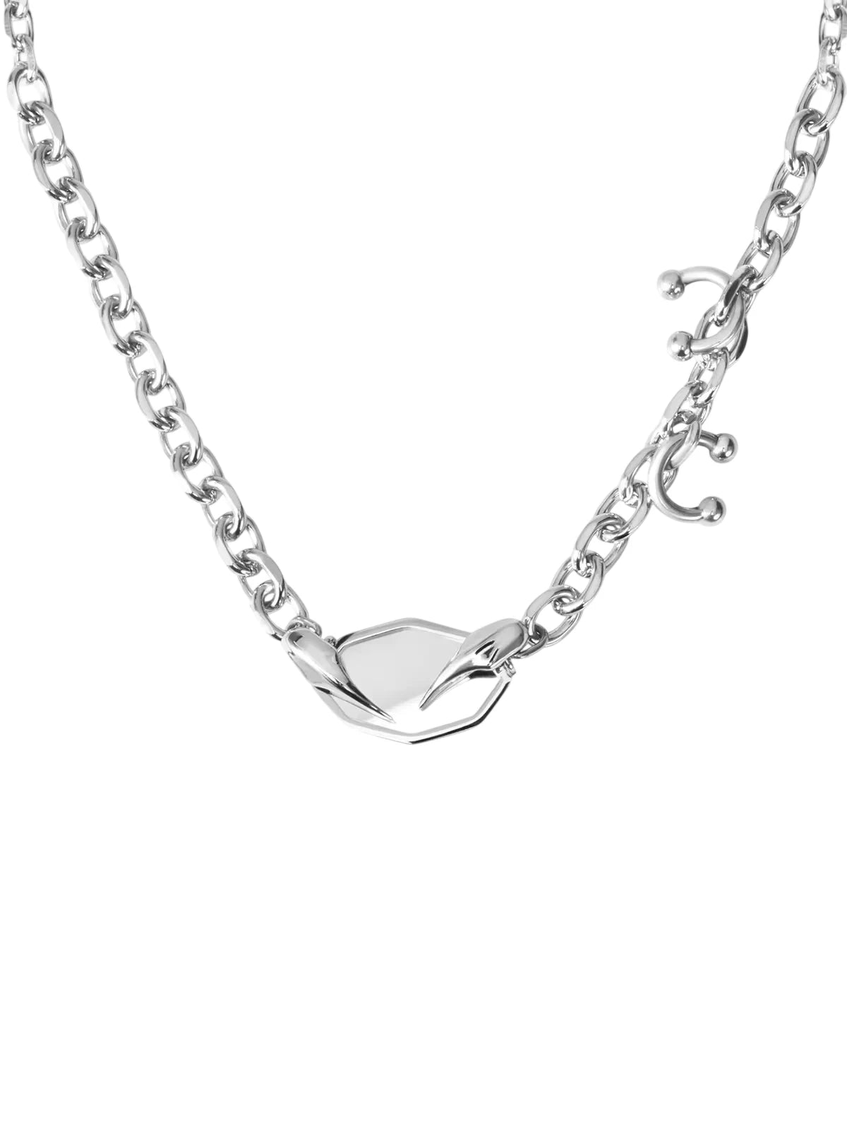 Elevate your style with this striking mirror pendant necklace, designed with a hexagonal charm gripped by claw-like elements. The chunky silver chain adds a bold, modern touch, making it perfect for street-style or alternative fashion looks. This necklace is crafted for women who appreciate edgy elegance and contemporary accessories.