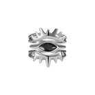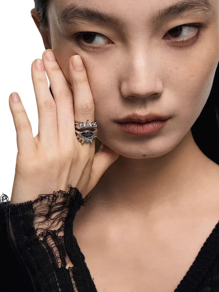 This edgy, gender-neutral ring features a striking design inspired by punk aesthetics. Crafted with a metallic silver finish, the ring showcases a bold, double-layer band structure. At its center lies a marquise-cut black gemstone framed by spiked accents above and below, forming an abstract eye motif. A unique accessory perfect for making a statement this spring and summer.