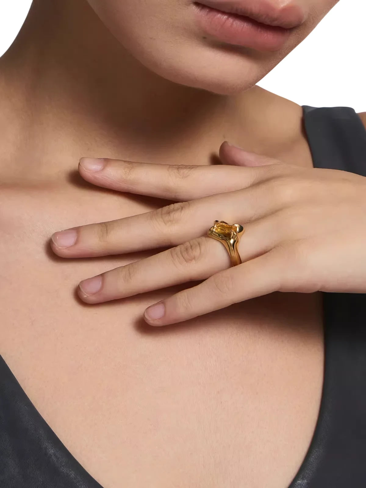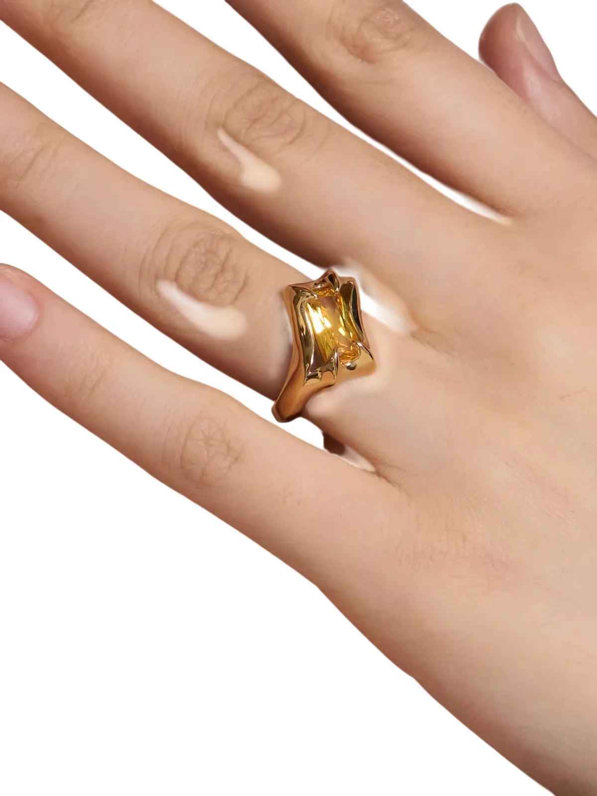 This unisex gold ring features a bold, sculptural design with a rectangular, faceted yellow zircon gemstone. The asymmetrical setting adds an edgy, modern touch, making it a standout accessory for fashion-forward individuals. Suitable for those seeking a distinctive statement piece, the ring combines contemporary styling with artistic flair.