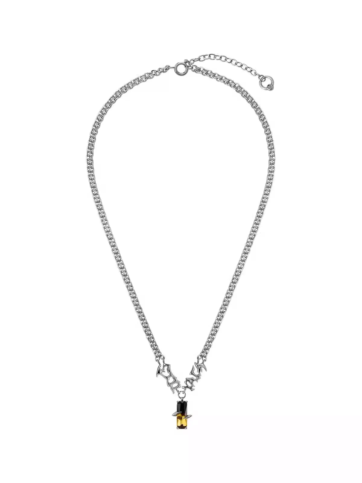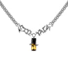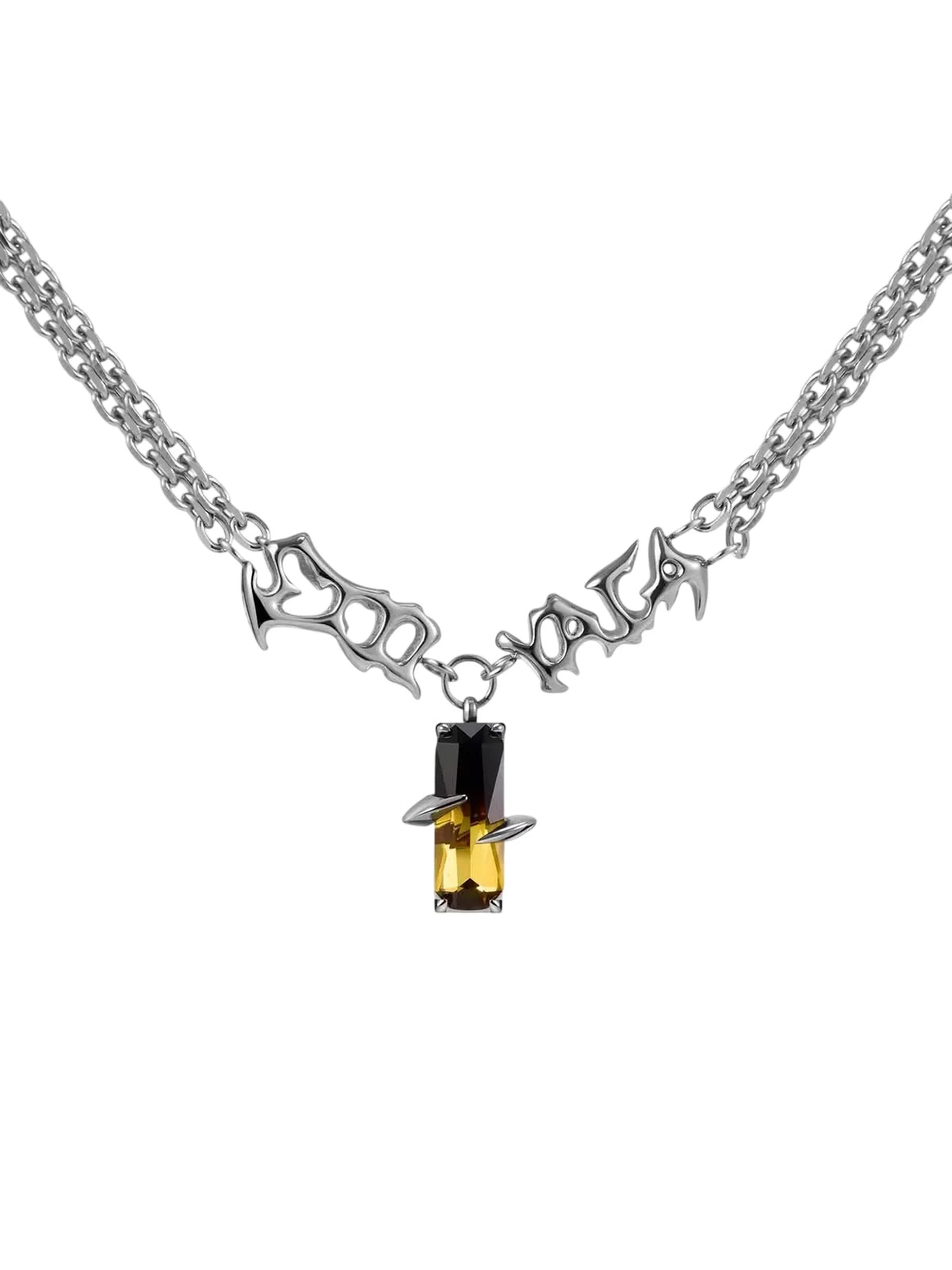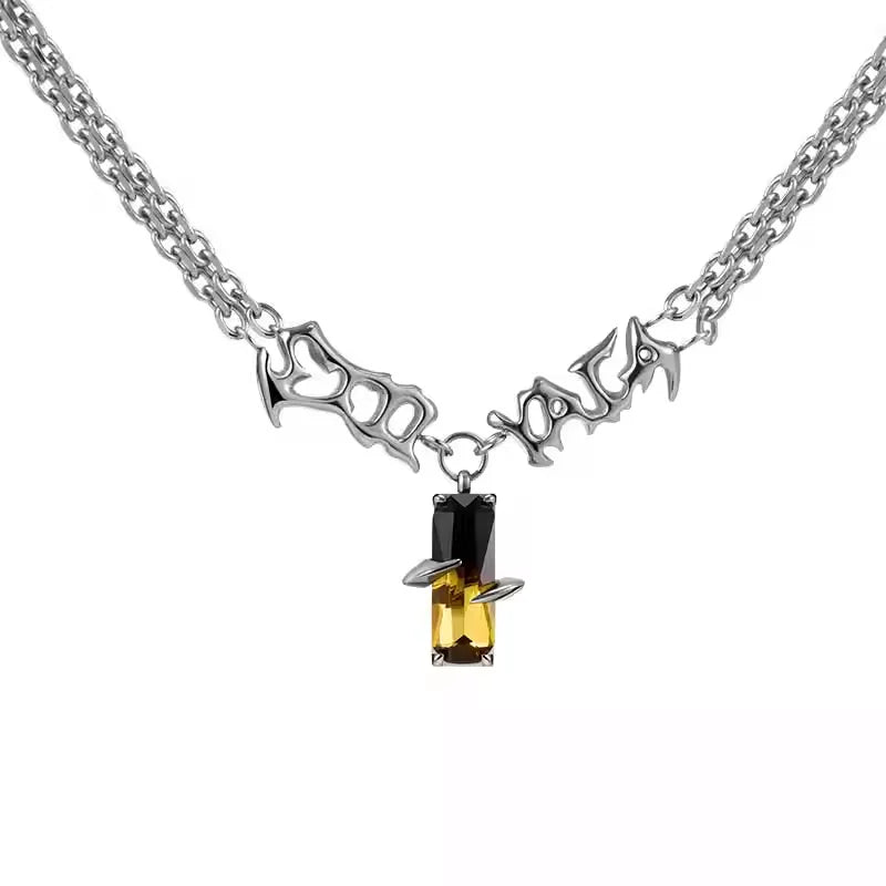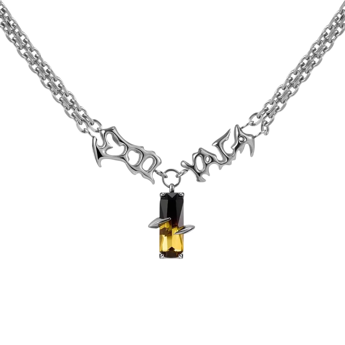This unisex necklace features a bold chain design accented by sculpted metallic text detailing. At its center hangs a striking pendant crafted from black and amber-toned crystals, securely held by claw-like prongs for a strong, punk-inspired look. With its unique gradient color scheme and edgy aesthetic, this necklace is perfect for making a fashion-forward statement.
