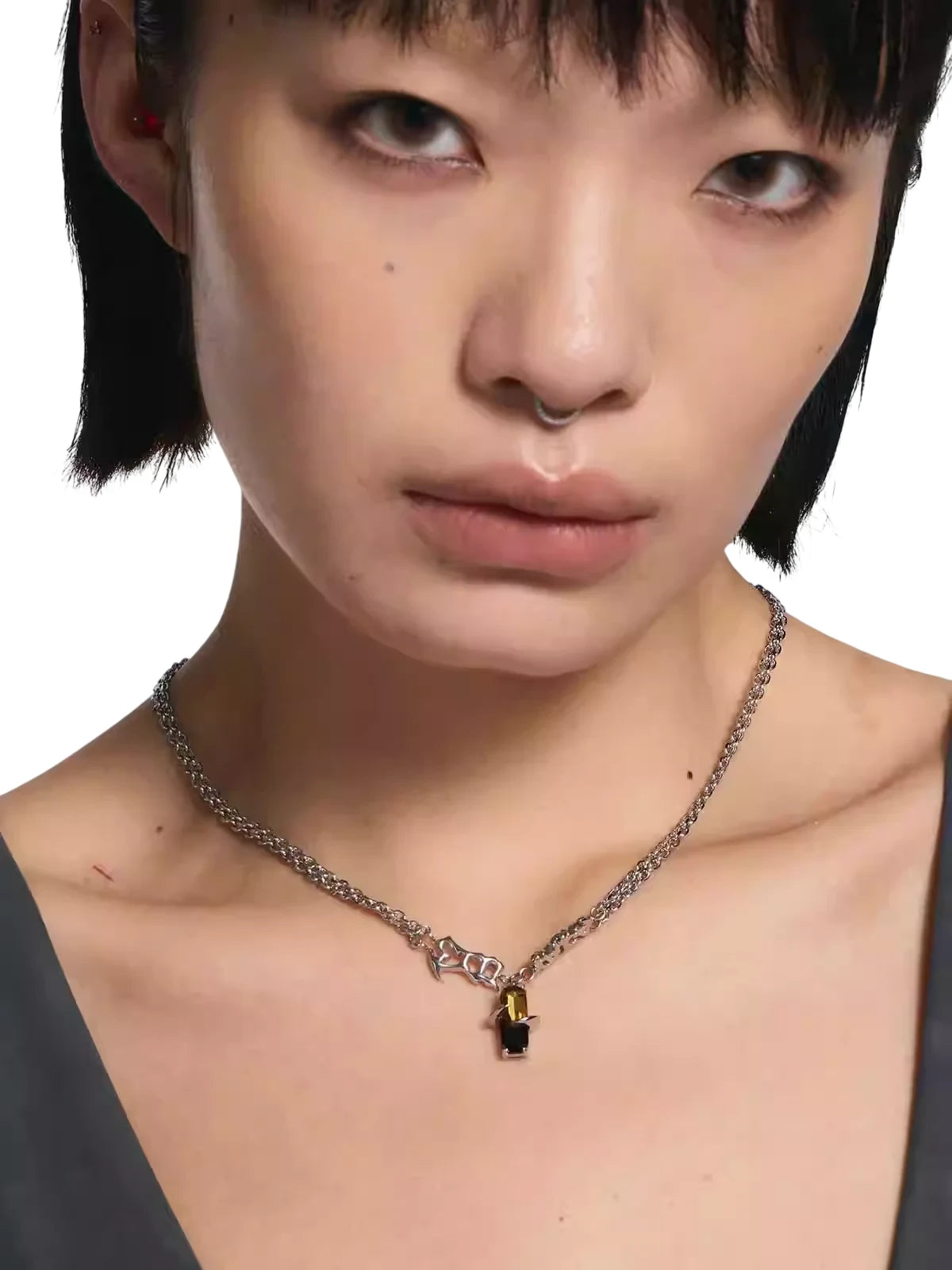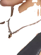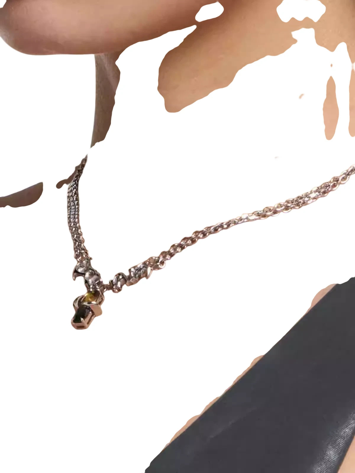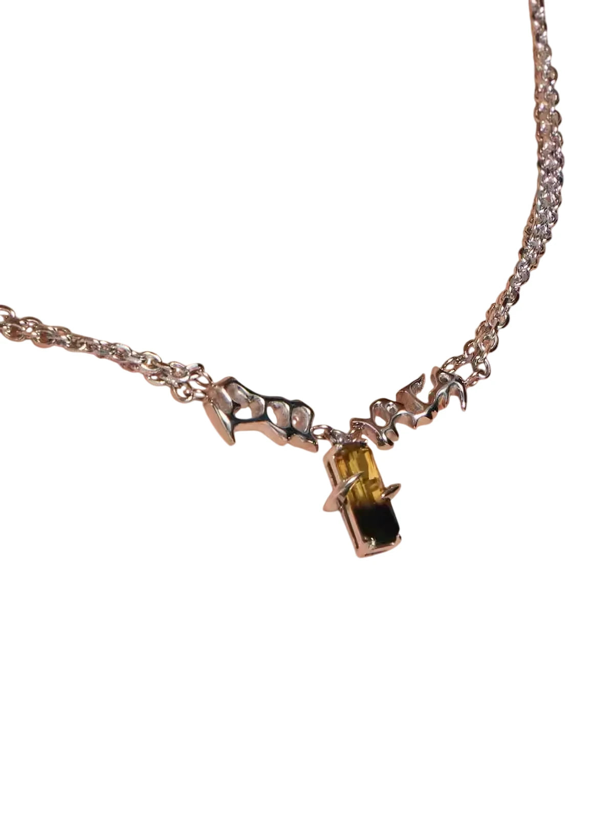 This unisex necklace features a bold chain design accented by sculpted metallic text detailing. At its center hangs a striking pendant crafted from black and amber-toned crystals, securely held by claw-like prongs for a strong, punk-inspired look. With its unique gradient color scheme and edgy aesthetic, this necklace is perfect for making a fashion-forward statement.