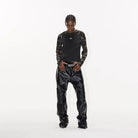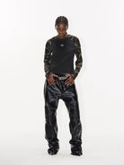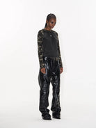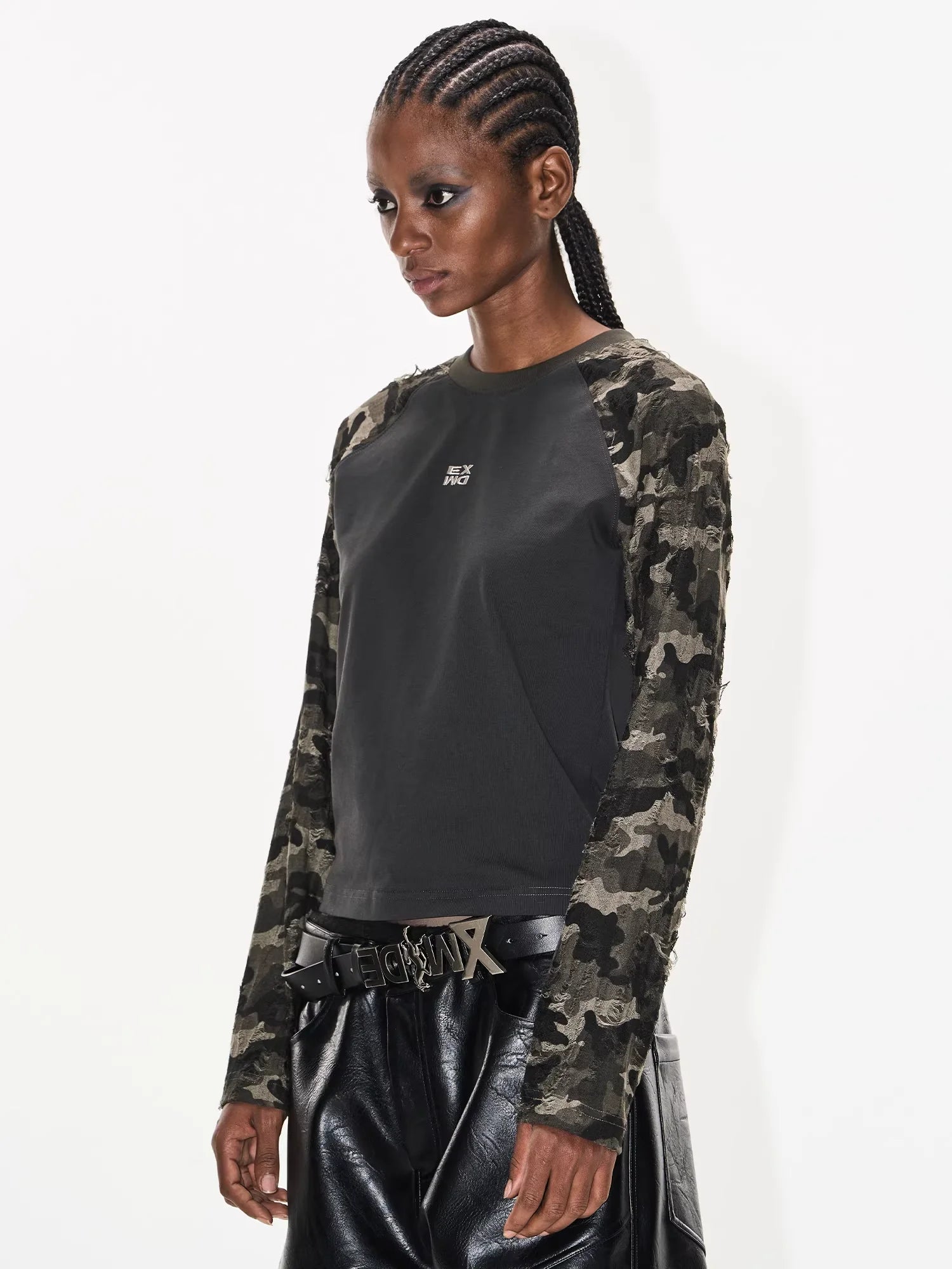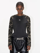 This women's cropped long sleeve t-shirt features a bold, streetwear-inspired design. The black fitted body is contrasted by camouflage-patterned raglan sleeves, creating a dynamic colorblock effect. A small embroidered logo at the chest center adds an urban edge to the look. Perfect for layering or as a statement piece, this top blends comfort with contemporary style.