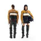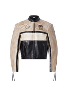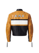 This colorblock motorcycle jacket features a bold combination of mustard yellow, black, and white panels, creating a striking and modern look. Designed with a detachable structure, it offers versatility and comfort. The female model showcases the front, adorned with detailed chest patches and styled with a black pleated mini skirt and tall matching leather boots. The male model highlights the back, displaying an 'E.M.D' graphic and coordinating pants with intricate patchwork. Ideal for making a statement with edgy streetwear flair.
