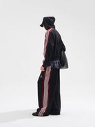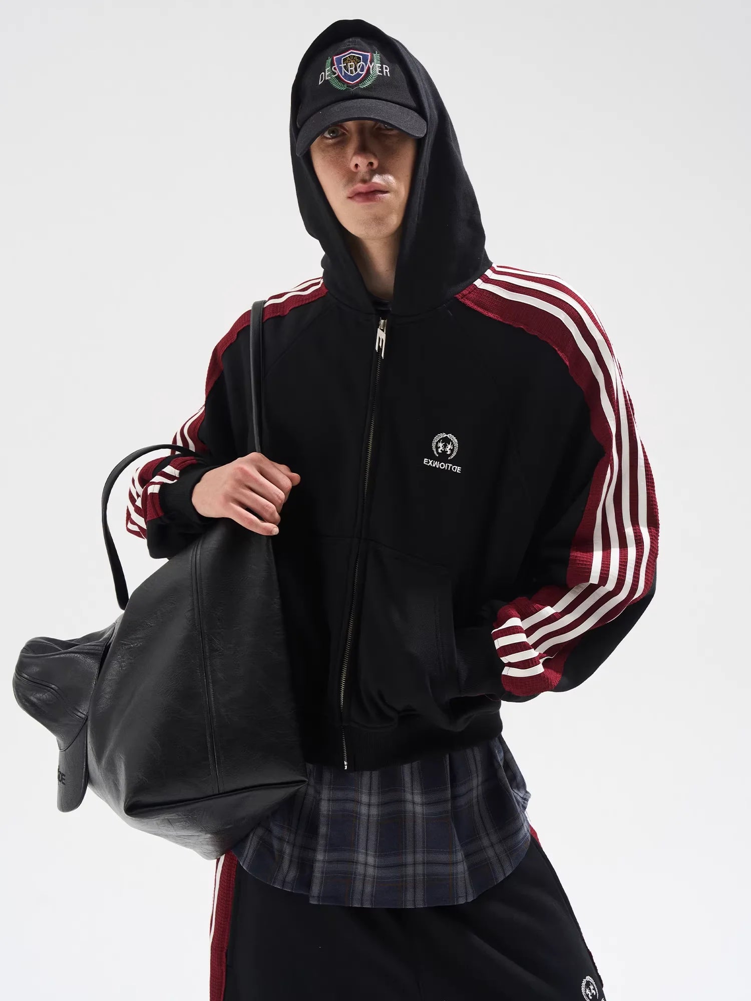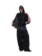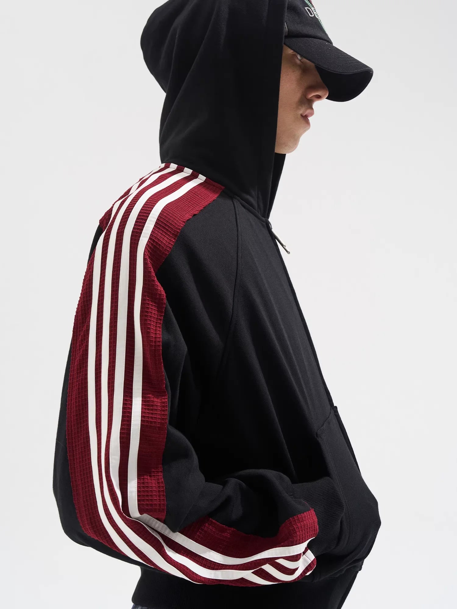 This men's zip-up hoodie jacket features a bold colorblock design with maroon and white stripes running along the shoulders and sleeves. The raw edge detailing adds a contemporary touch, while the loose fit ensures comfort and ease of movement. Designed with a functional hood and a front zip closure, it's perfect for a modern casual look. A subtle chest emblem offers added visual interest.