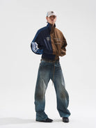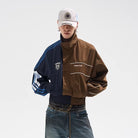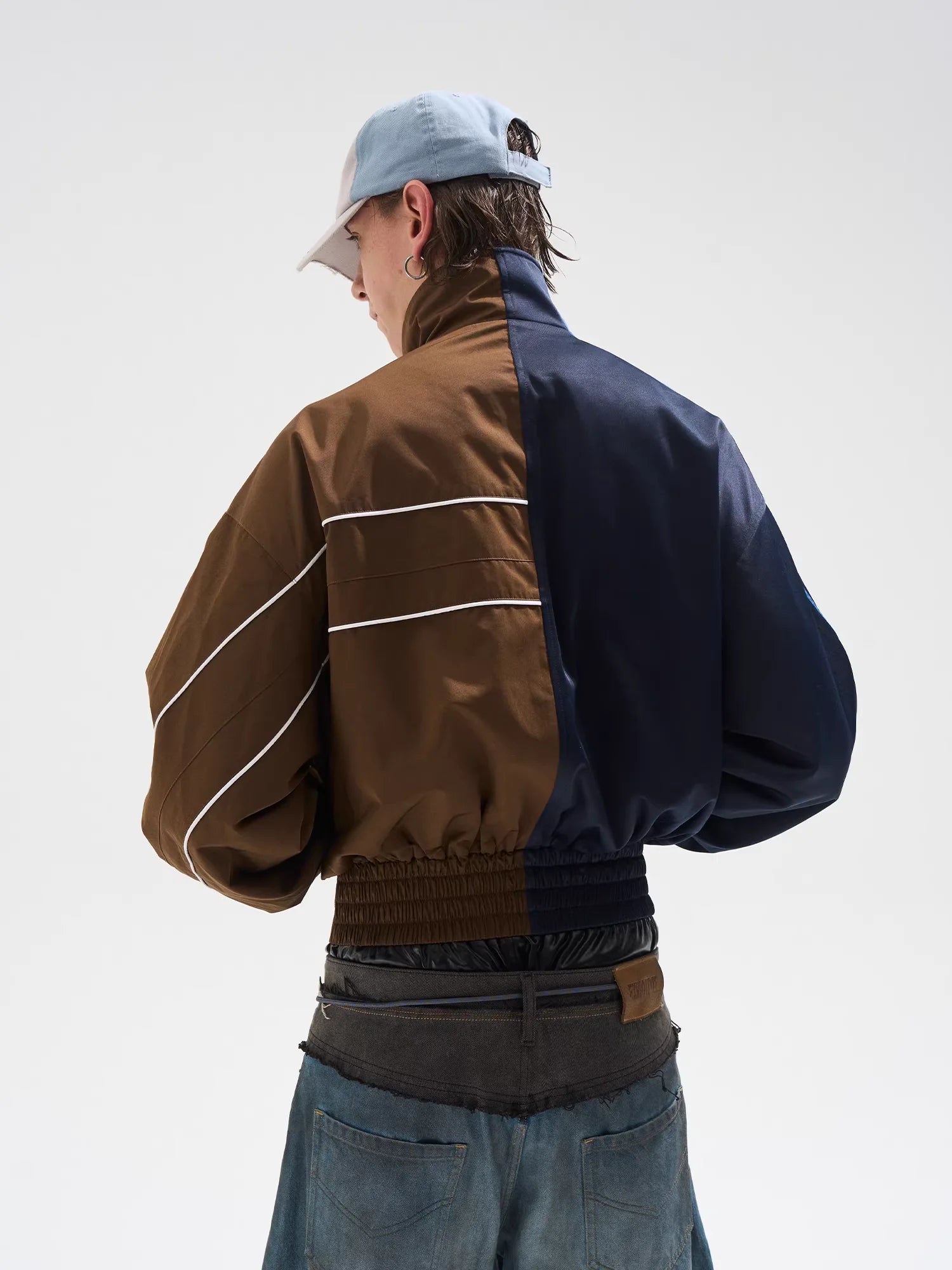 Elevate your streetwear style with this men's colorblock cropped sports jacket, designed in a distinctive yin-yang layout. The left side features navy blue tones with sporty blue and white stripes on the sleeve and a classic crest-style logo on the chest. The right half contrasts with warm brown hues, highlighted by white piping and bold branded lettering. Finished with a high collar, elastic cuffs, and a zip-up front, this jacket offers both comfort and attitude. Perfect for making a fashion statement on cooler days.