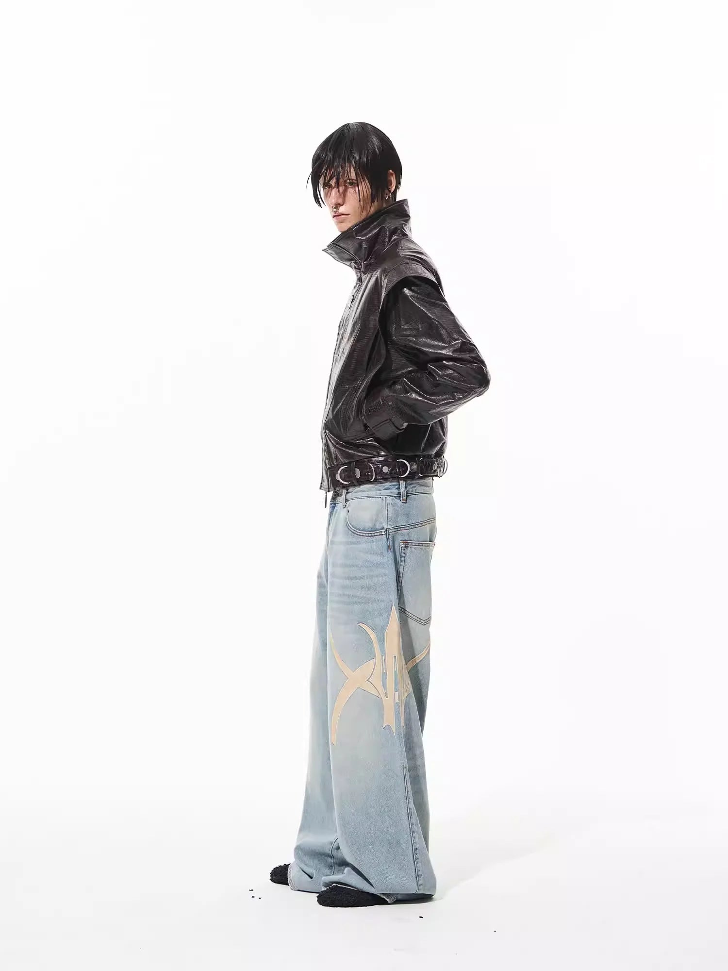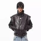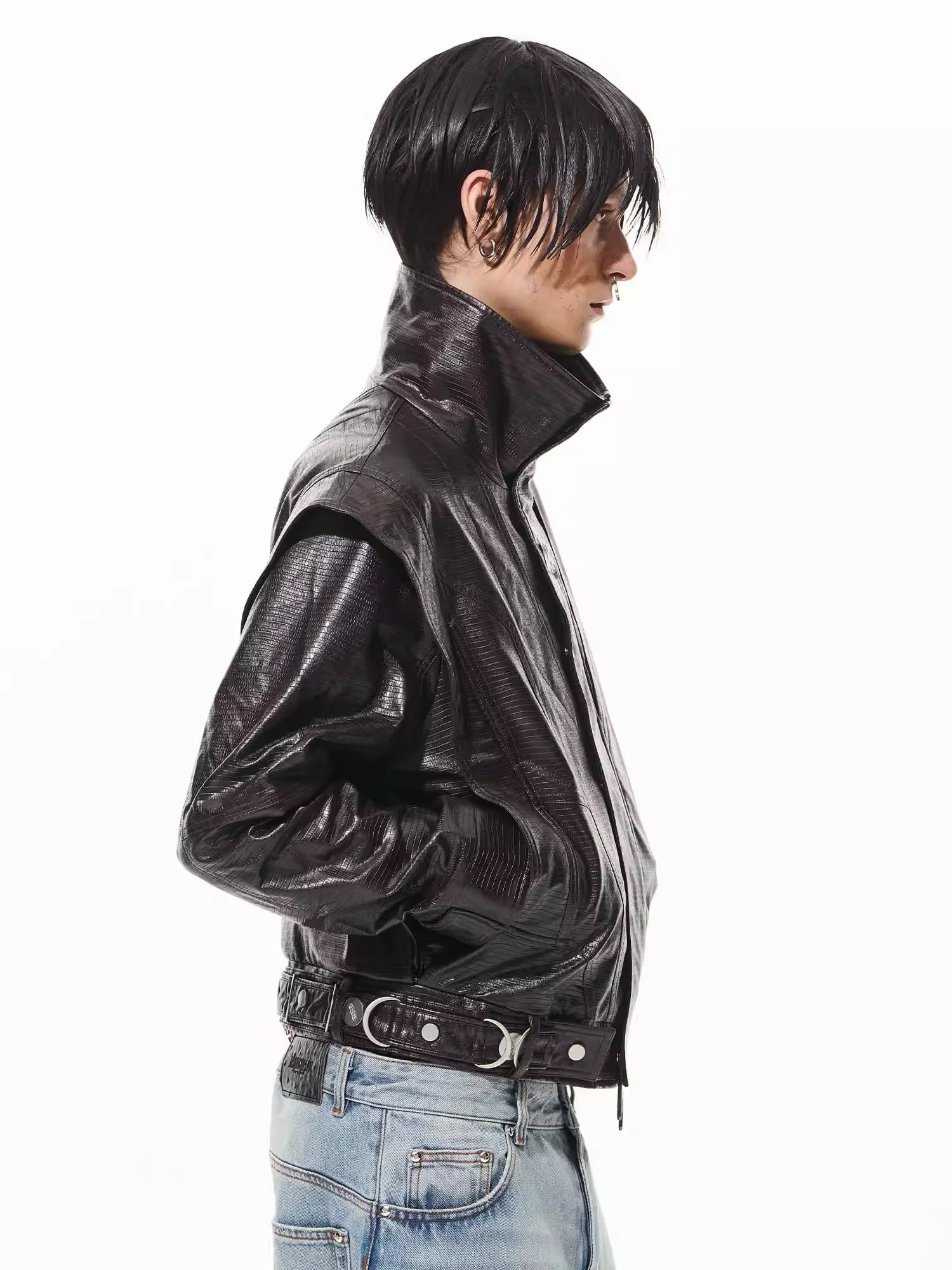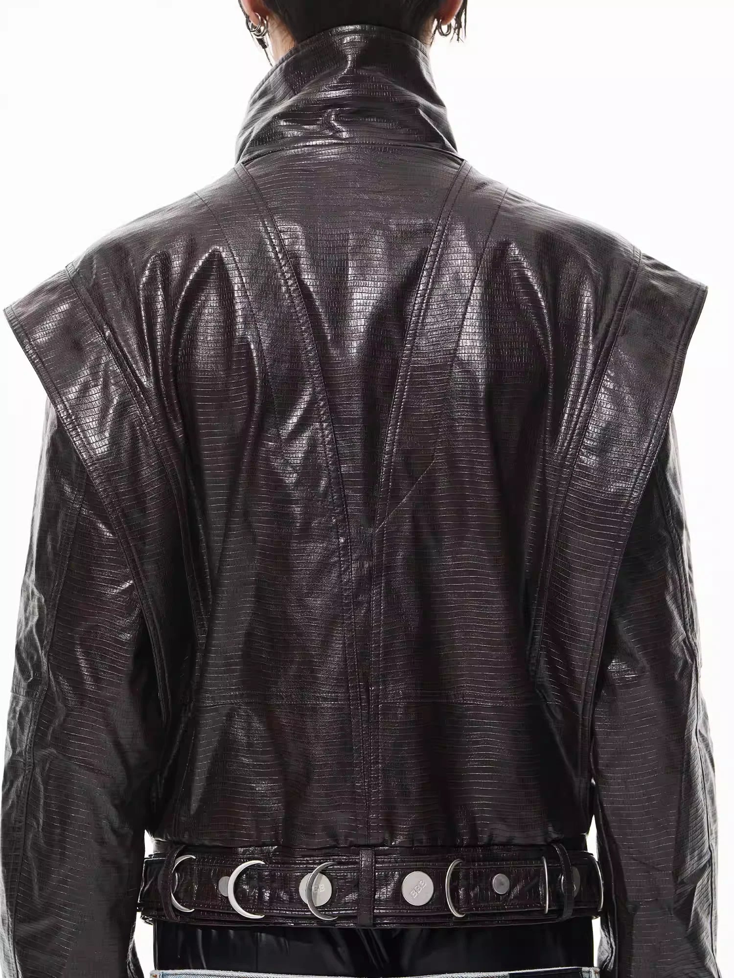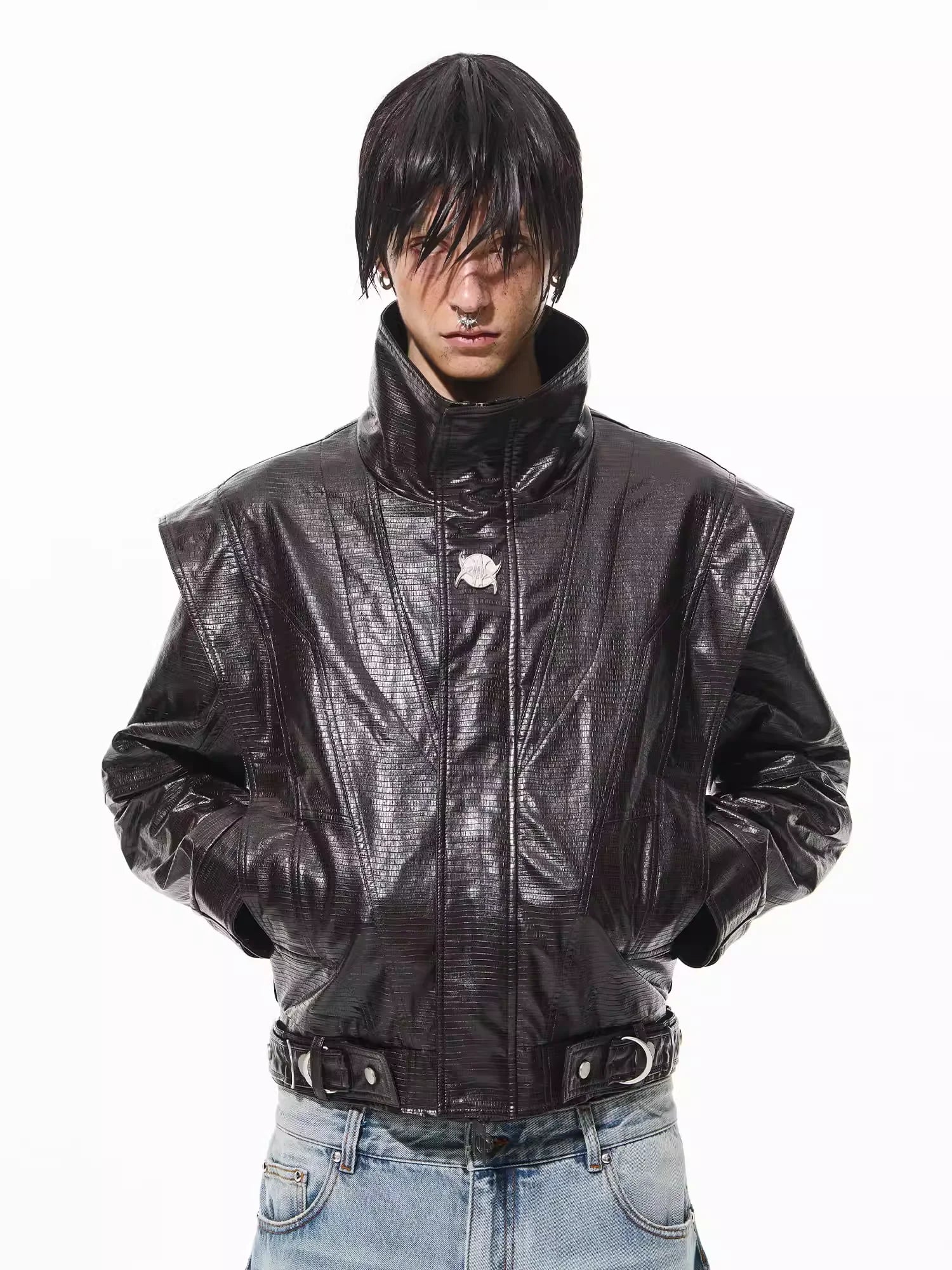 Make a bold statement with this high-end faux leather jacket designed for men. Featuring a glossy black crocodile pattern finish, this jacket is structured with a high collar and sharp, angular shoulders for a commanding silhouette. The heavy-duty metal belt with silver eyelets adds a functional and stylish detail, while the overall construction ensures durability and a premium look. Ideal for streetwear enthusiasts seeking a standout piece for their wardrobe.