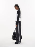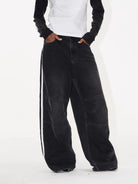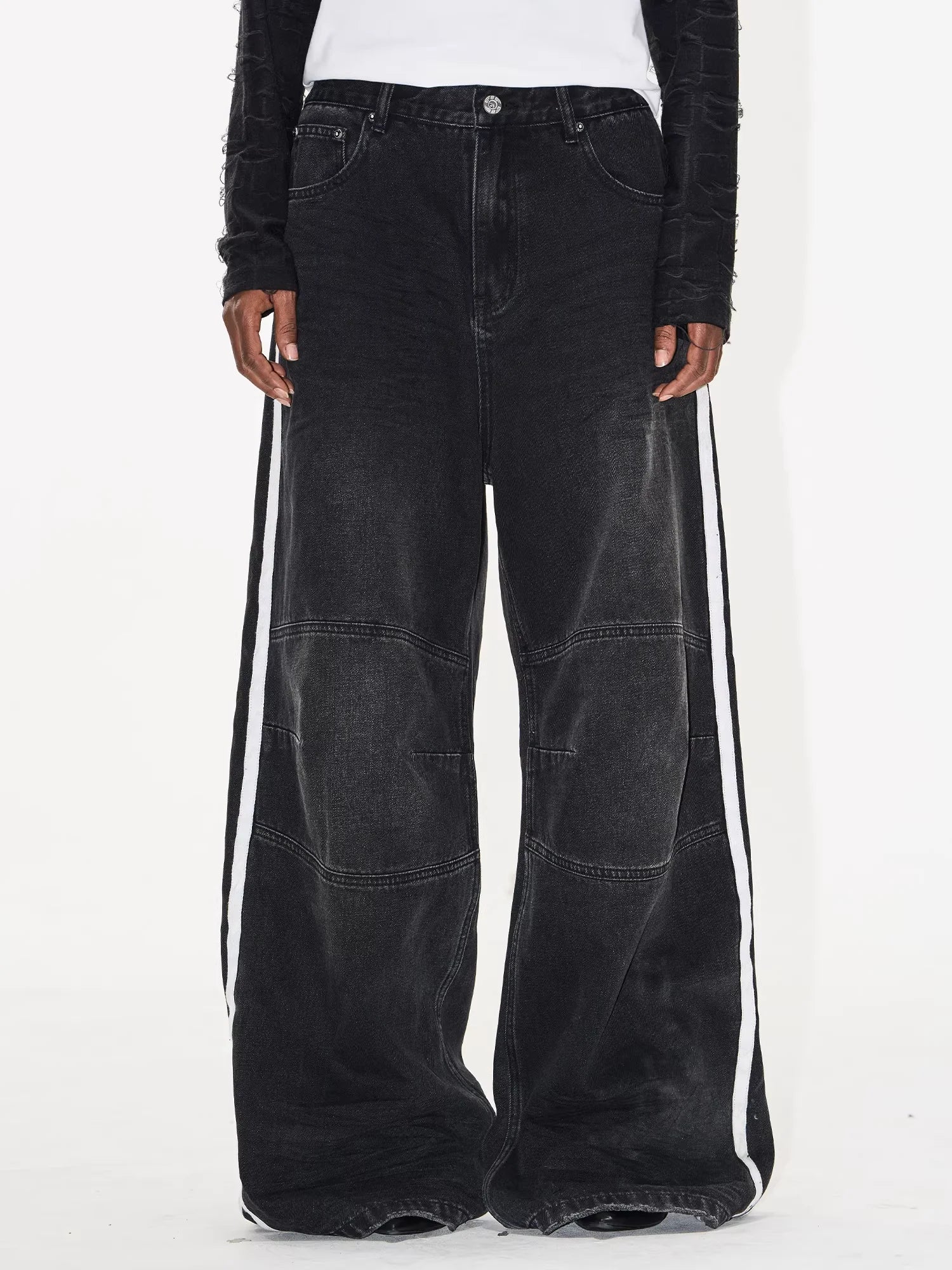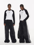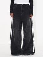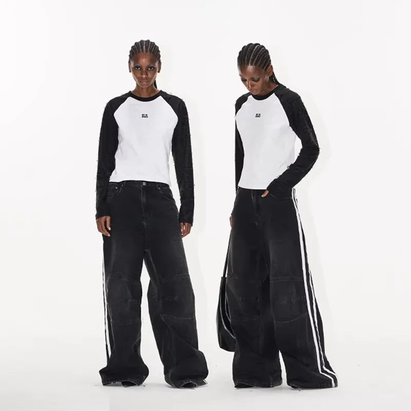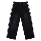 Elevate your casual wardrobe with these women's distressed wide-leg denim pants. Designed with a bold colorblock style and accented with sporty double white side stripes, these pants blend athletic vibes with streetwear aesthetics. The loose, flared silhouette offers both comfort and a fashion-forward look, making them perfect for relaxed, everyday wear.