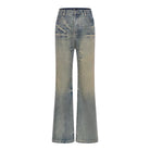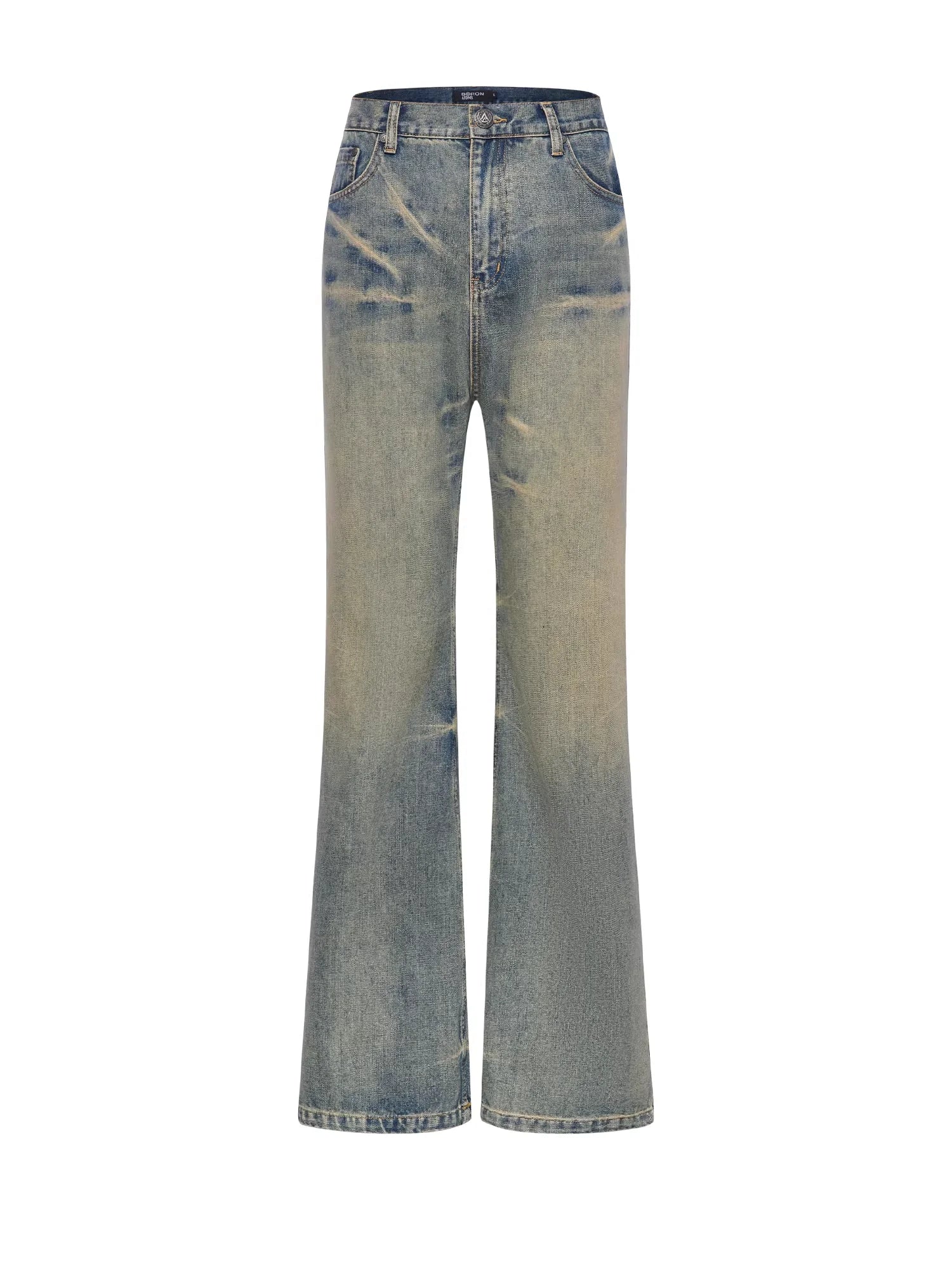 Embrace retro-inspired style with these women's distressed flared jeans, featuring a vintage washed finish for a worn-in look. The denim showcases a subtle gradient fade from dark to light across the thighs and knees, enhancing its lived-in appeal. Designed with a high-rise waist and wide-leg silhouette, they offer both comfort and a flattering fit. Classic five-pocket construction, a button closure, and zip fly complete the timeless design, making these jeans a versatile addition to any casual wardrobe.