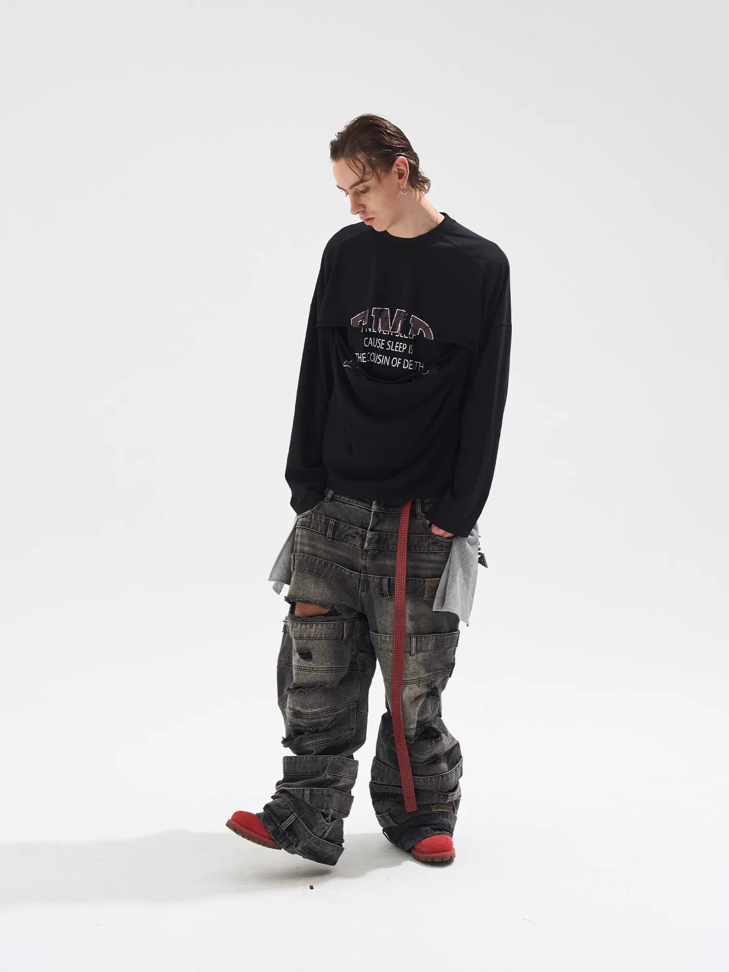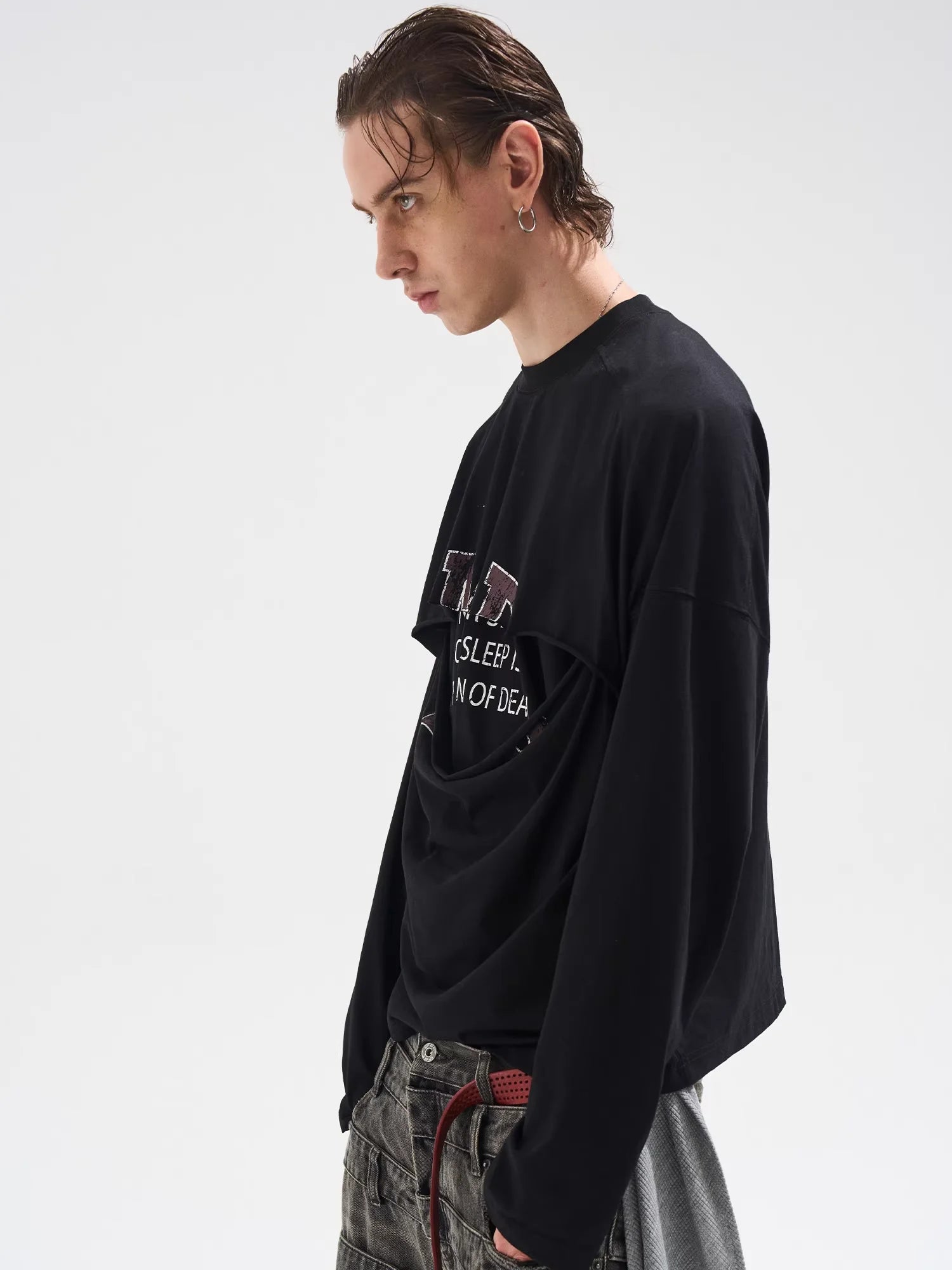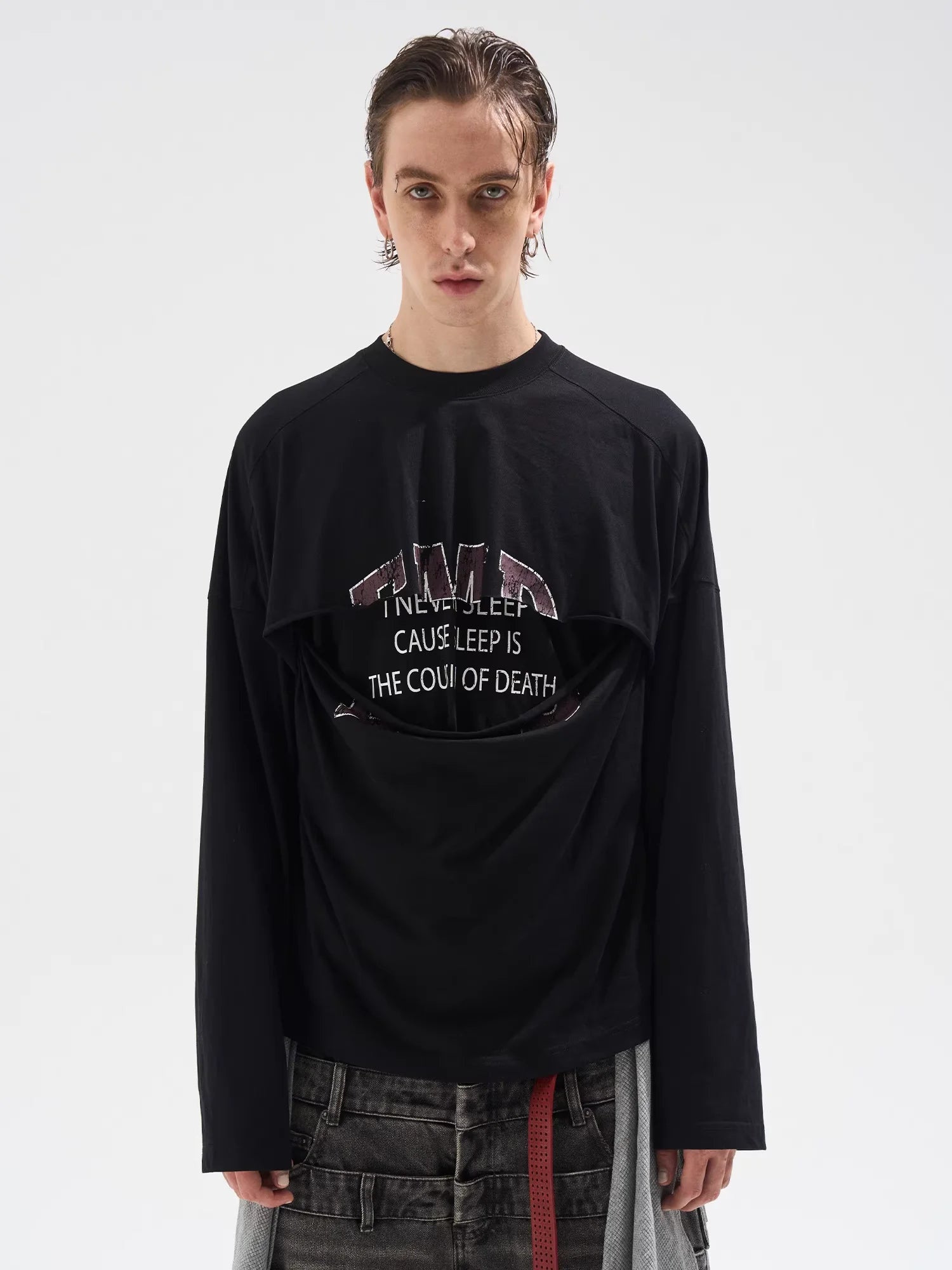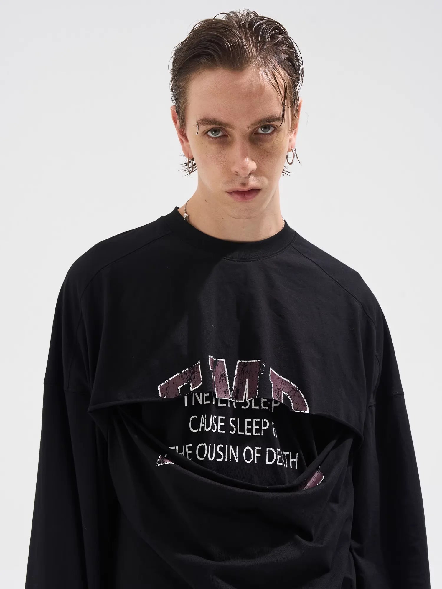 This black long sleeve T-shirt features a distinctive double-layered and deconstructed design, perfect for a bold streetwear aesthetic. A chest flap reveals partially obscured text that reads 'I NEVER SLEEP CAUSE SLEEP IS THE COUSIN OF DEATH,' while the top layer showcases distressed 'TMA' lettering in a bold, stylized font. With a relaxed fit and drop shoulders, this edgy piece is designed for men seeking a standout fashion statement.