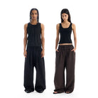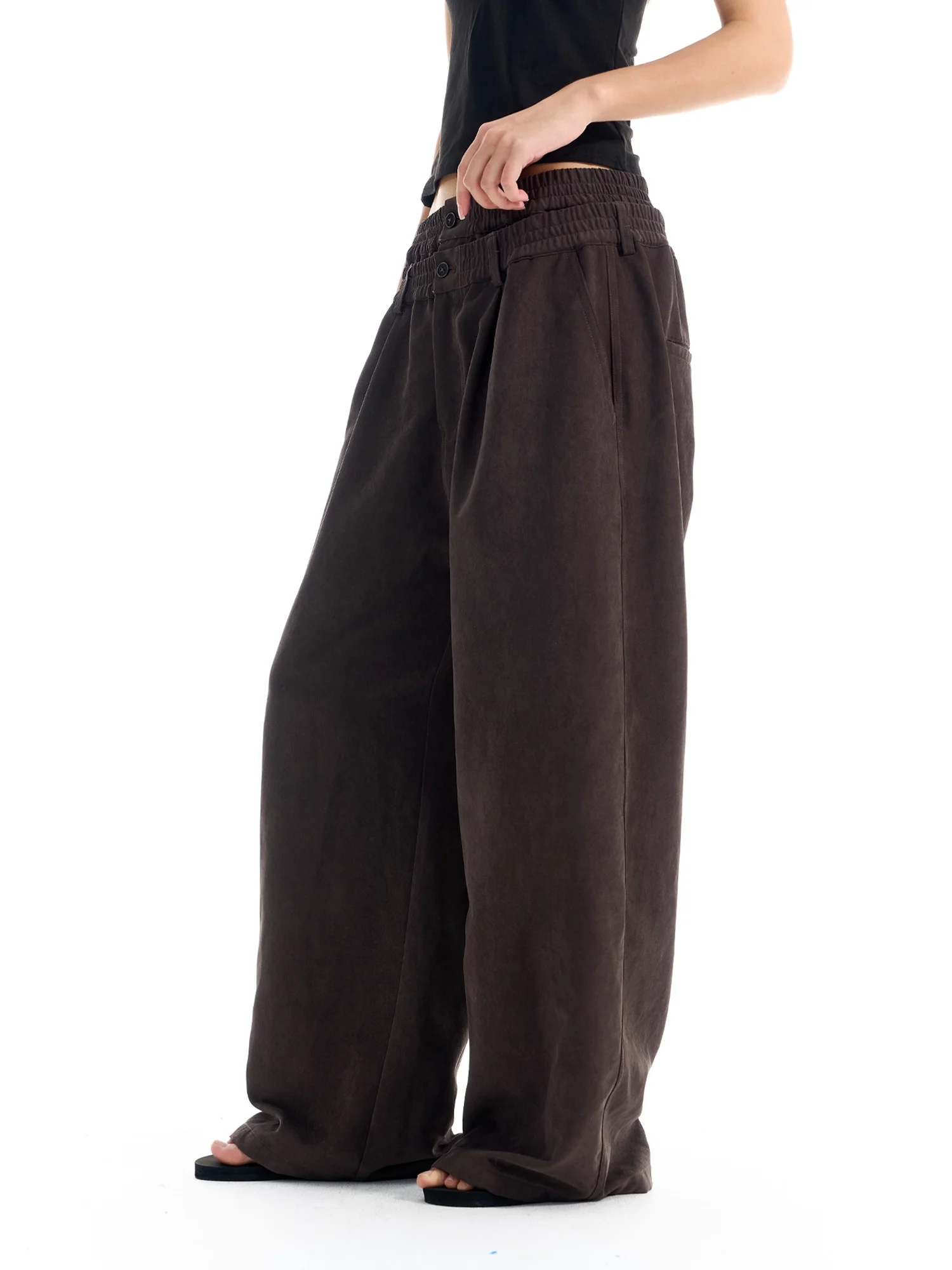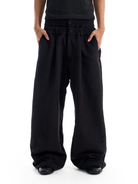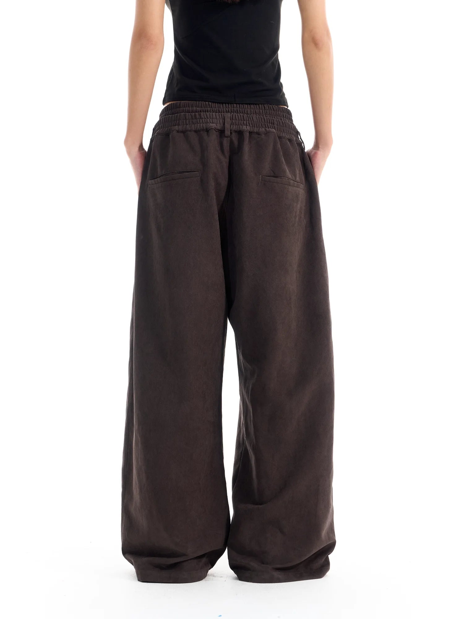 Elevate your streetwear style with these double waist pleated oversized straight pants. Featuring a high gathered waistband and relaxed silhouette, they offer a modern, androgynous look that prioritizes comfort without compromising on fashion. Worn here by both male and female models, these pants are designed with an extended length and textured fabric, making them a versatile choice for casual, fashion-forward ensembles.