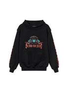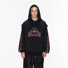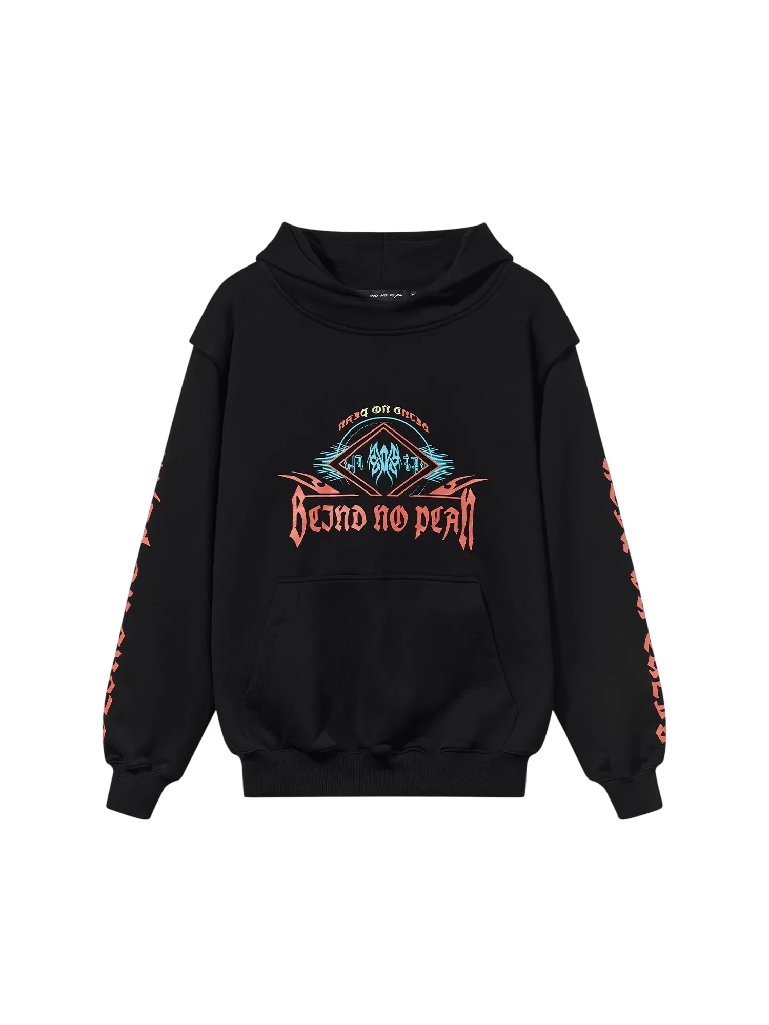 Elevate your fall wardrobe with this men's avant-garde hooded sweatshirt, featuring a unique fake two-piece design. The bold black hoodie showcases striking red text graphics reading 'BEND NO FEAR' across the chest and sleeves, adding a statement-making touch. Geometric front visuals and stylized text provide a modern, edgy aesthetic. Designed for comfort and style, this loose-fit garment pairs well with both casual and streetwear outfits, making it a versatile addition to your autumn rotation.