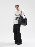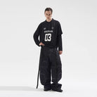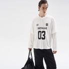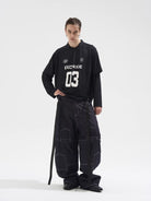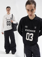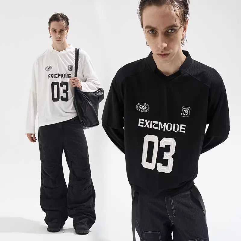 Elevate your streetwear game with this men's vintage-inspired long sleeve jersey T-shirt. Designed with a bold striped pattern and a unique fake two-piece look, this oversized shirt features standout elements including 'EXIZMODE' lettering and the number '03' prominently displayed on the front. Additional patch-style graphics add to its edgy, sporty aesthetic. Available in classic black and white color options, this shirt pairs effortlessly with cargo pants for a contemporary urban style.