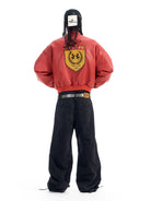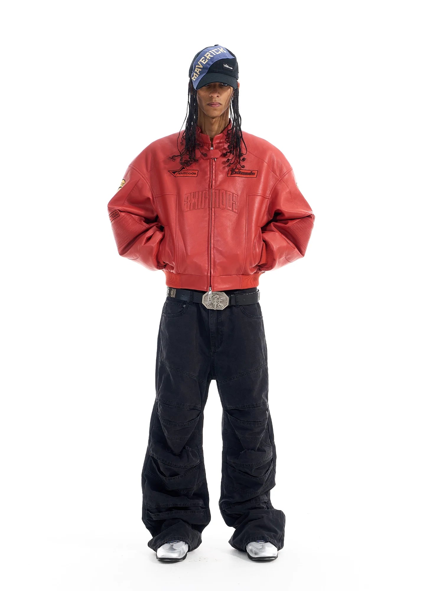 Make a bold statement with this men's oversized racing-inspired faux leather jacket. Crafted with a structured fit, it features wide sleeves, an elastic waistband, and heavy embroidered detailing that adds a touch of luxury and edge. The front zip closure and slightly glossy finish enhance its sporty aesthetic, while the embossed branding across the chest underscores its distinctive style. Perfect for streetwear enthusiasts seeking standout outerwear.