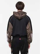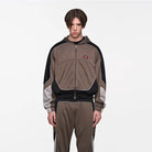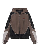 Elevate your casual wear with this retro-inspired colorblock sport jacket, featuring a 3D embroidered logo for added detail. Designed in a versatile brown palette with contrasting black and gray accents, this zip-up jacket offers a sporty yet stylish look. The high collar and white piping provide a structured silhouette, while the classic cut ensures comfortable wear. Perfect for athleisure style or laid-back outings, this men's jacket delivers both form and function.