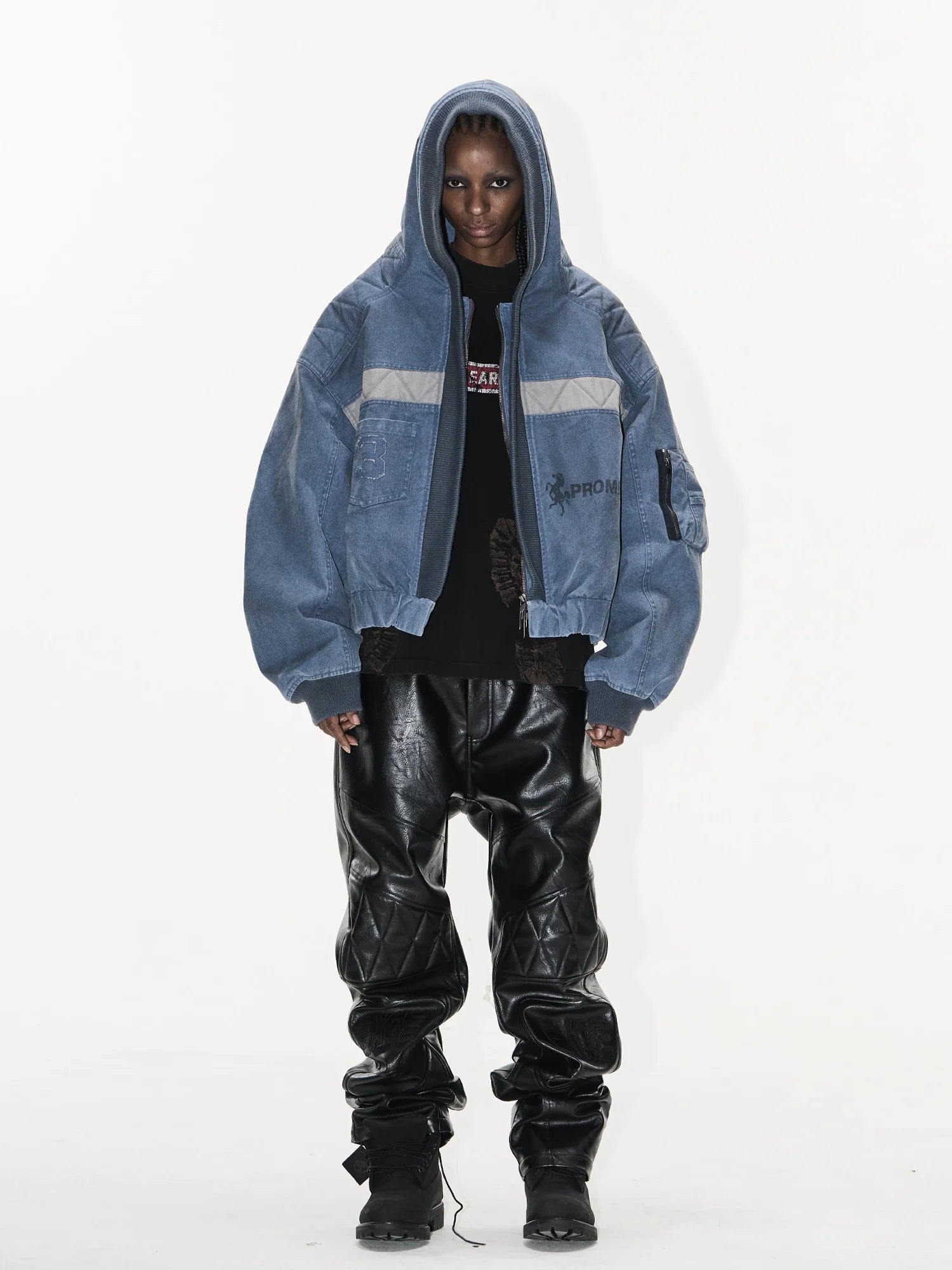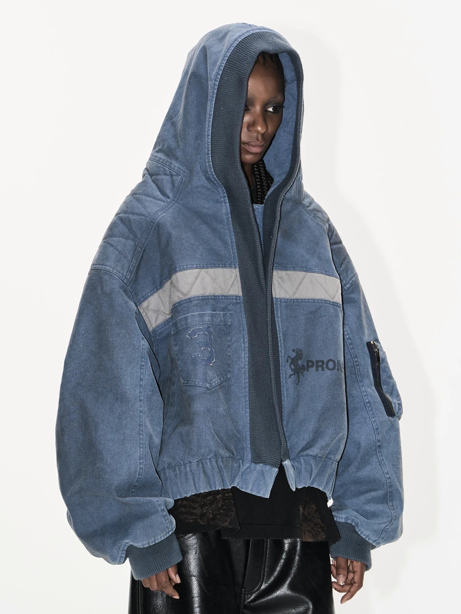 Light grey accents across the chest and sleeves add modern contrast, while subtle graphic elements including a stylized '3' and the word 'PROM' offer a unique edge. Styled here on a female model, it pairs effortlessly with edgy separates for an on-trend urban ensemble.