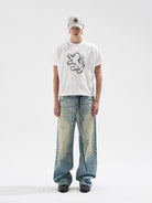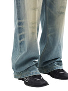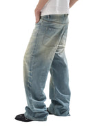 These men's wide-leg denim jeans feature a light blue whisker-washed finish with heavy fading and bleached detailing on the front thighs. Designed for a relaxed, street-ready look, the jeans offer a loose, oversized fit that extends past the shoes. Subtle whiskering, distressed patches, and classic five-pocket styling complete the contemporary design.