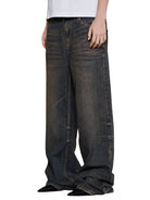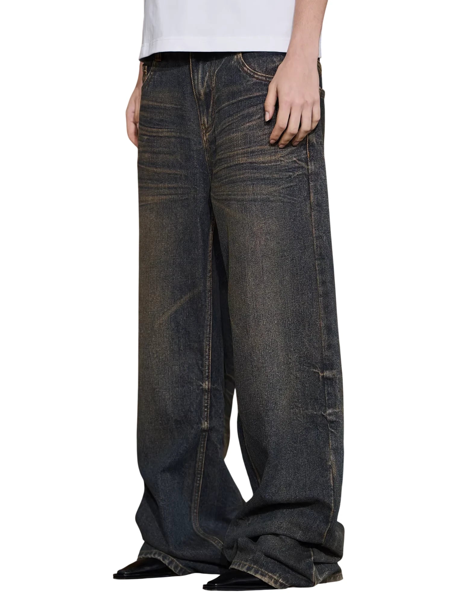 These men's wide-leg jeans feature a yellow mud-dyed finish with a vintage distressed style. Designed with 3D pleating and a straight loose fit, they offer a relaxed silhouette perfect for streetwear fashion. The high-rise waist and traditional five-pocket construction provide classic denim detailing, while whiskering and fading add a worn-in, retro vibe. Ideal for casual and urban looks.
