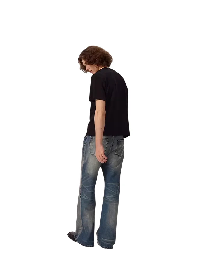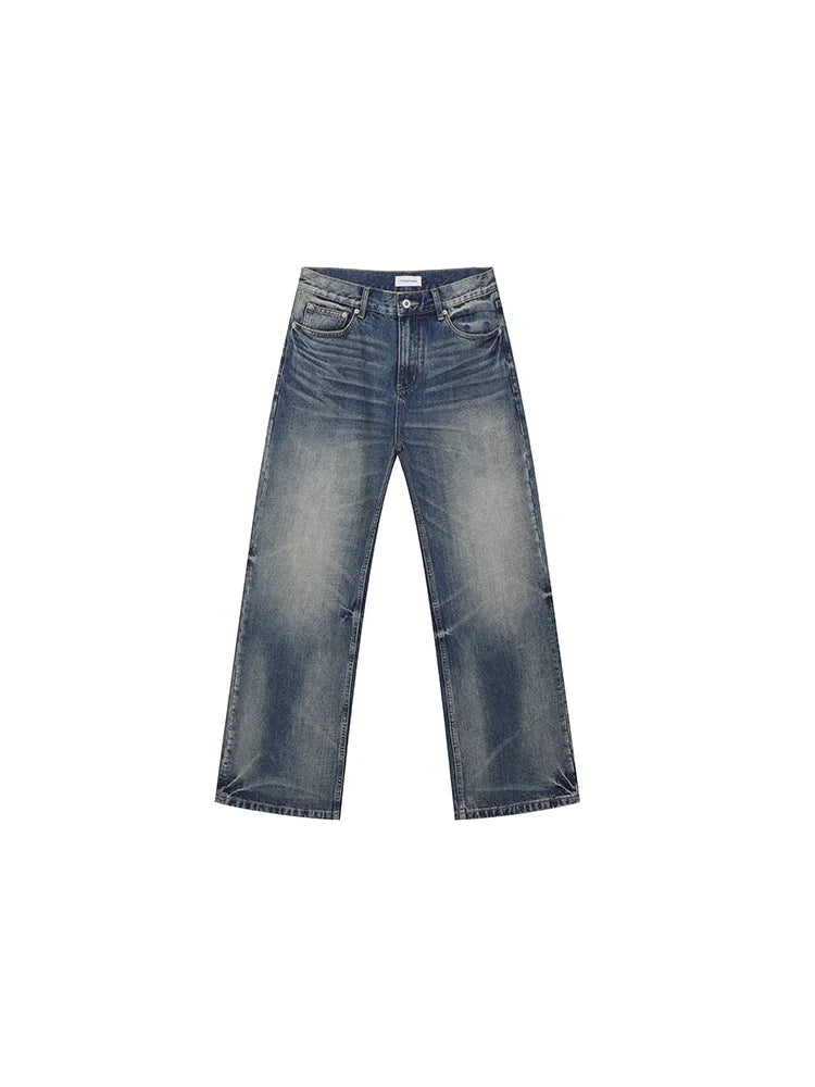 These men's vintage straight-leg jeans feature a washed blue finish and a distressed design around the knees for a worn-in, authentic look. The wide-leg cut offers a relaxed fit for everyday comfort and effortless casual style. Perfectly paired with oversized tops and sneakers, these jeans add a rugged edge to any modern wardrobe.