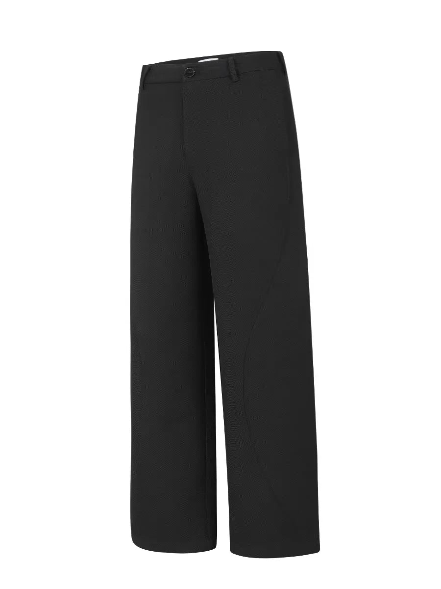 Designed for the modern woman, these black wide-leg trousers feature a sculpted A-line silhouette with a high-waisted fit. Crafted from a structured fabric, they offer a polished drape that flares from the hip for ease and elegance. Complete with belt loops, a front button closure, and zipper fly, these trousers transition effortlessly from casual to semi-formal settings.
