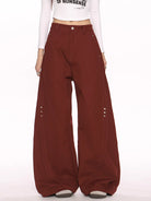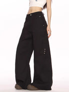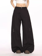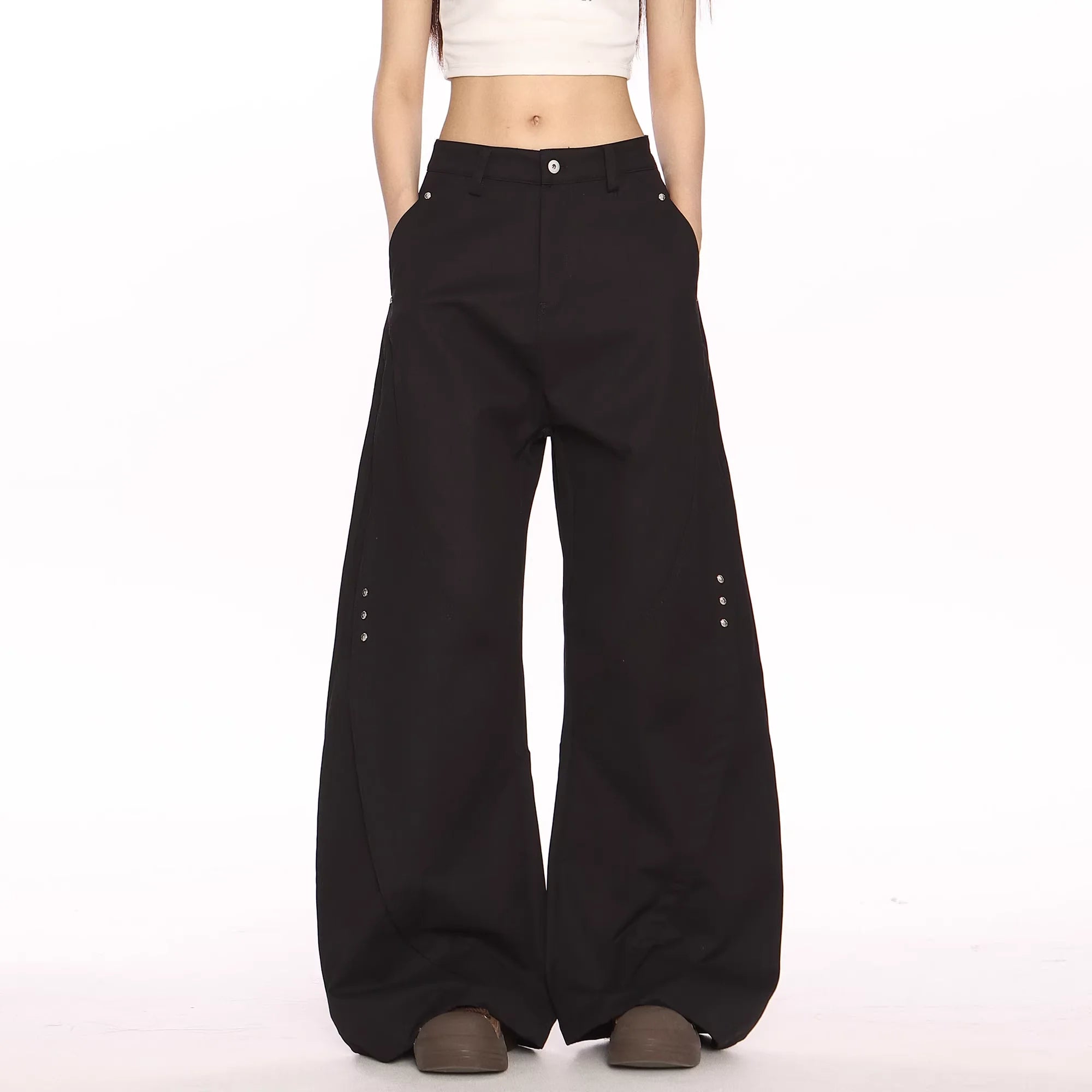 Elevate your wardrobe with these high-waisted black trousers, designed for women who appreciate both style and comfort. Featuring a modern wide-leg silhouette and distinctive curved-leg construction, these floor-length pants are crafted from durable fabric for a structured look. Functional elements include belt loops, side pockets, and a secure front button and zip closure. Subtle metal rivet embellishments on the outer thighs add a unique and edgy touch to the minimalist design, making these trousers a versatile choice for casual or upscale looks.