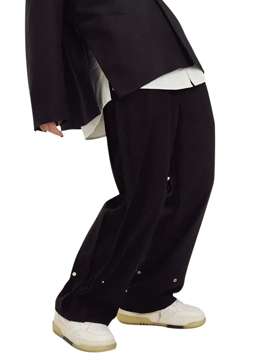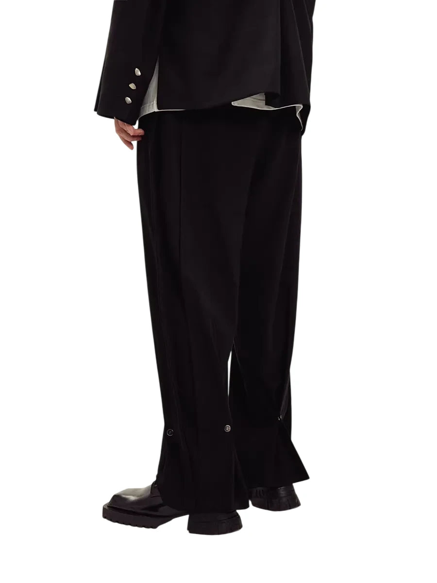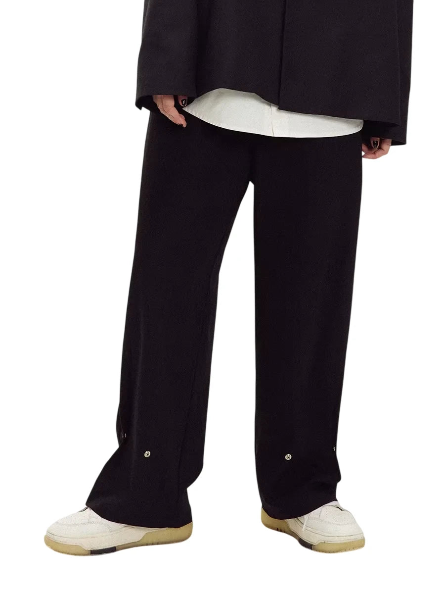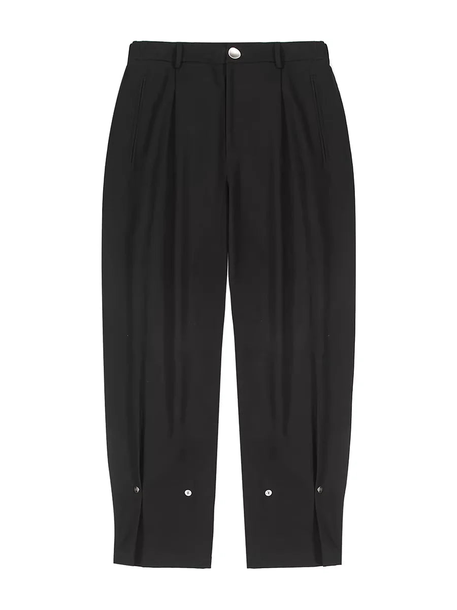Designed for a modern, relaxed fit, these men's straight-leg trousers feature a convertible style with subtle buttoned cuffs near the ankles. Crafted from a soft, draping fabric, they offer both comfort and a refined silhouette ideal for casual or semi-formal settings. The minimalist design is complemented by a chic, layered look when paired with a blazer, making them a versatile addition to your wardrobe.