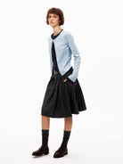 This women's vintage-style skirt features a high-waisted design with a refined herringbone wool fabric, offering both comfort and a structured silhouette. The pleated construction adds dynamic flair, while the irregular hemline adds a modern twist to its classic inspiration. The dark gray hue makes it a versatile piece suitable for both work and casual settings. Perfectly paired with a fitted top and statement belt, this skirt brings elegance and sophistication to any wardrobe.